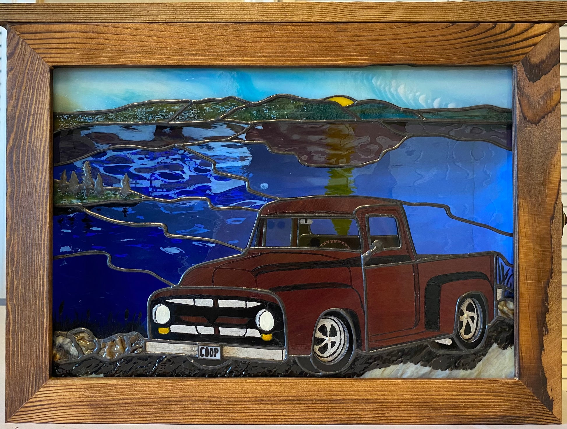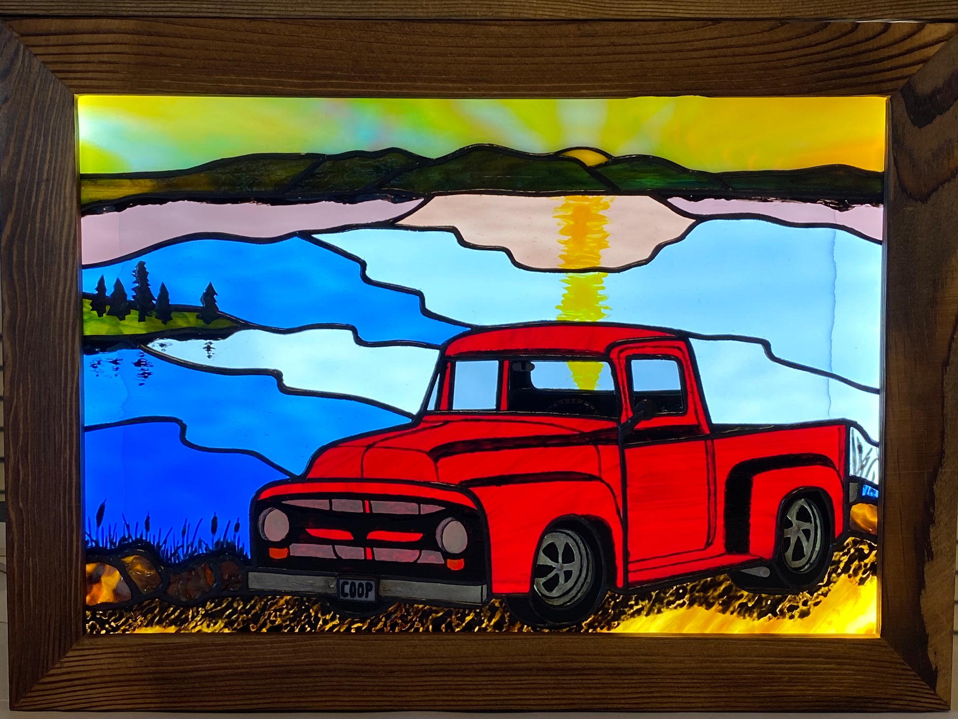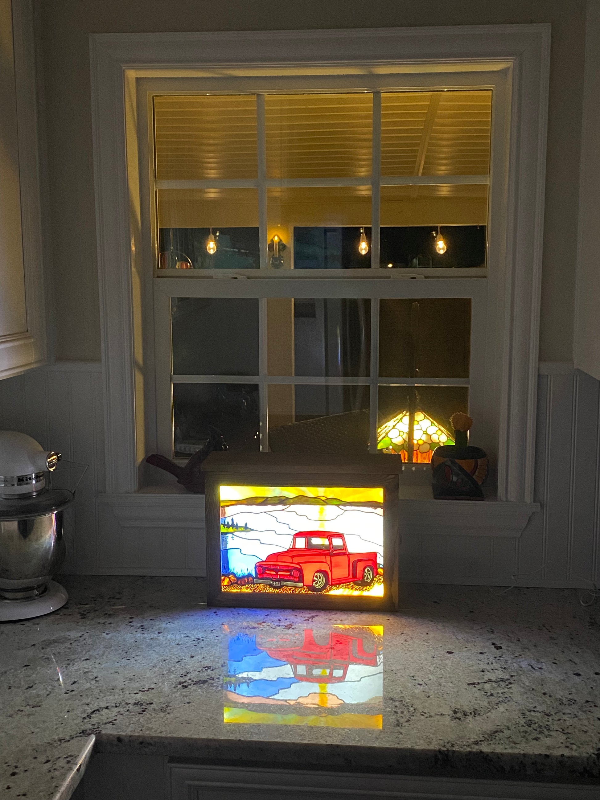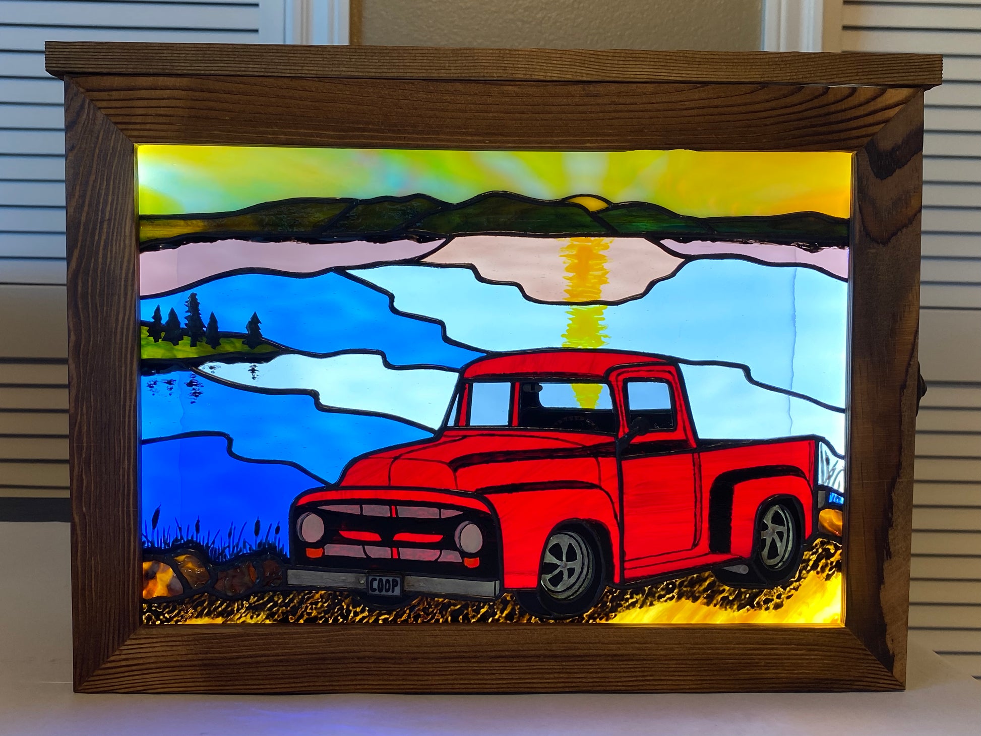 The details on this very custom light box were accomplished with not only painting for truck details, shadows, water grass, and reflections in the water, but also with plating, a Tiffany method of using more than one piece of glass behind another for the purpose of adding color, texture, or depth to an area of the piece. The sun's rays are made by plating some yellow water glass behind the single piece sky, and the interior of the truck is positioned behind the smoked glass windows for depth and additional detail. The wheel rims are also inset behind the outside glass that makes up the tires. Foil overlay is used for some of the details such as the trees on the land and the rearview and side mirrors on the truck. Finished size is 9" x 13" not including the light box. The light box has string lights installed around the inside edge and comes with a remote control to turn the lights on/off, dim, or set on a timer. There is some white foam board placed inside on the back, sides, and top for better reflection for the colored water glass, but can be easily removed if a darker setting is preferred. This can be customized with a different truck, different color, or can be made without the light box for a hanging panel of the same or different size.