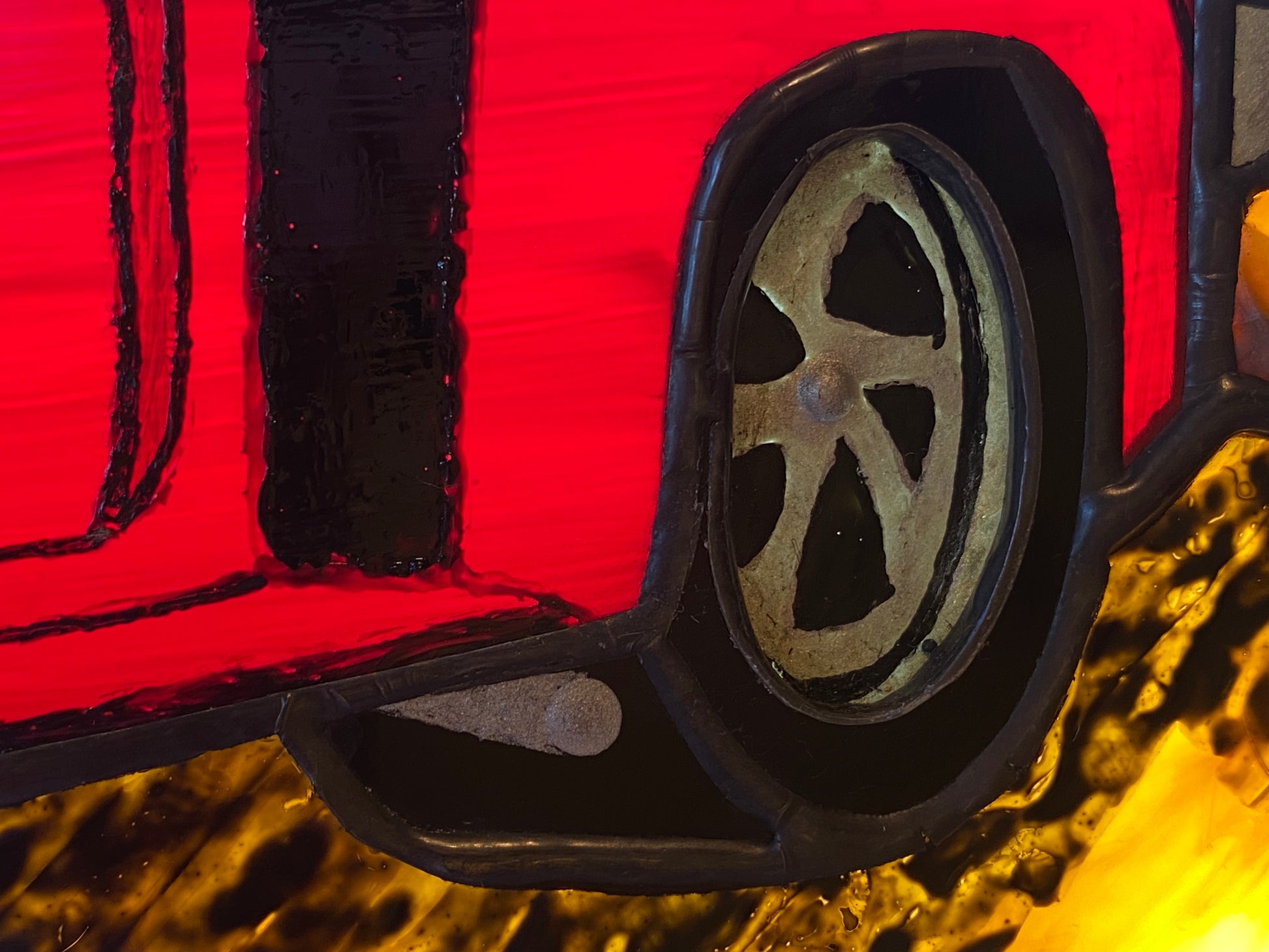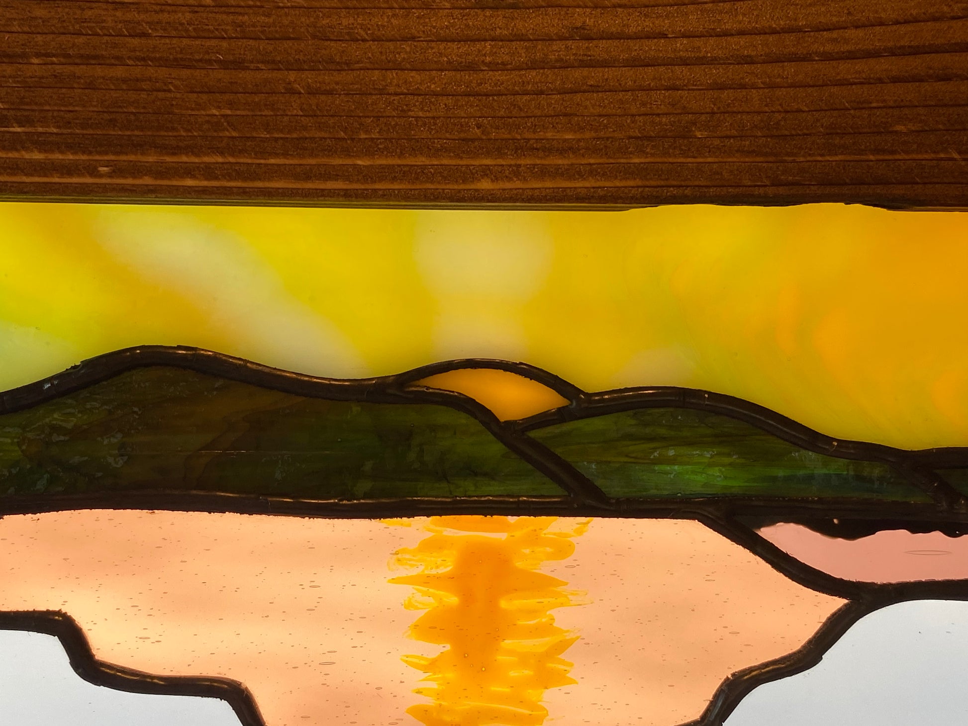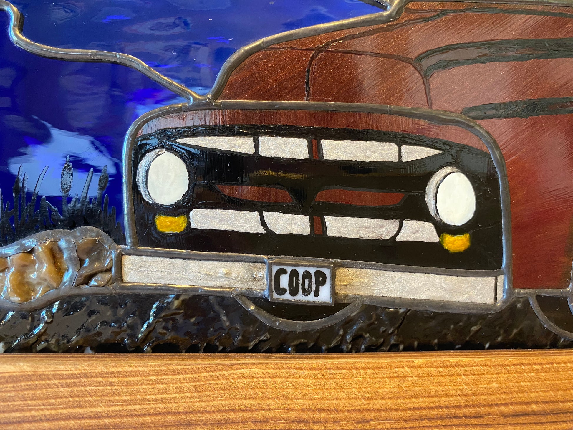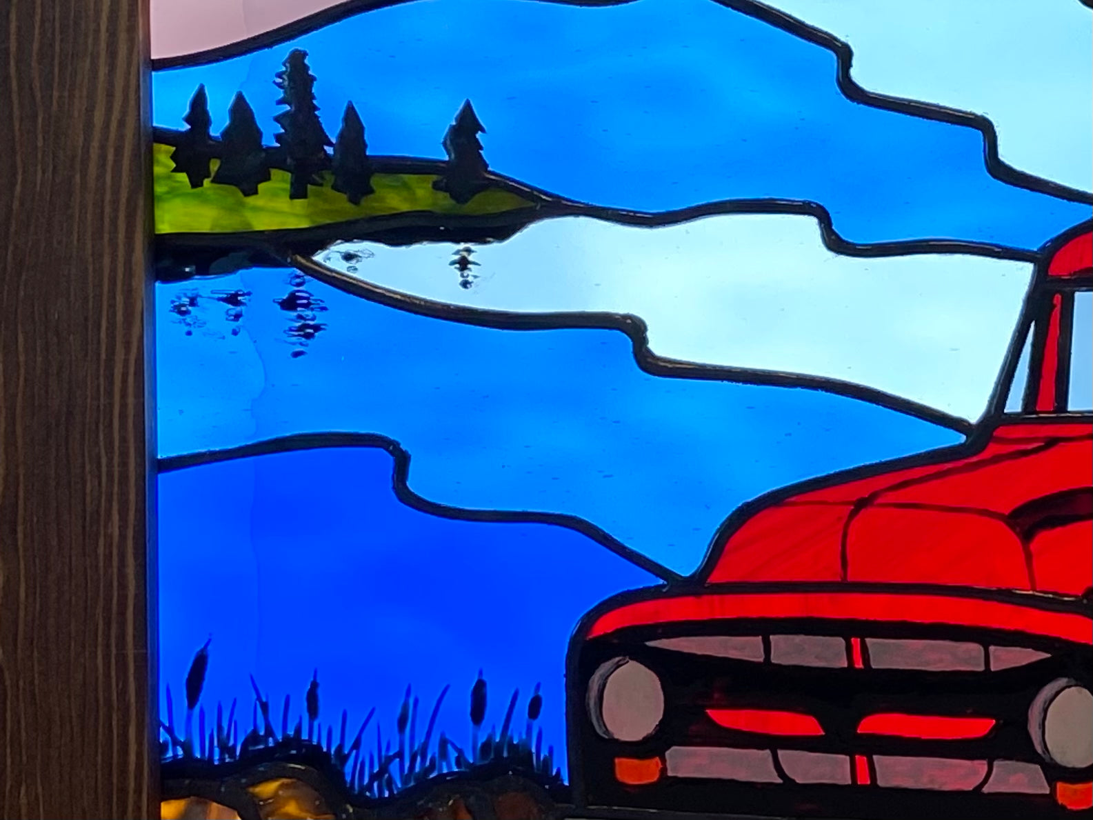 The details on this very custom light box were accomplished with not only painting for truck details, shadows, water grass, and reflections in the water, but also with plating, a Tiffany method of using more than one piece of glass behind another for the purpose of adding color, texture, or depth to an area of the piece. The sun's rays are made by plating some yellow water glass behind the single piece sky, and the interior of the truck is positioned behind the smoked glass windows for depth and additional detail. The wheel rims are also inset behind the outside glass that makes up the tires. Foil overlay is used for some of the details such as the trees on the land and the rearview and side mirrors on the truck. Finished size is 9" x 13" not including the light box. The light box has string lights installed around the inside edge and comes with a remote control to turn the lights on/off, dim, or set on a timer. There is some white foam board placed inside on the back, sides, and top for better reflection for the colored water glass, but can be easily removed if a darker setting is preferred. This can be customized with a different truck, different color, or can be made without the light box for a hanging panel of the same or different size.