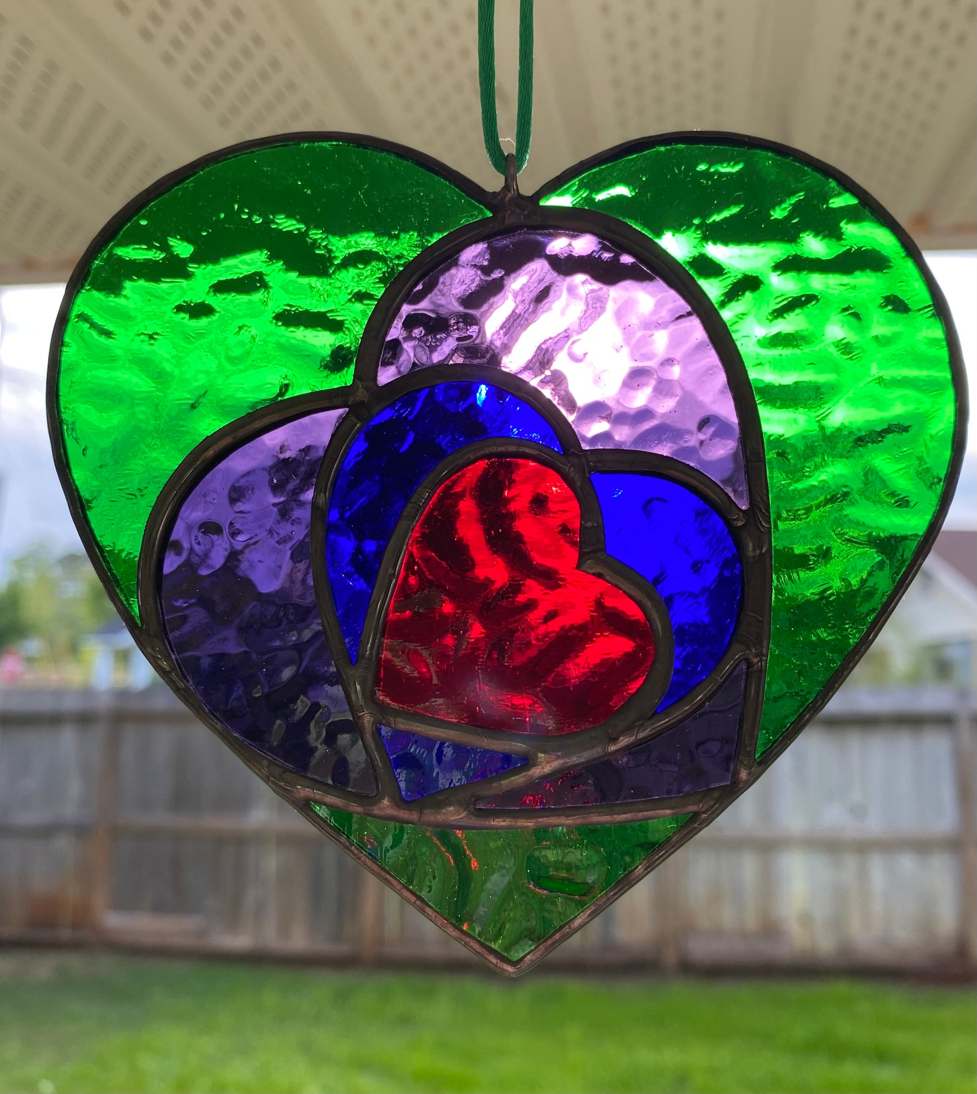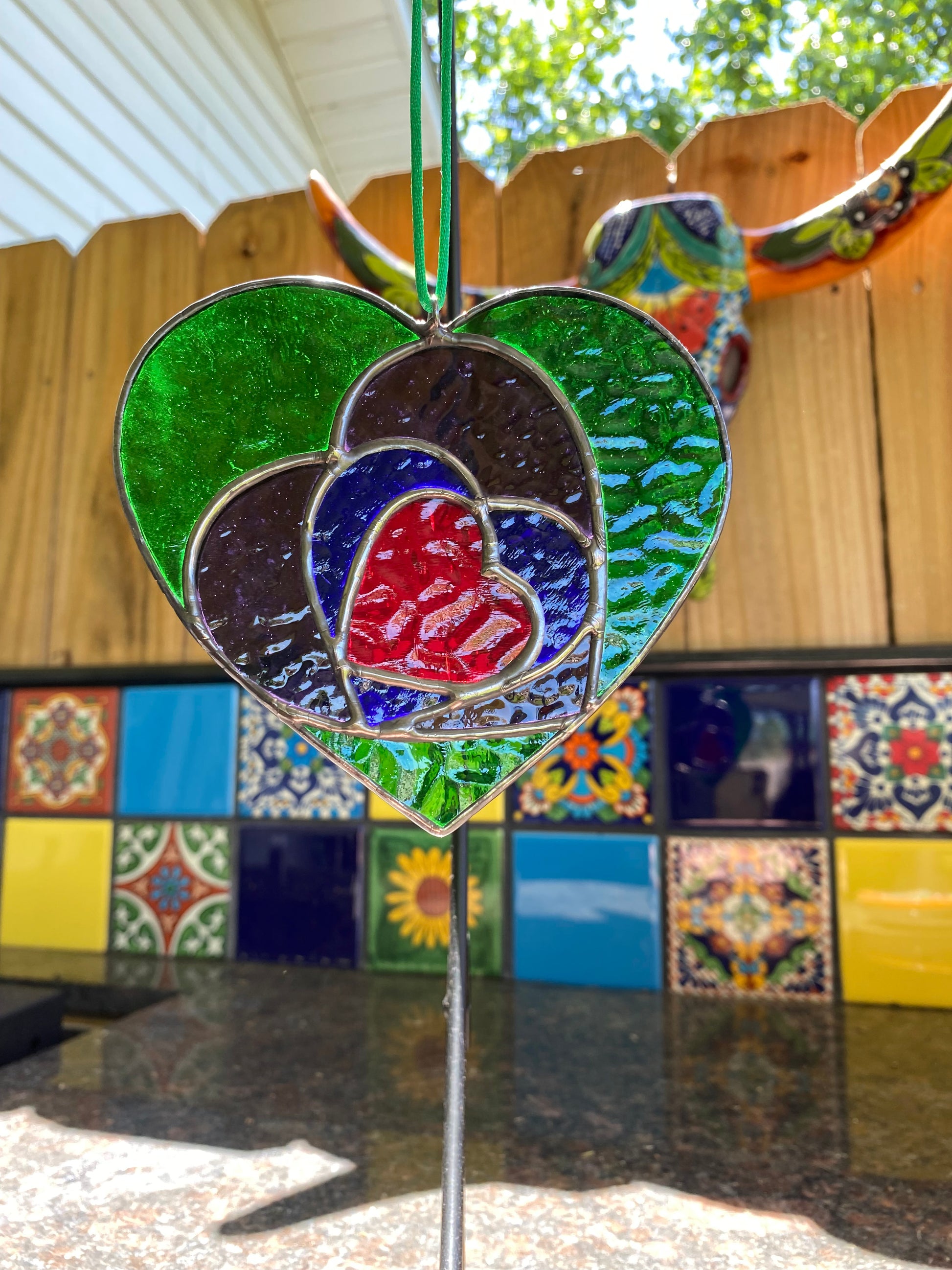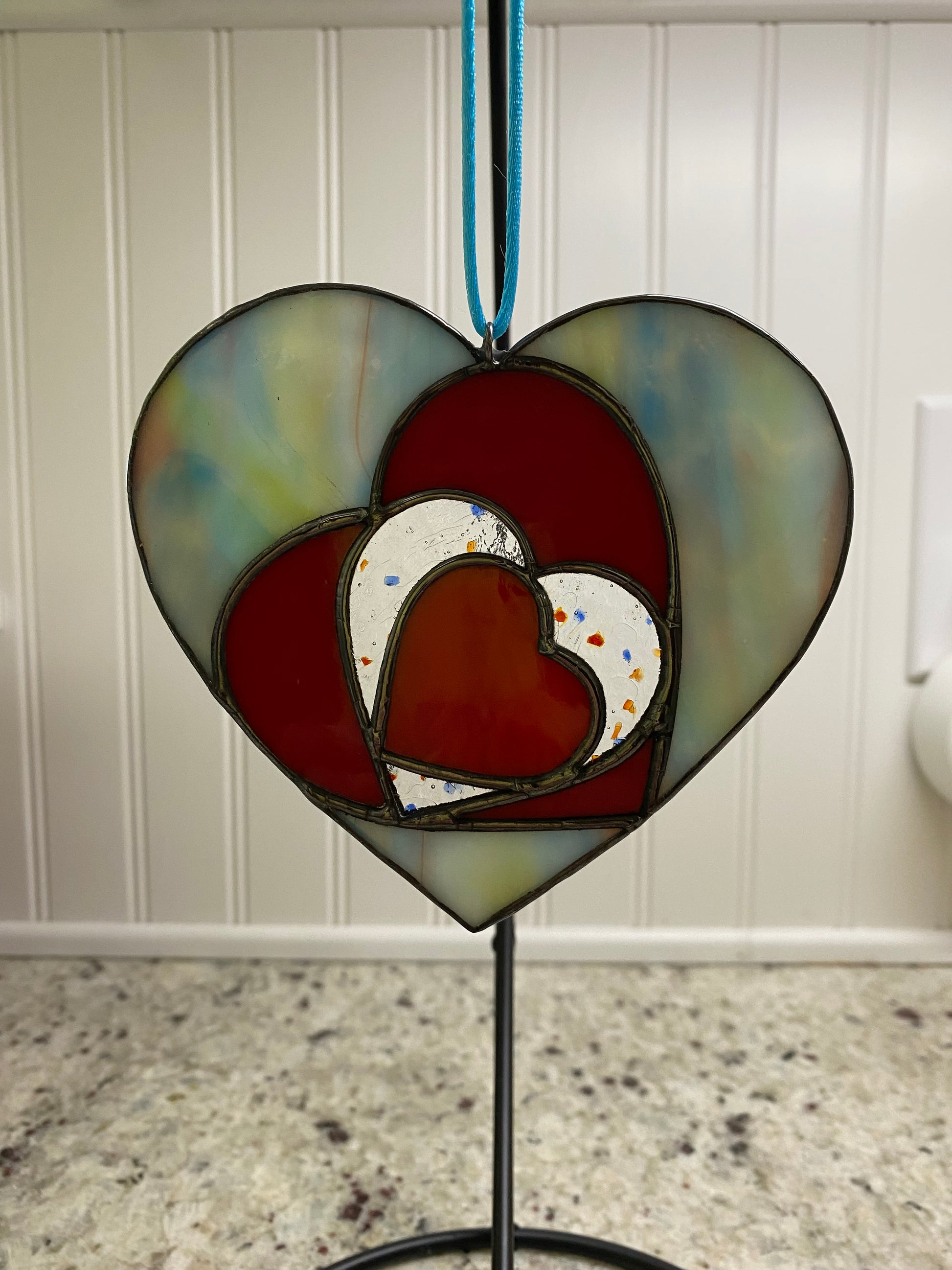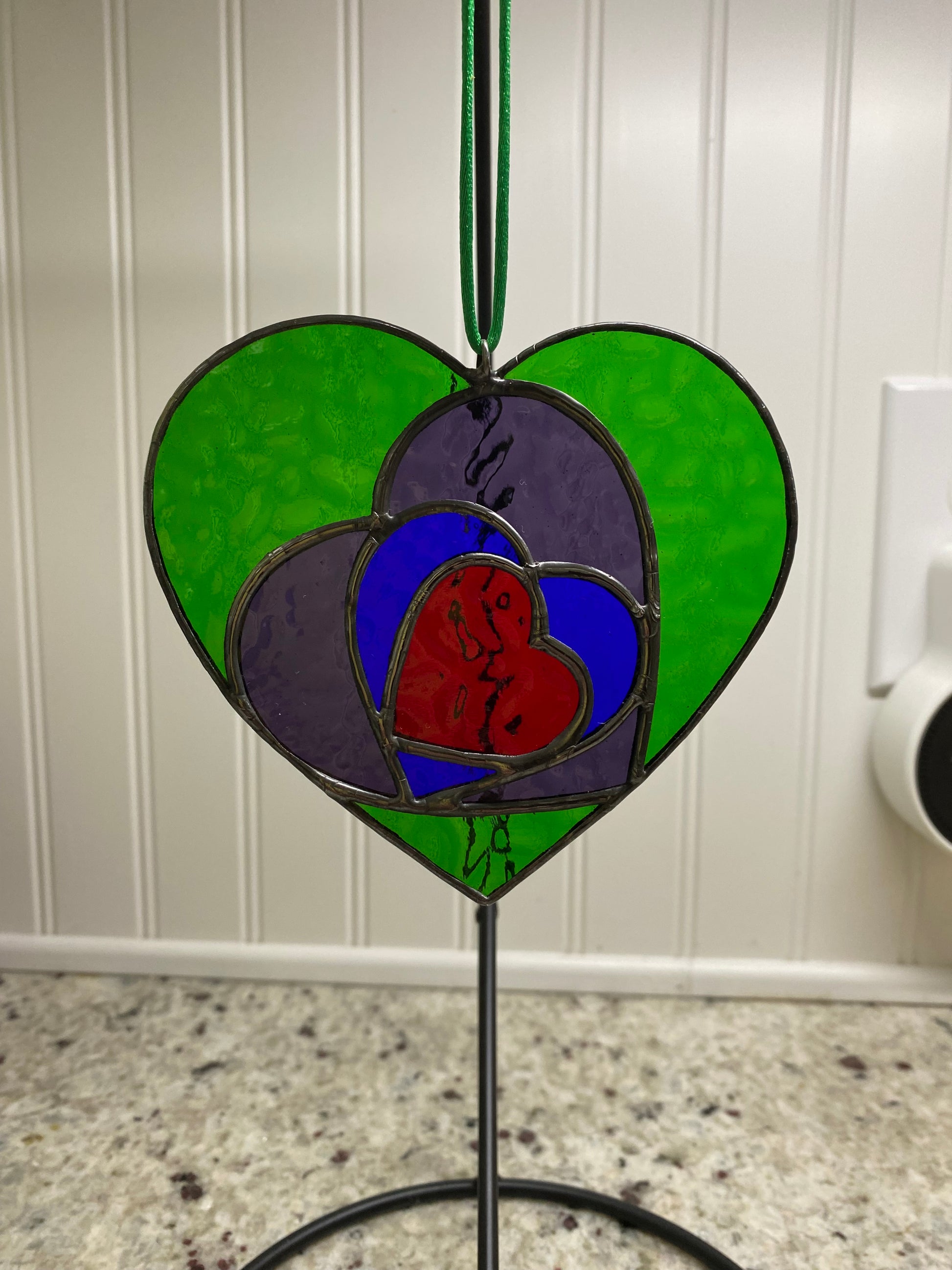 The second heart is crafted solely from Wissmach's English muffle glass. Its red center symbolizes the Holy Spirit, while the blue represents the believer. The purple, symbolic of royalty, represents King Jesus, and the green, symbolizing life, represents God the Father.