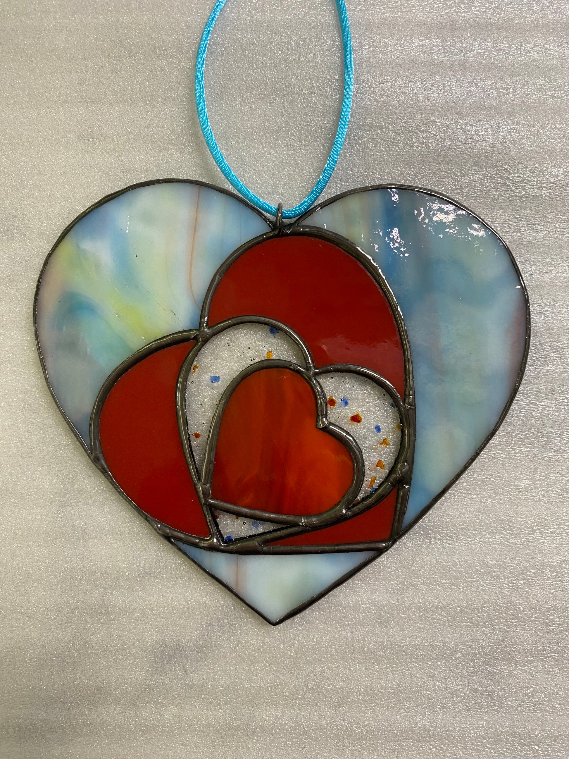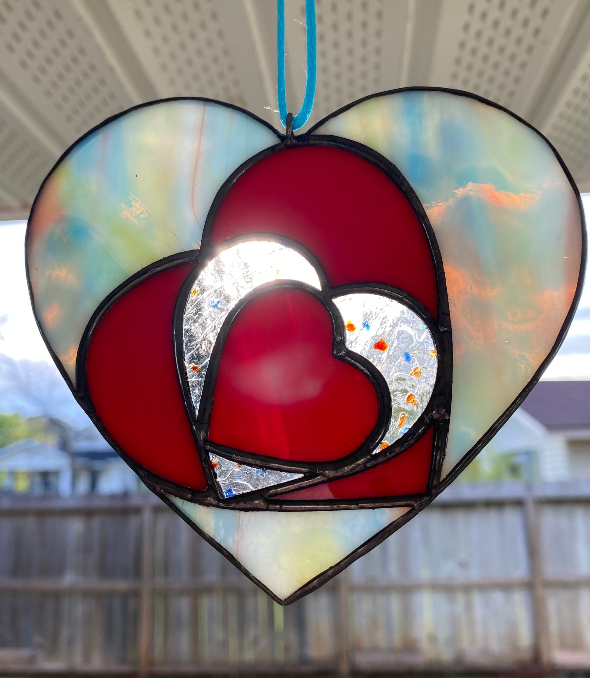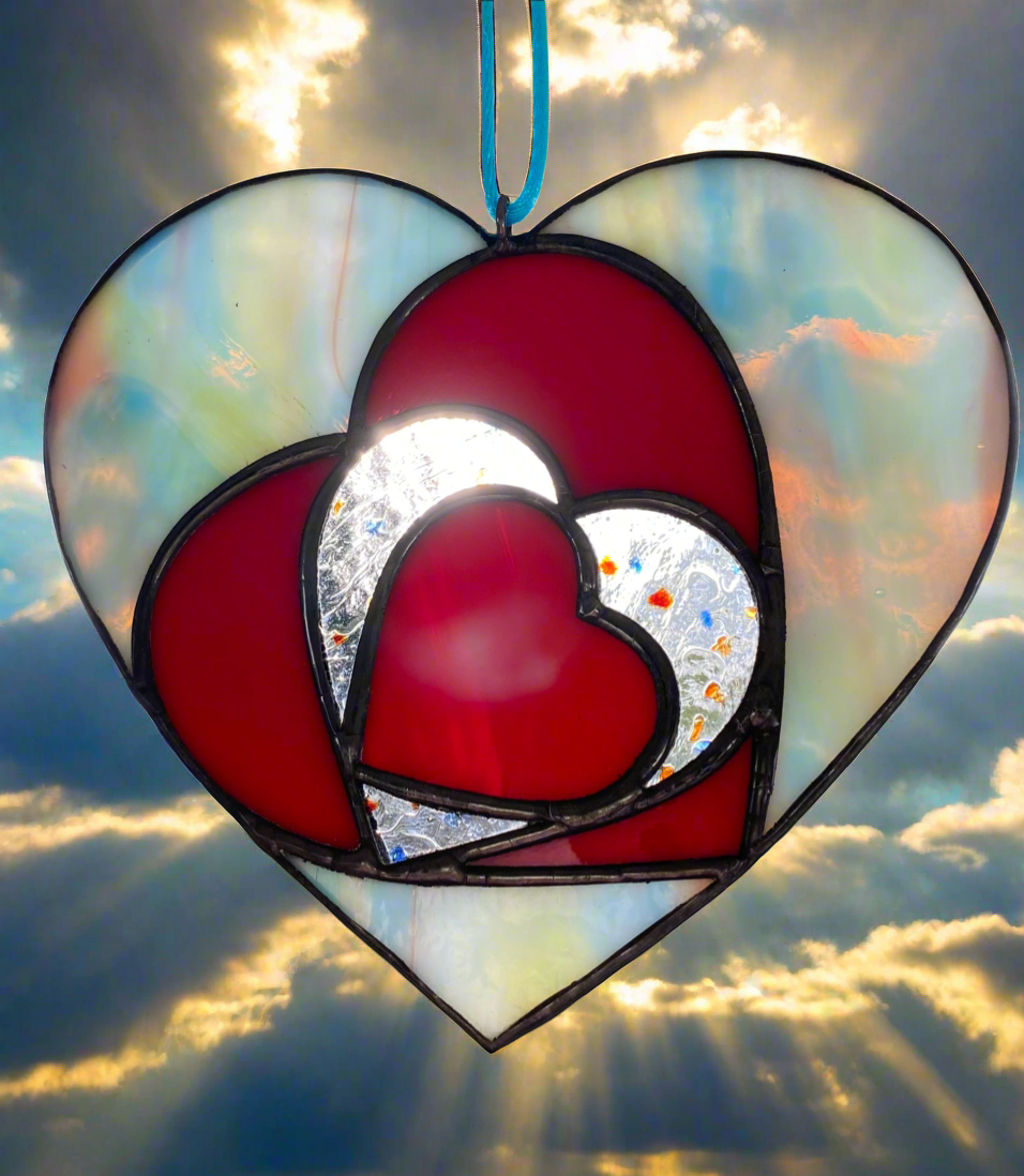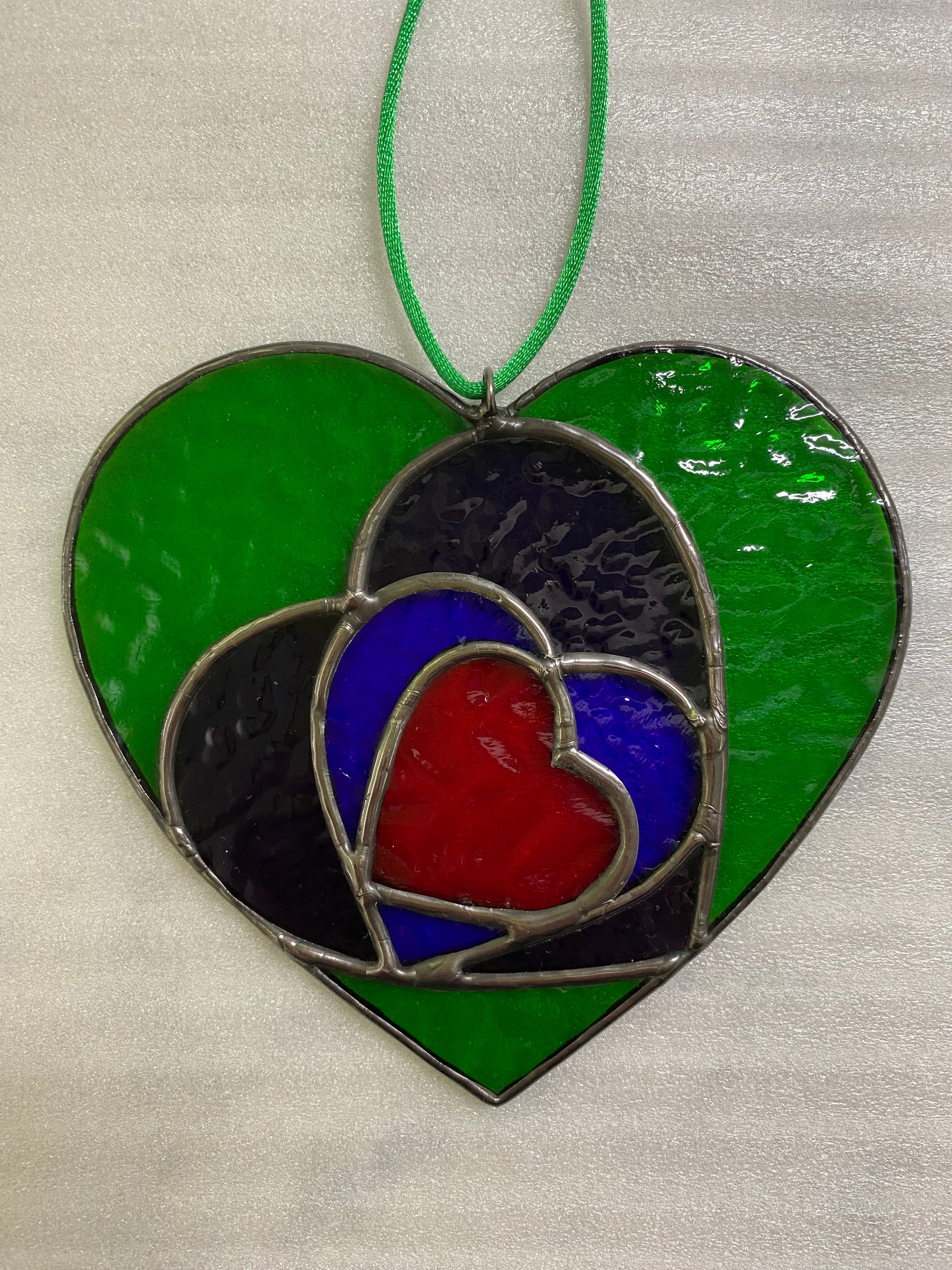 The second heart is crafted solely from Wissmach's English muffle glass. Its red center symbolizes the Holy Spirit, while the blue represents the believer. The purple, symbolic of royalty, represents King Jesus, and the green, symbolizing life, represents God the Father.