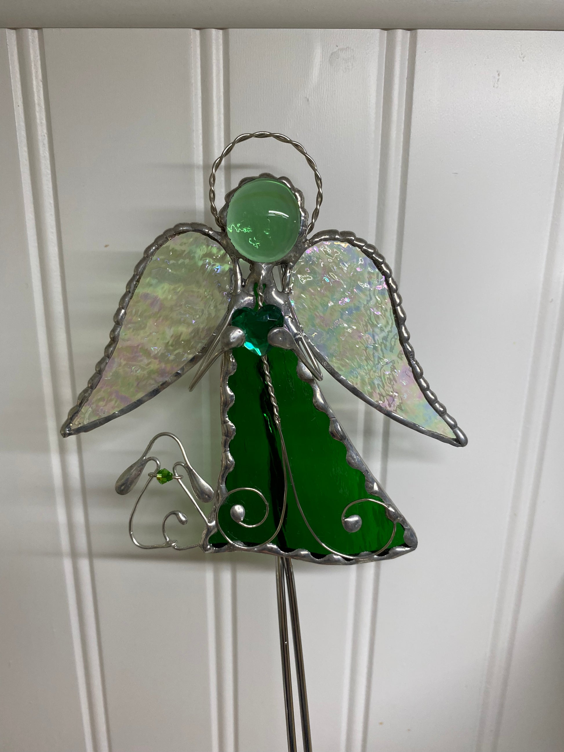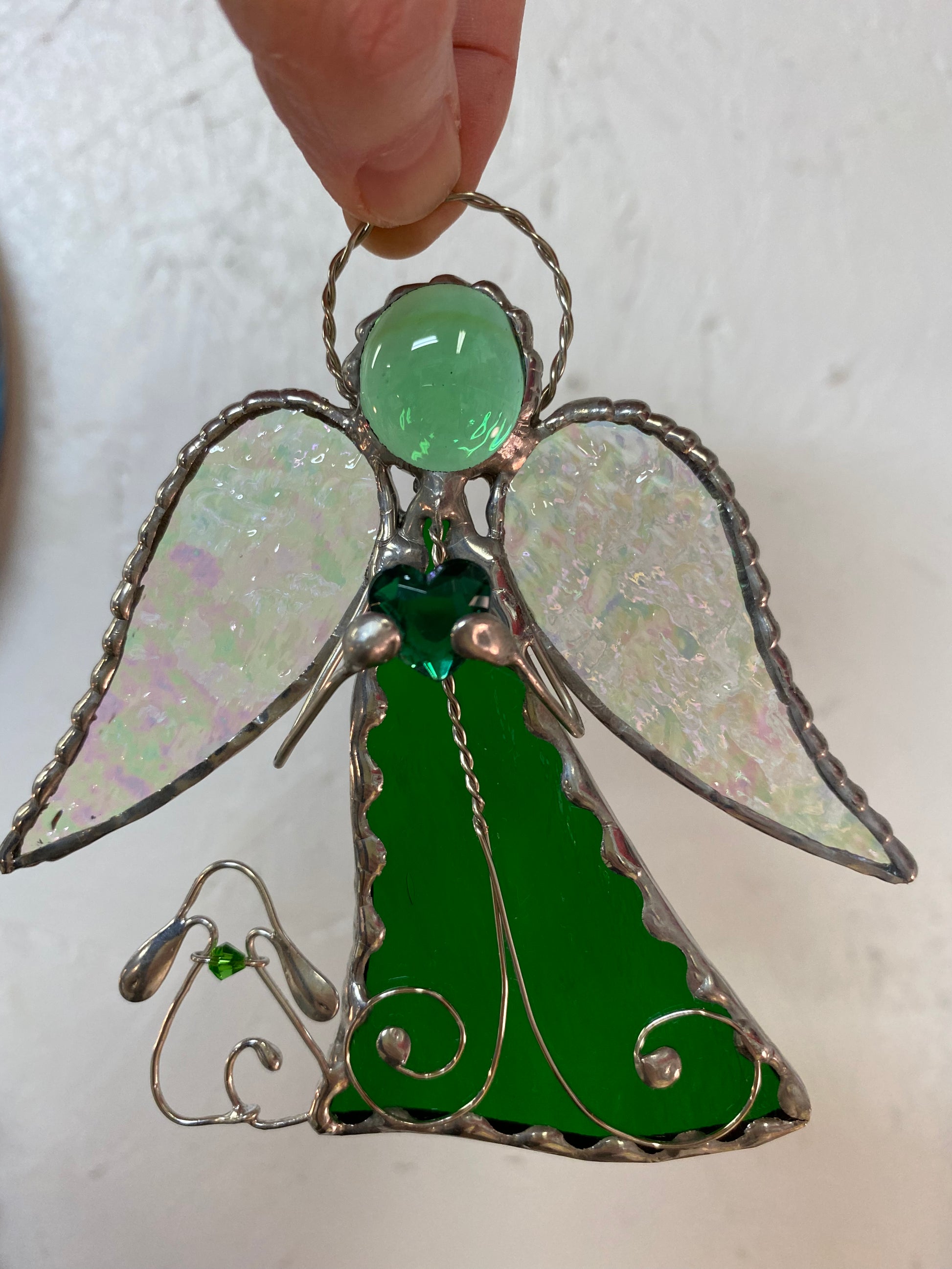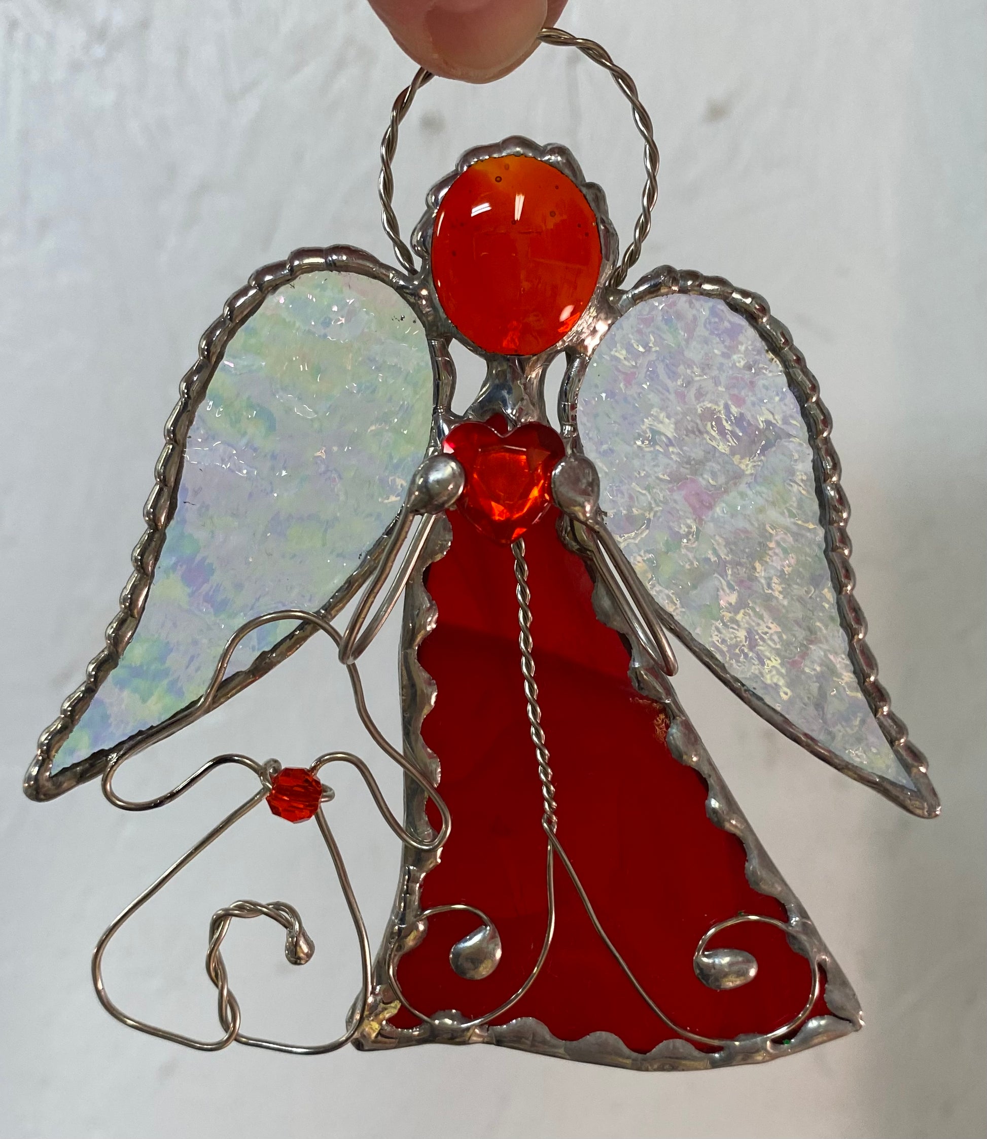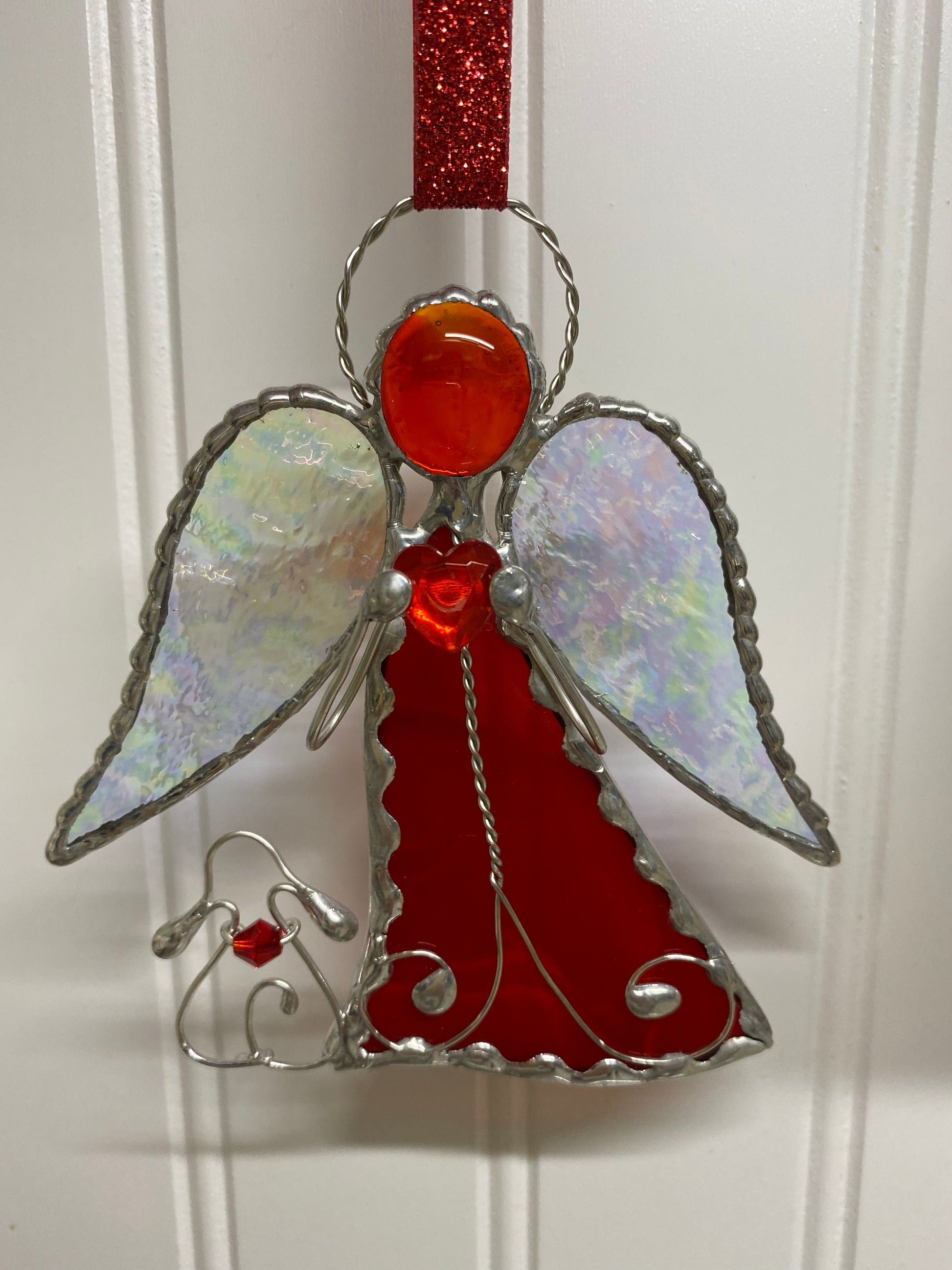 Each angel ornament is made with pieces of clear iridized glass for the wings, a 3/4” glass nugget for the head, and a single piece of glass (your choice of color from stock) for the body. Constructed using Tiffany’s foil method, a scalloped foil is used on the body for additional embellishment. Most of the angels remain with polished silver solder, but patina can be applied for a copper or black outline. Decorative solder techniques are used to create the hair and to embellish the wings. 14 gauge pre-tinned copper wire is used for the arms, and the tiny hands hold between them an acrylic colored heart. Finally, 16 gauge wire is used to create the halo and to embellish the robe. There is a variety of colored ribbon and string available to choose from for hanging your angel. This particular angel features a dog crafted form a single piece of 14 gauge wire, with a smaller wire affixed around the pup’s neck with a tiny bead for a collar. A piece of thicker wire can be applied to make the angel a garden stake rather than a hanging ornament or sun catcher.