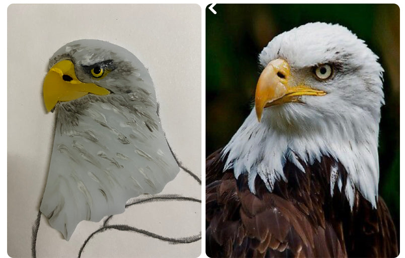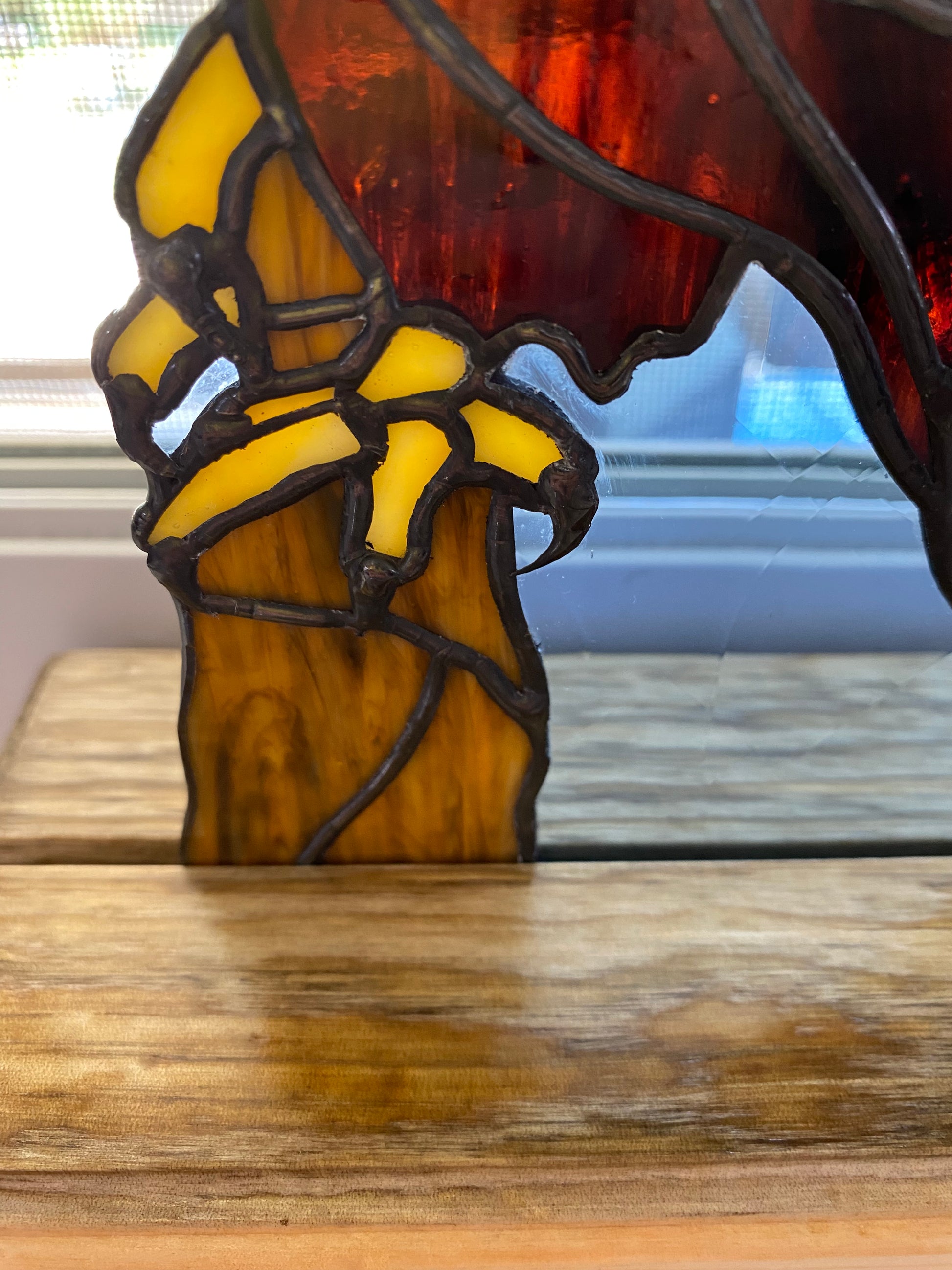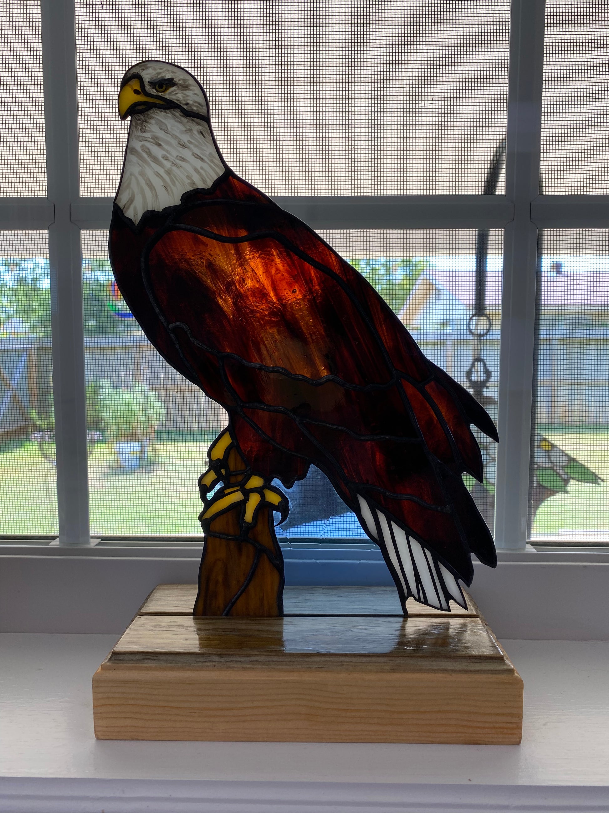 This bald eagle (finished size approx. 7"x 11") features hand-painted details using Pebeo 160 glass paint, heat treated for permanence. The brown glass is a Spectrum brown and tan wispy glass, and the claws are created using a foil overlay. He comes with the hand-made base to hold him steady on any flat surface.