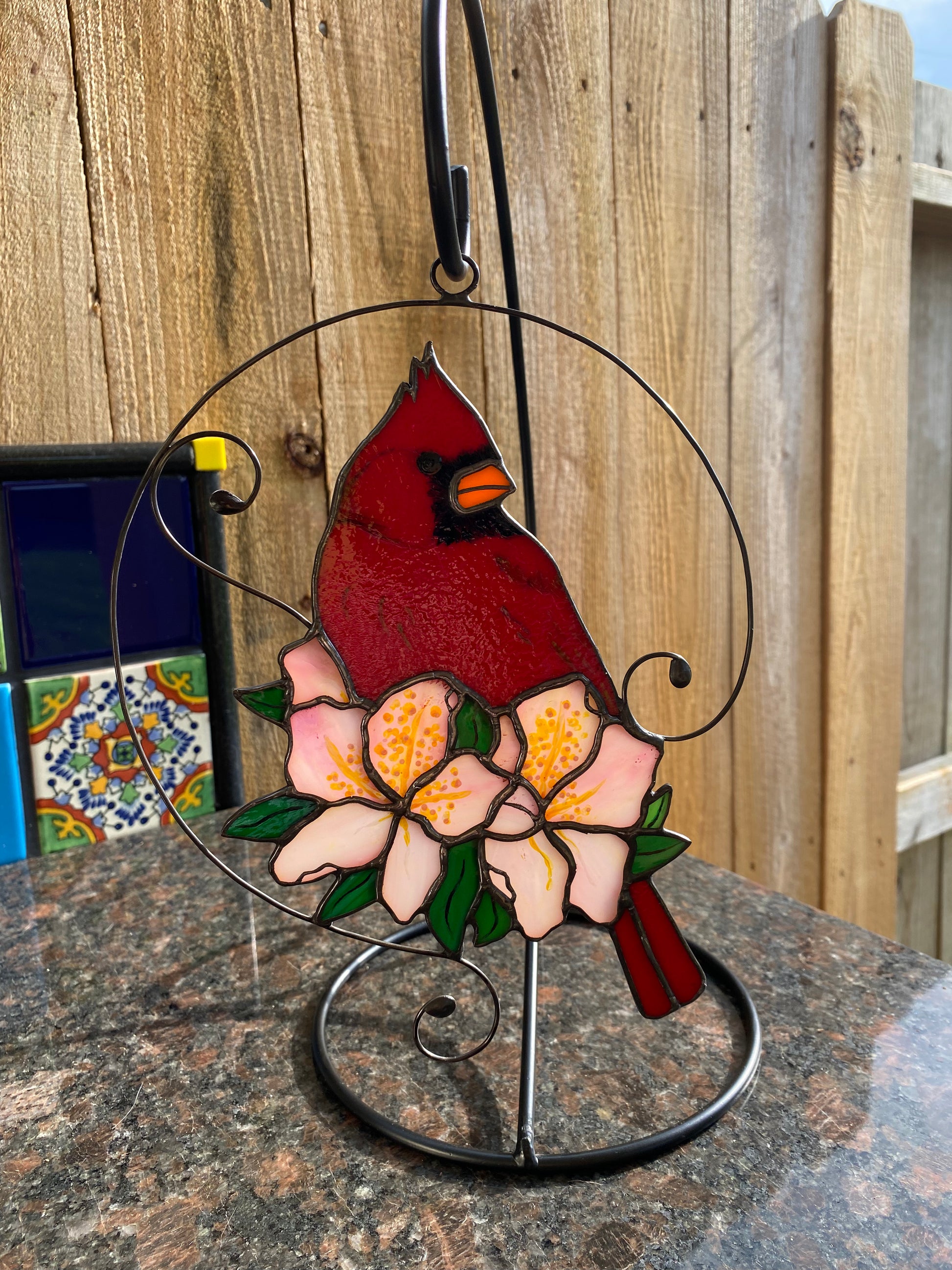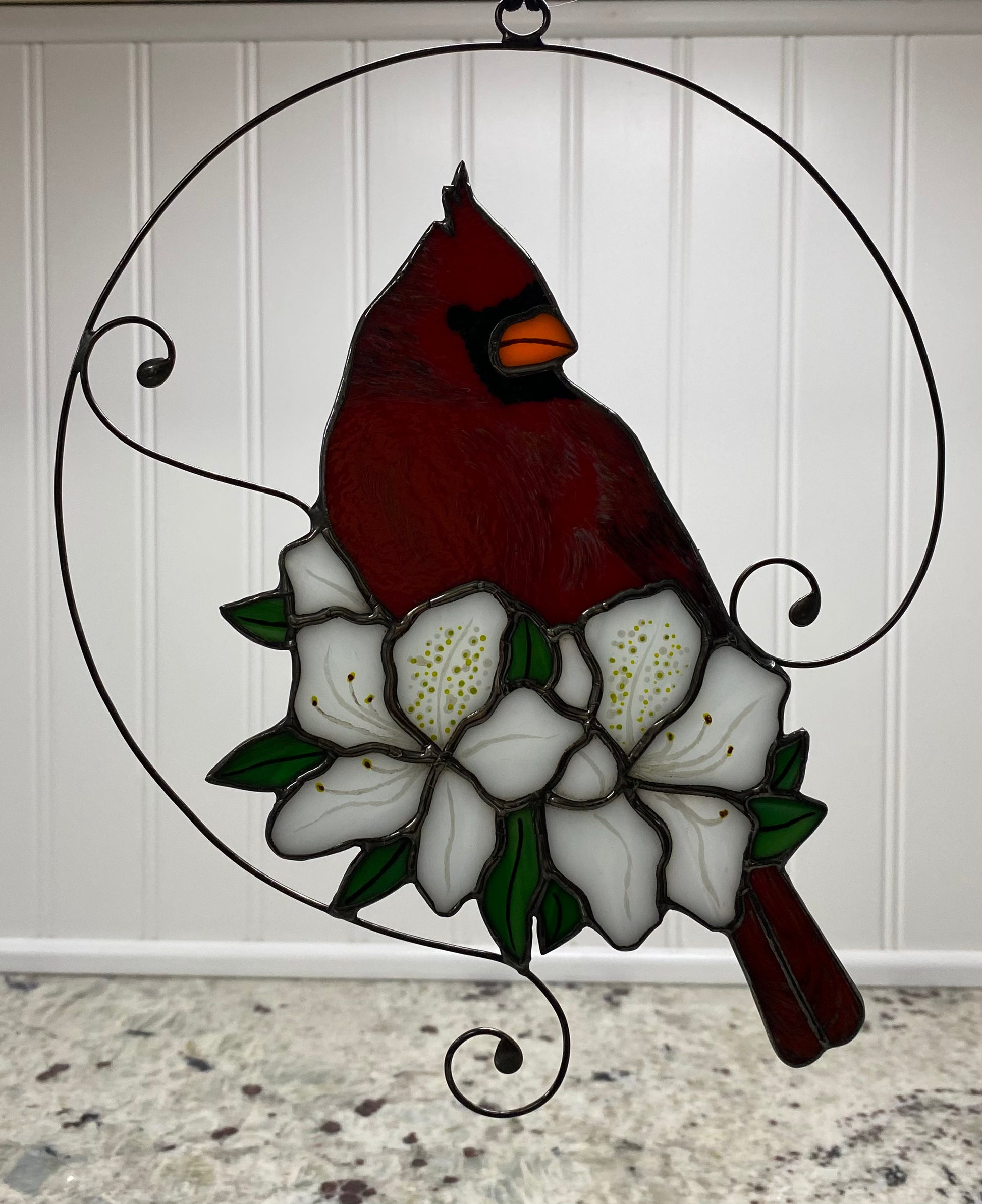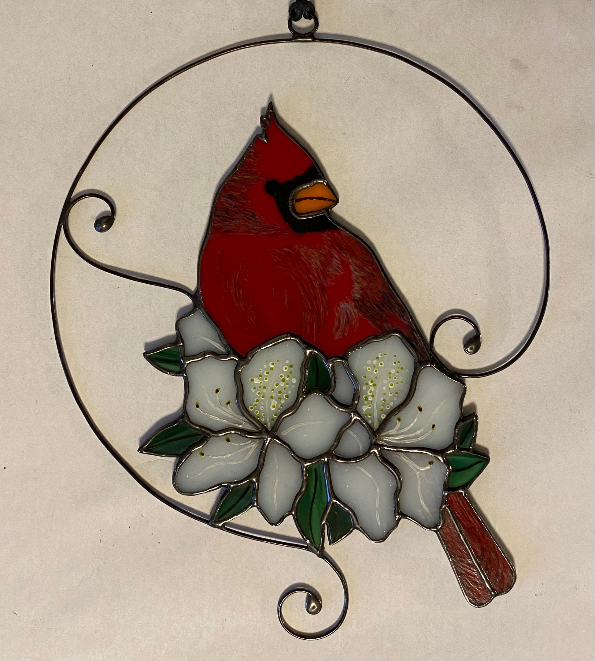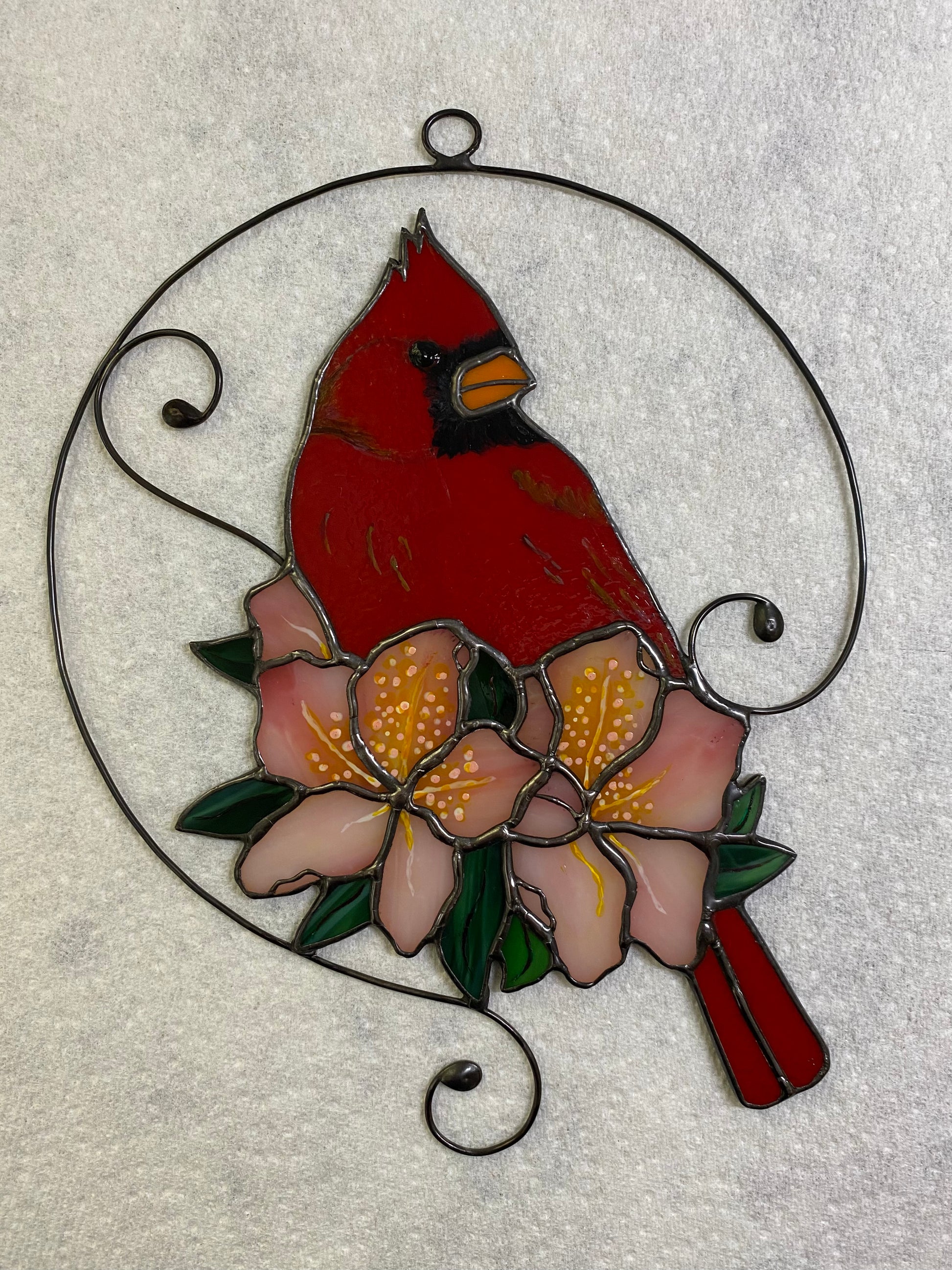 This male cardinal features Red Bullseye glass, and the fine details are painted using Pebeo 160 glass paint, heat treated for permanence. A decorative wire hanger embellishes the finished piece, The details on each leaf and flower petal are hand-painted using Pebeo 160 glass paint, heat treated for permanence. Finished size (glass portion only): approx. 6.5"w x 8"h.