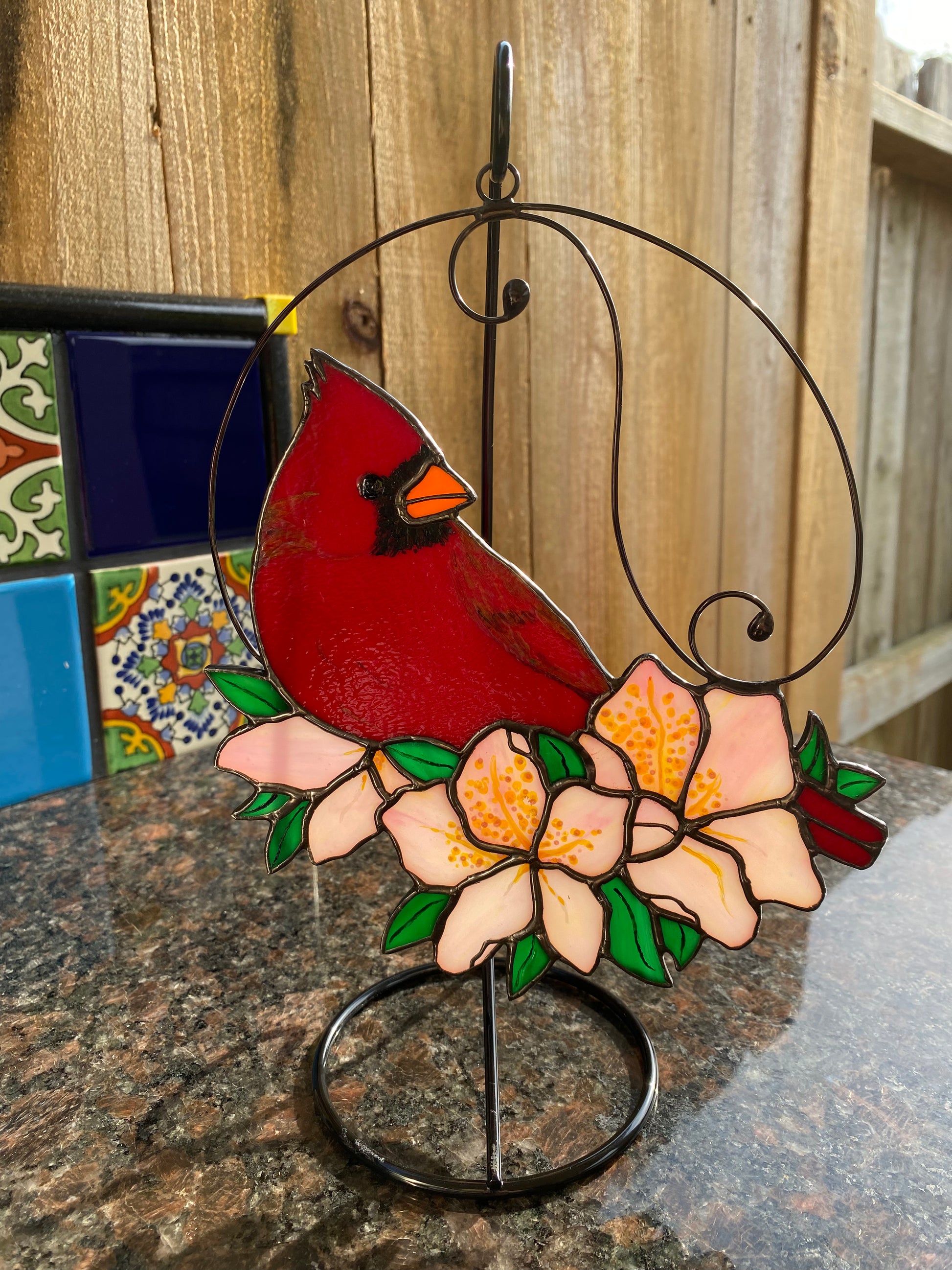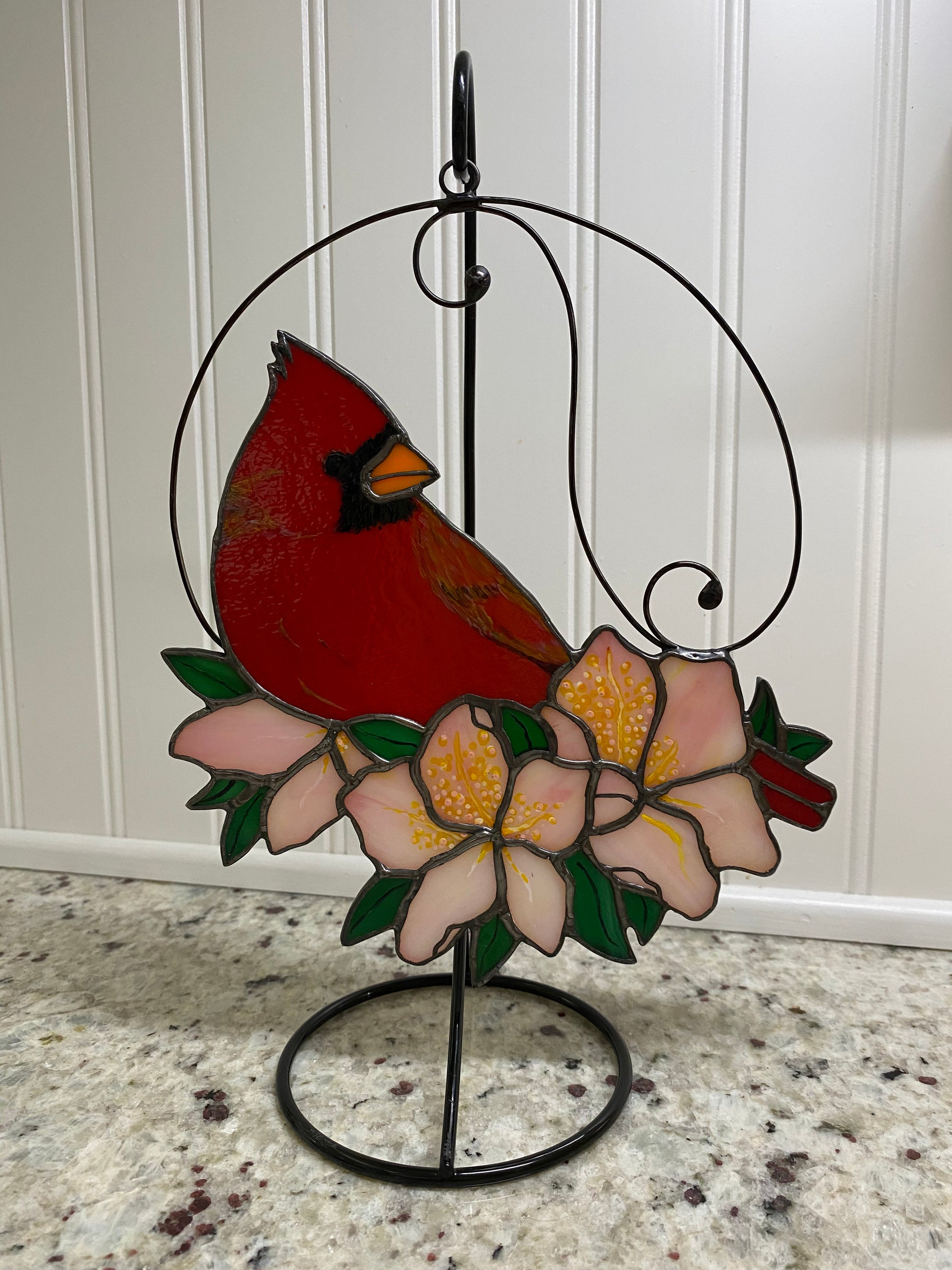 This male cardinal features Red Bullseye glass, and the fine details are hand-painted using Pebeo 160 glass paint, heat treated for permanence. A decorative wire hanger embellishes the finished piece, The details on each leaf and flower petal are hand-painted using Pebeo 160 glass paint, heat treated for permanence. Finished size (glass portion only): approx. 7.5"w x 7"h.