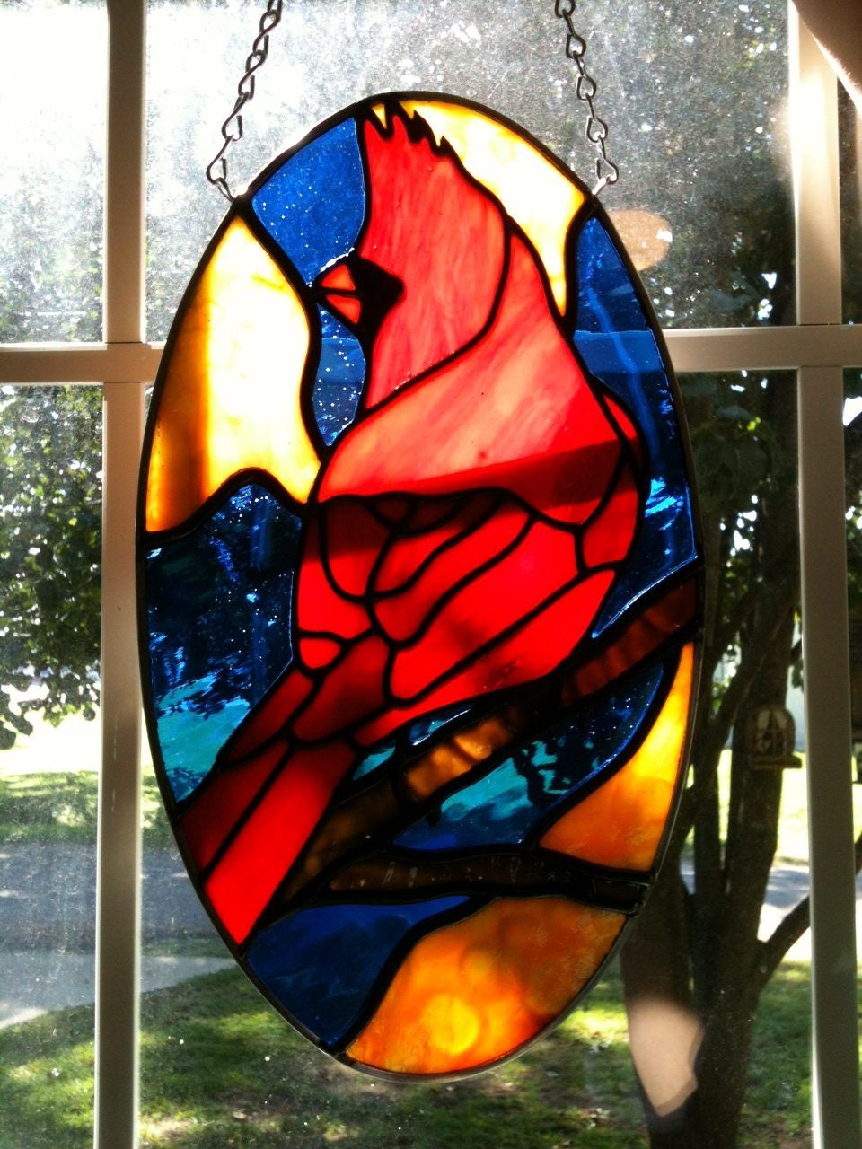 This large suncatcher features a male cardinal made with red Kokomo glass. Orange Uroboros ring mottle provides the fall color to the piece. Finished size 7.75”x 13”