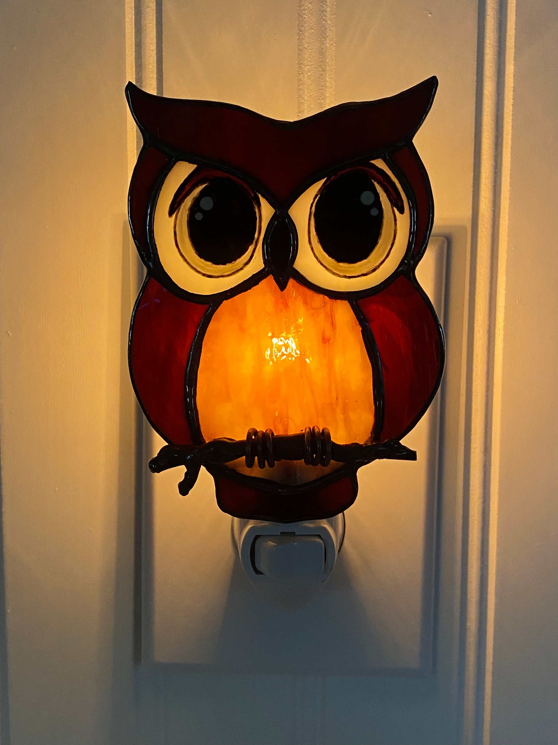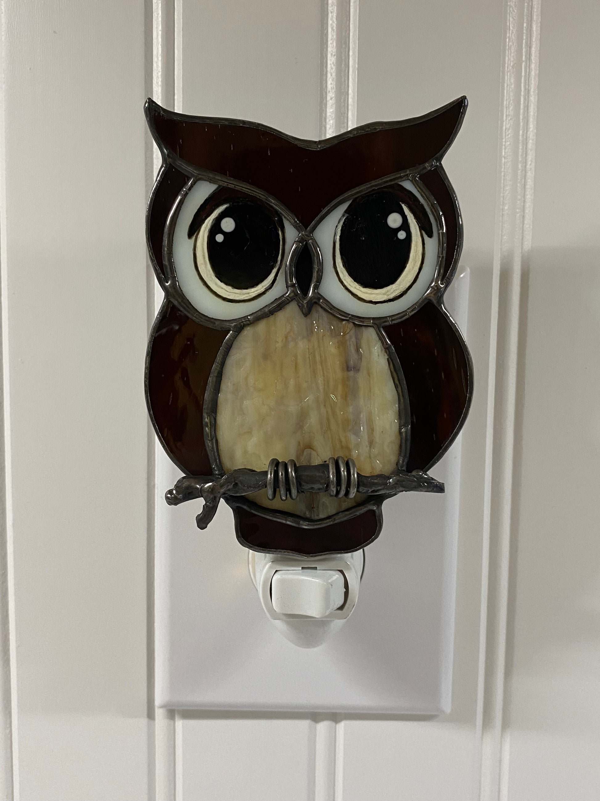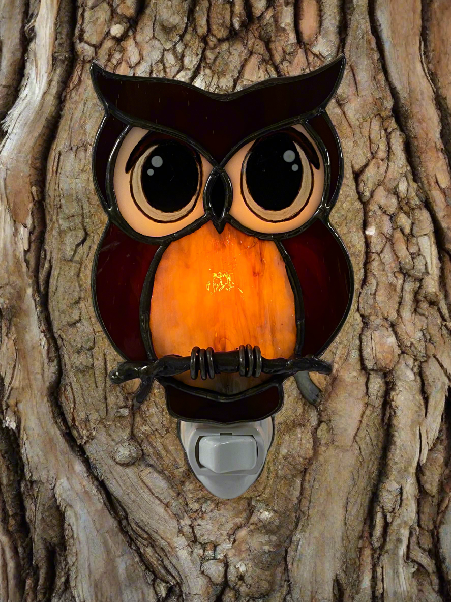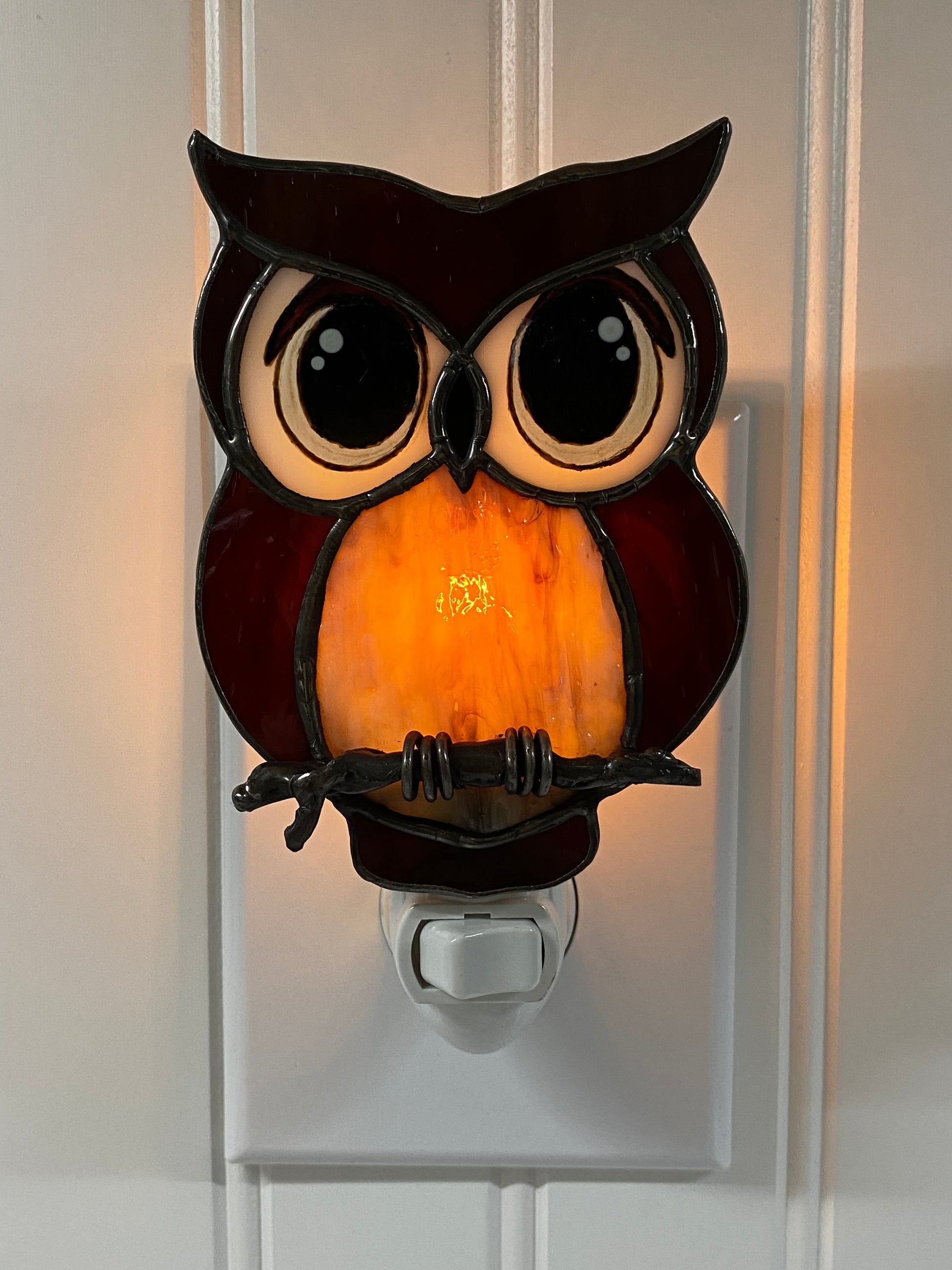This adorable little guy cutely perches ready to light up your space with his sweet little expression. He showcases Spectrum amber brown on white wispy, and textured brown and tan wispy glass. The eyes are painted with Pebeo 160 glass paint and heat treated for permanency. Comes with a regular night-light base and bulb. For a sensor night-light base, add $9 to the price listed. Request the sensor base in the comments of the order form below.