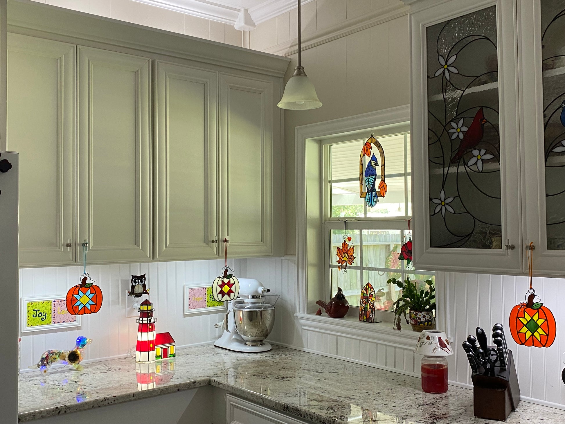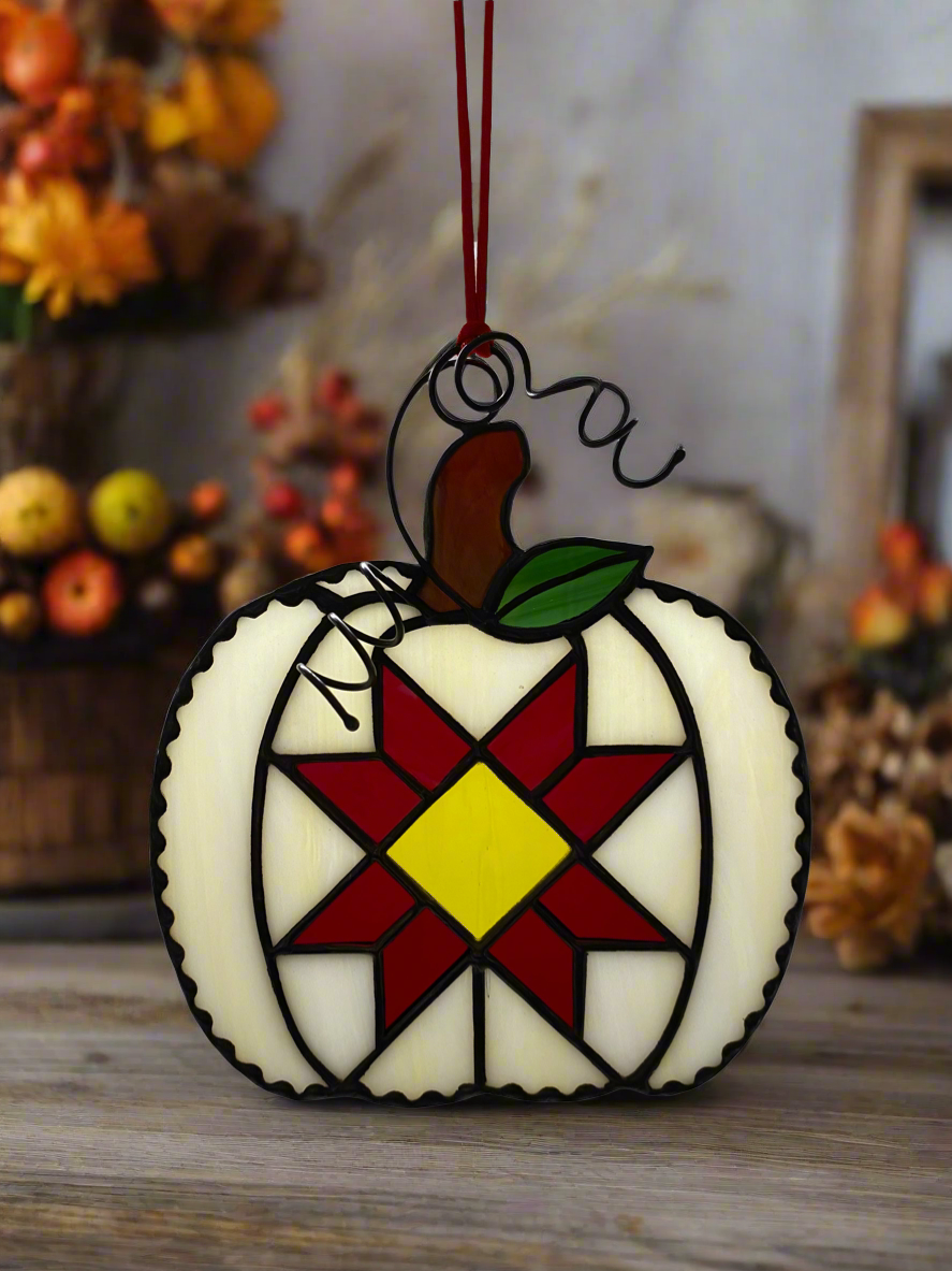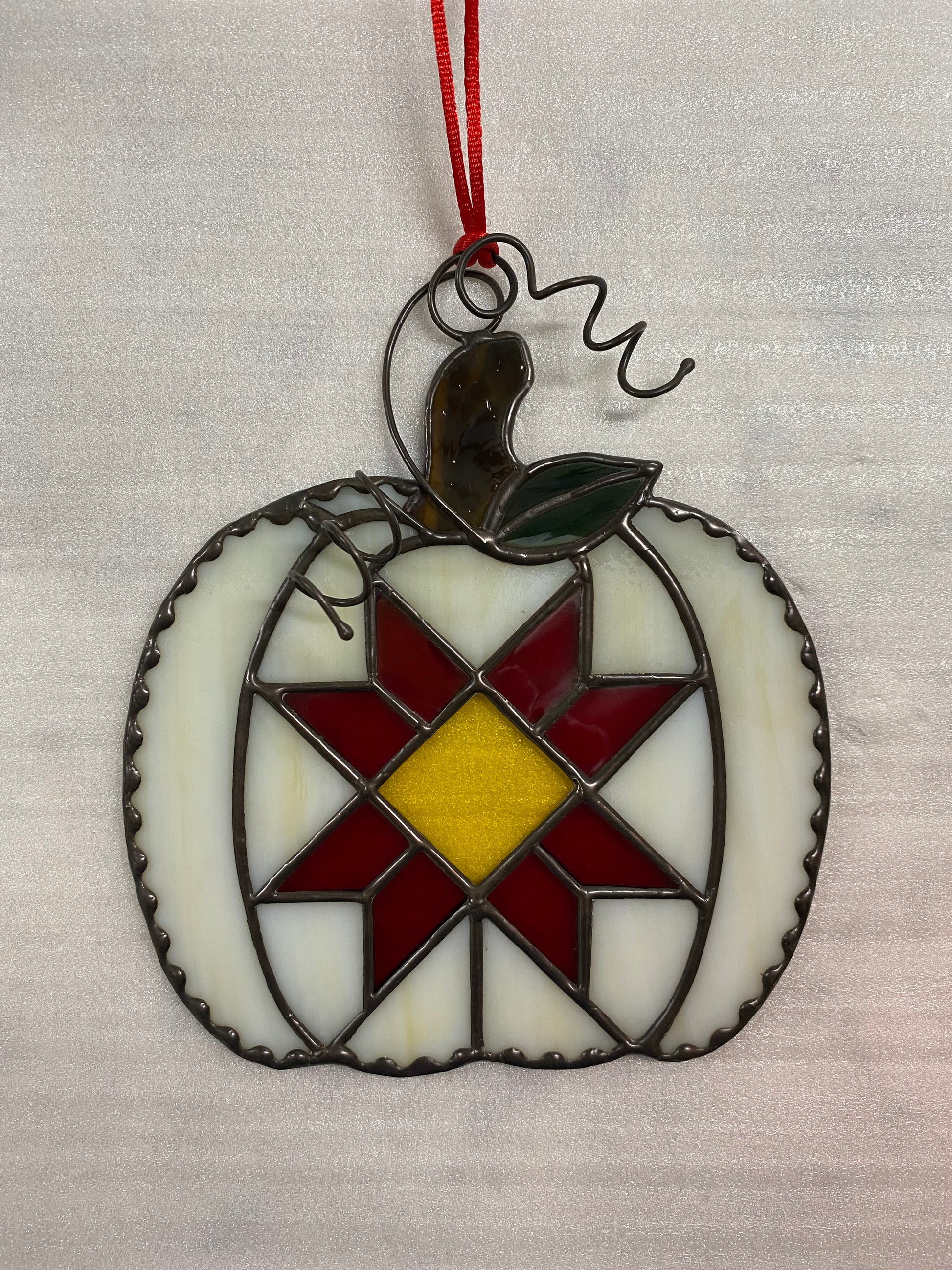 This charming fall pumpkin suncatcher draws inspiration from a design purchased from Wildlight Glassworks, whose lovely patterns can be found on Etsy. It’s an ideal pick for quilters and fans of vintage-style decor alike. This particular listing has scalloped solder on the outside edges to embellish the piece. Choose from multiple colors, glass choices, and details like scalloped edges or decorative solder beads to personalize your piece. Please feel free to fill out the customizations section in the pre-order form below with your desired personalization if the listing you desire is sold out.