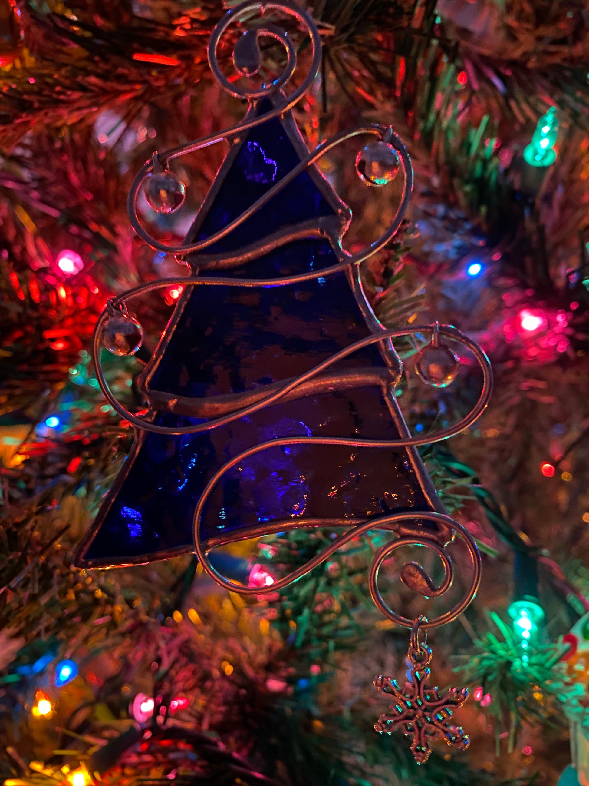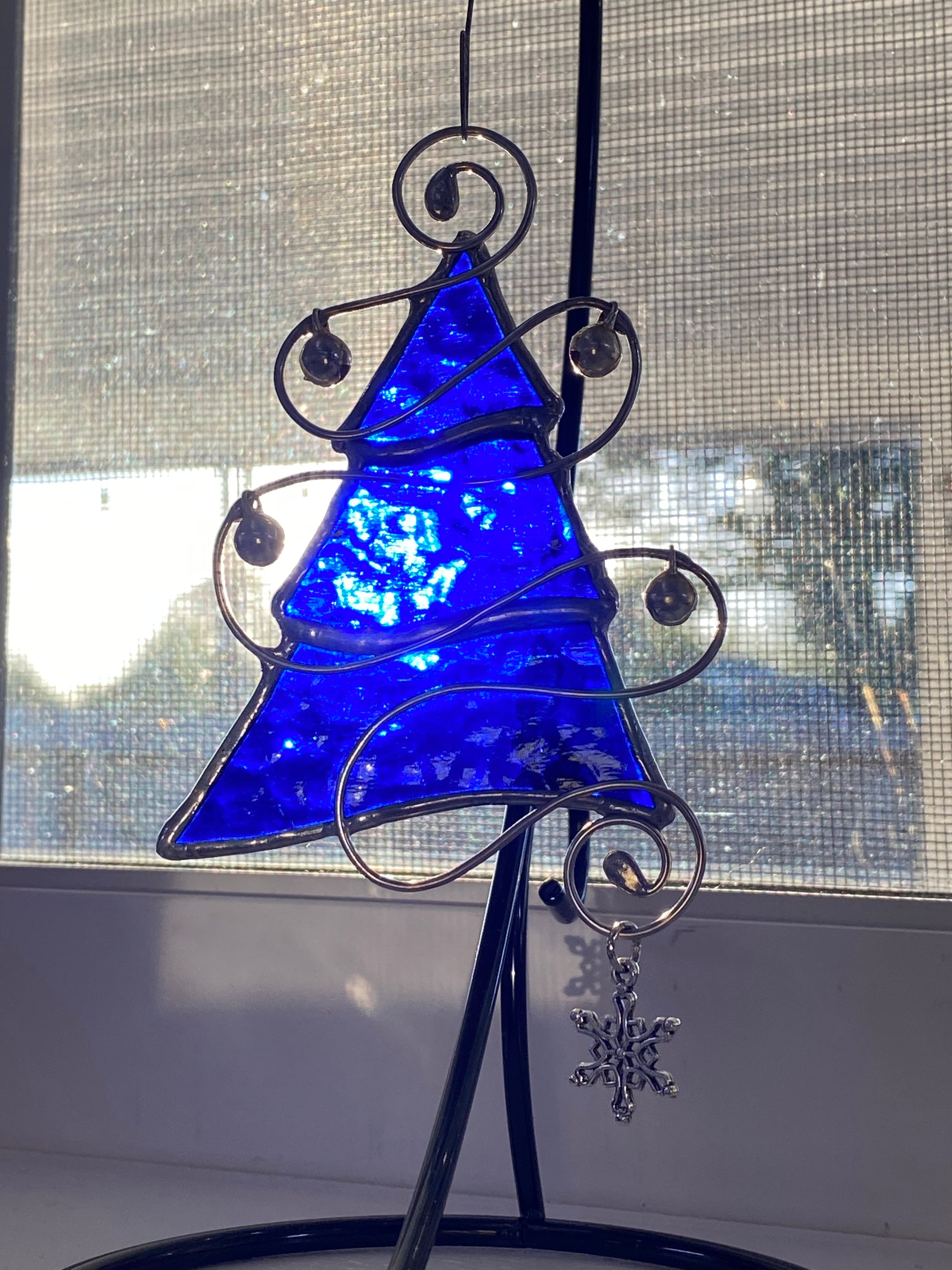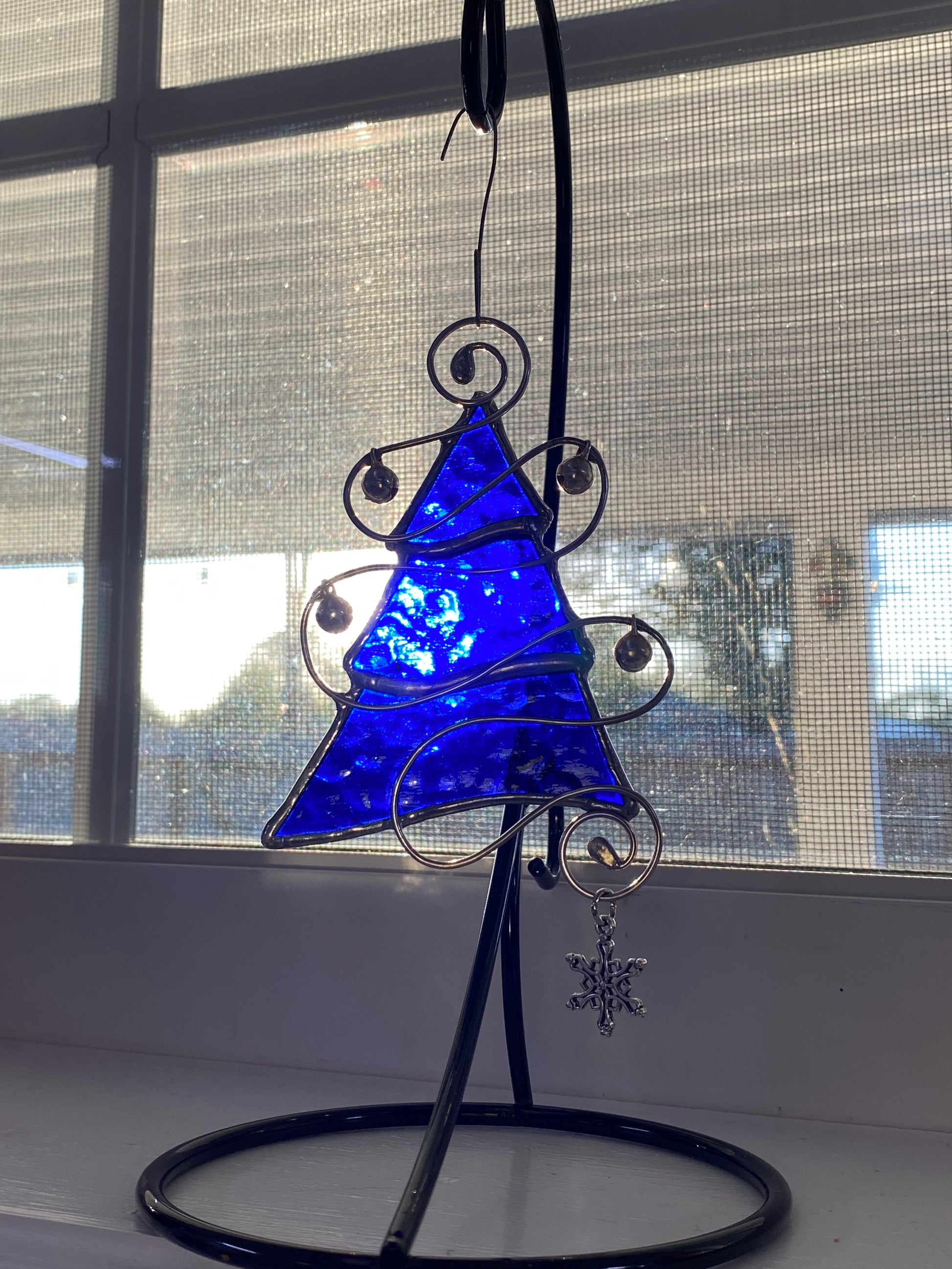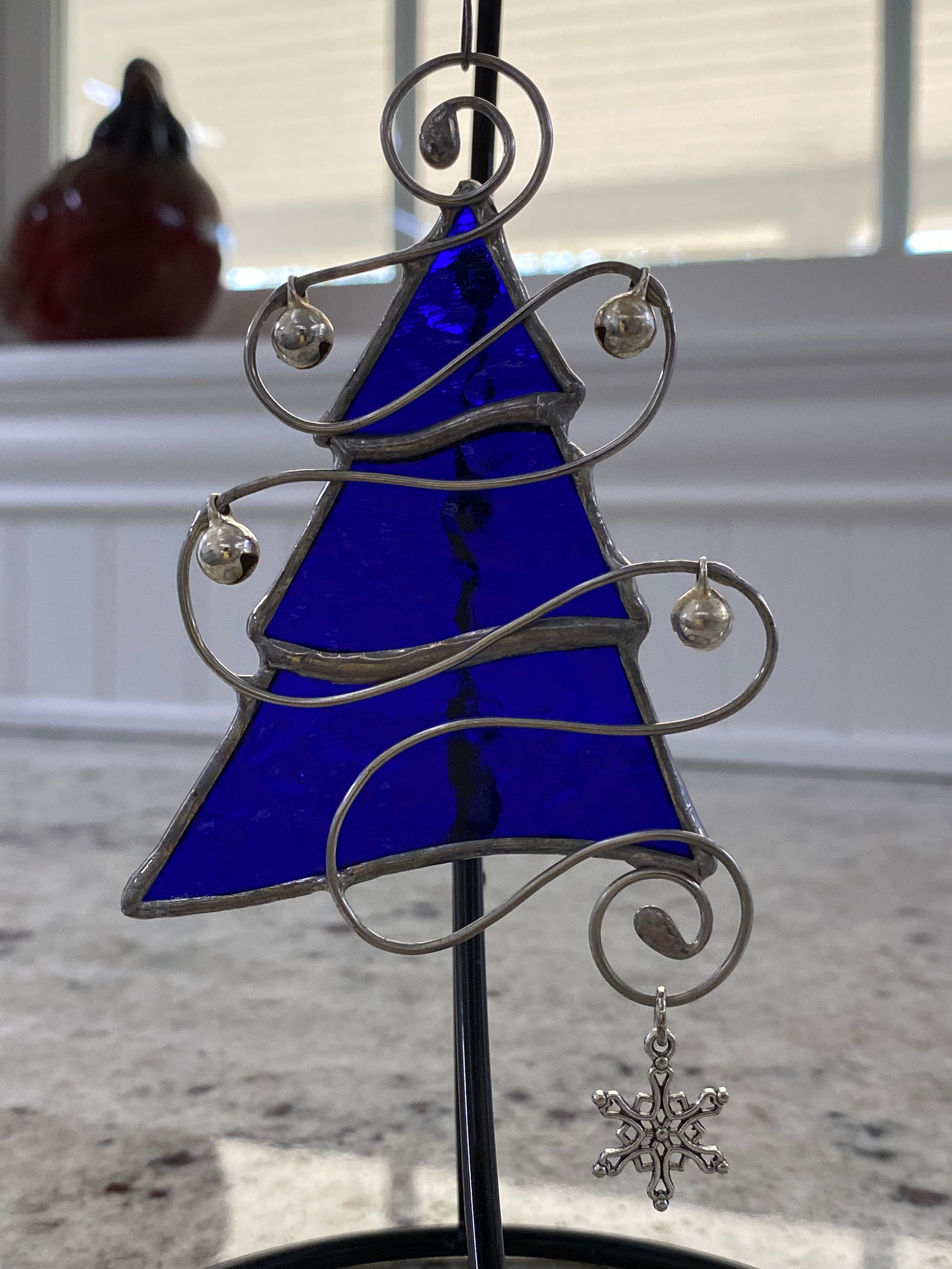 This approx. 3”x 5” tree ornament showcases a tiny snowflake charm, four tiny silver jingle bell ornaments, and Wissmach Majestic Blue muffle glass.