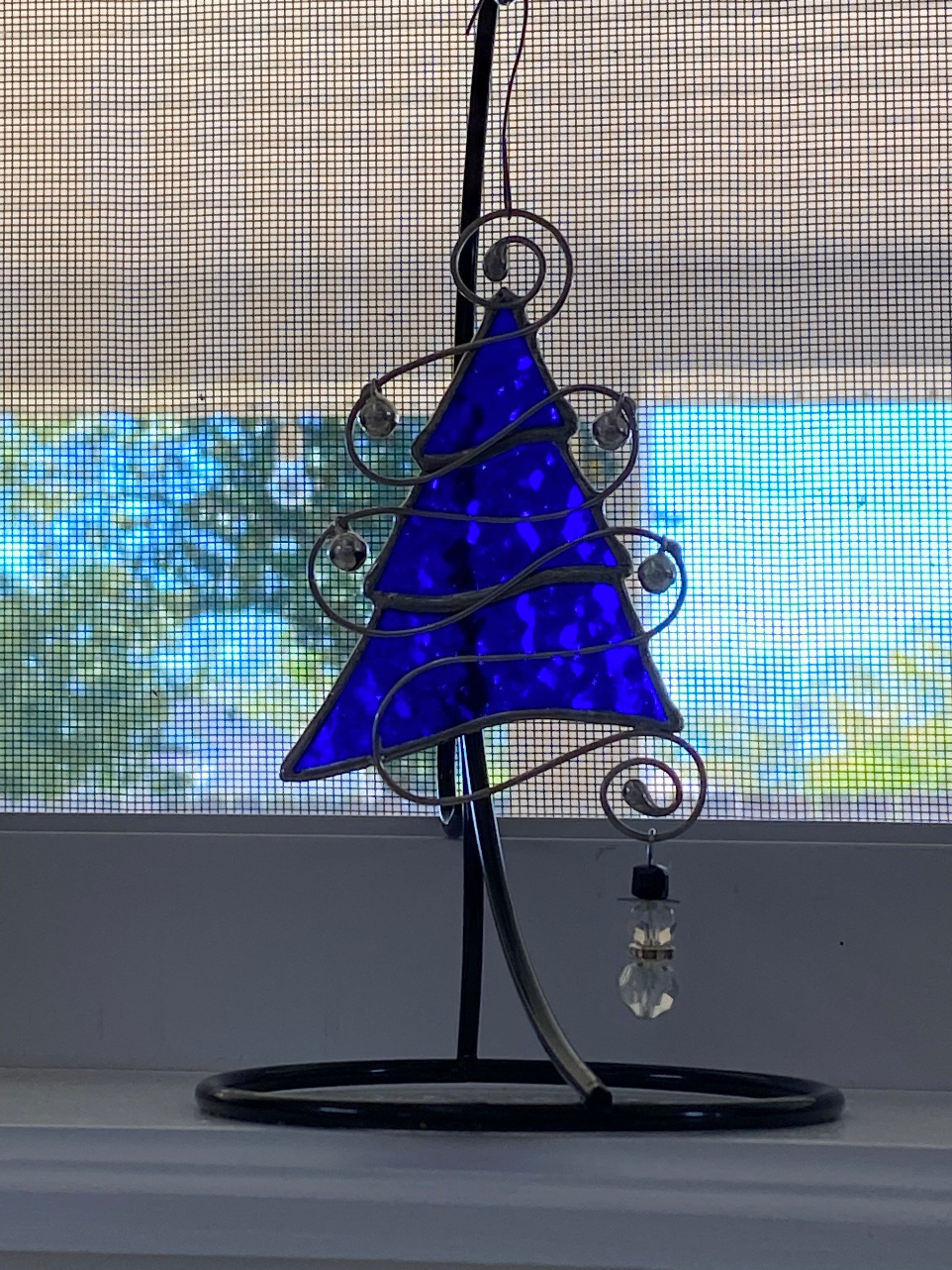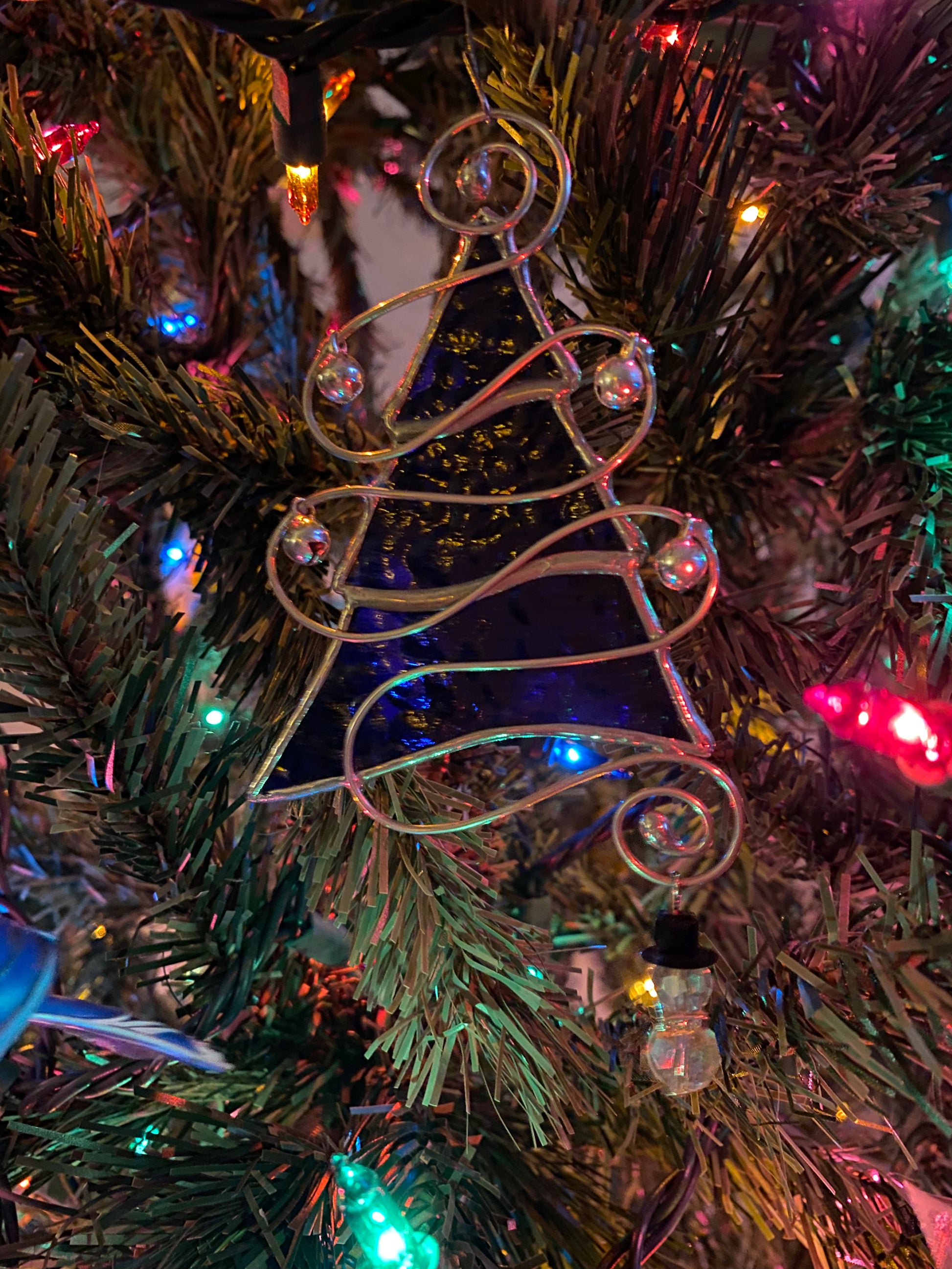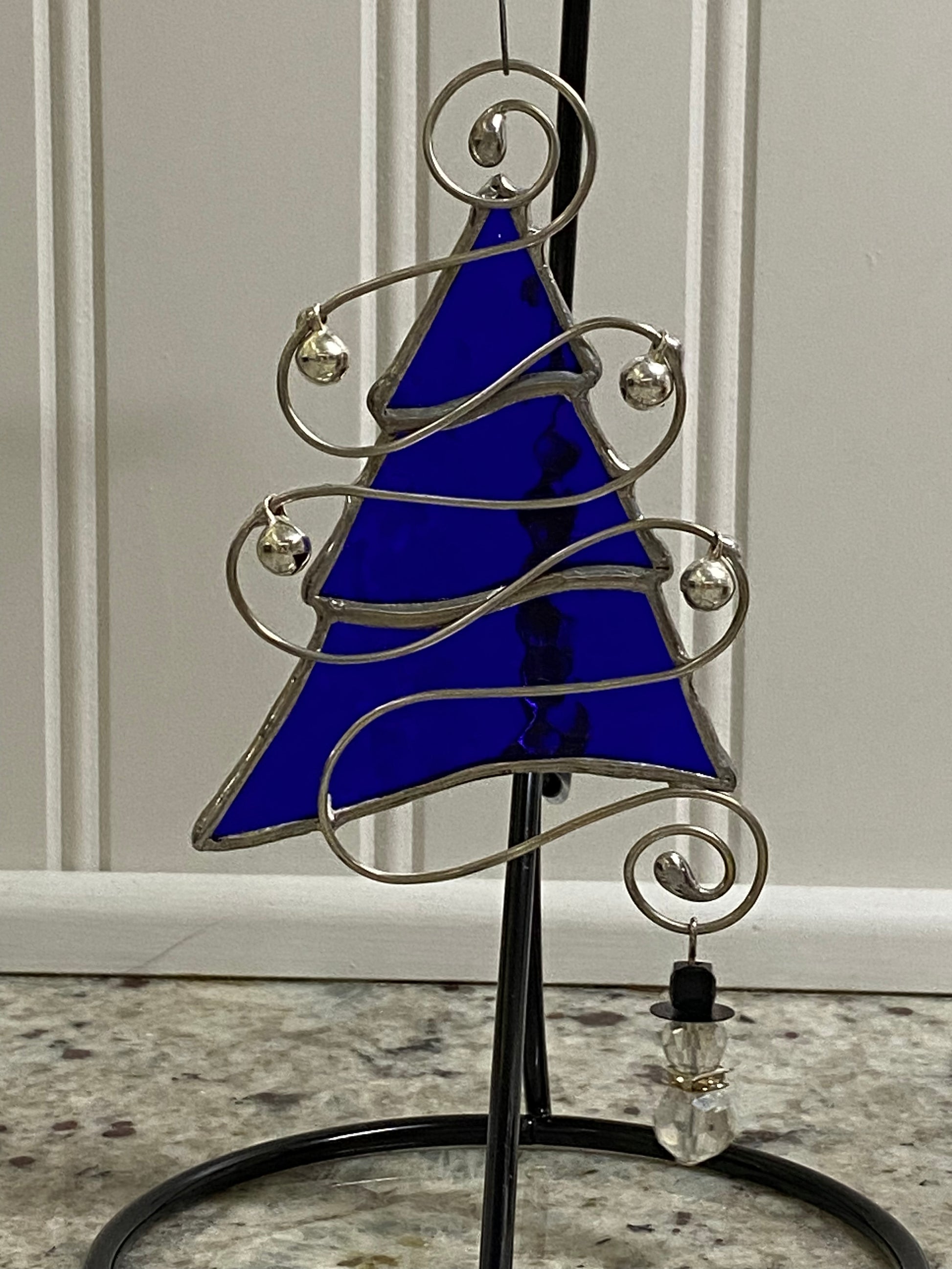 This approx. 3”x 5” tree ornament showcases a tiny 'crystal' snowman charm with a silver and 'crystal' neck covering, four tiny jingle bell ornaments, and Wissmach Majestic Blue muffle glass.