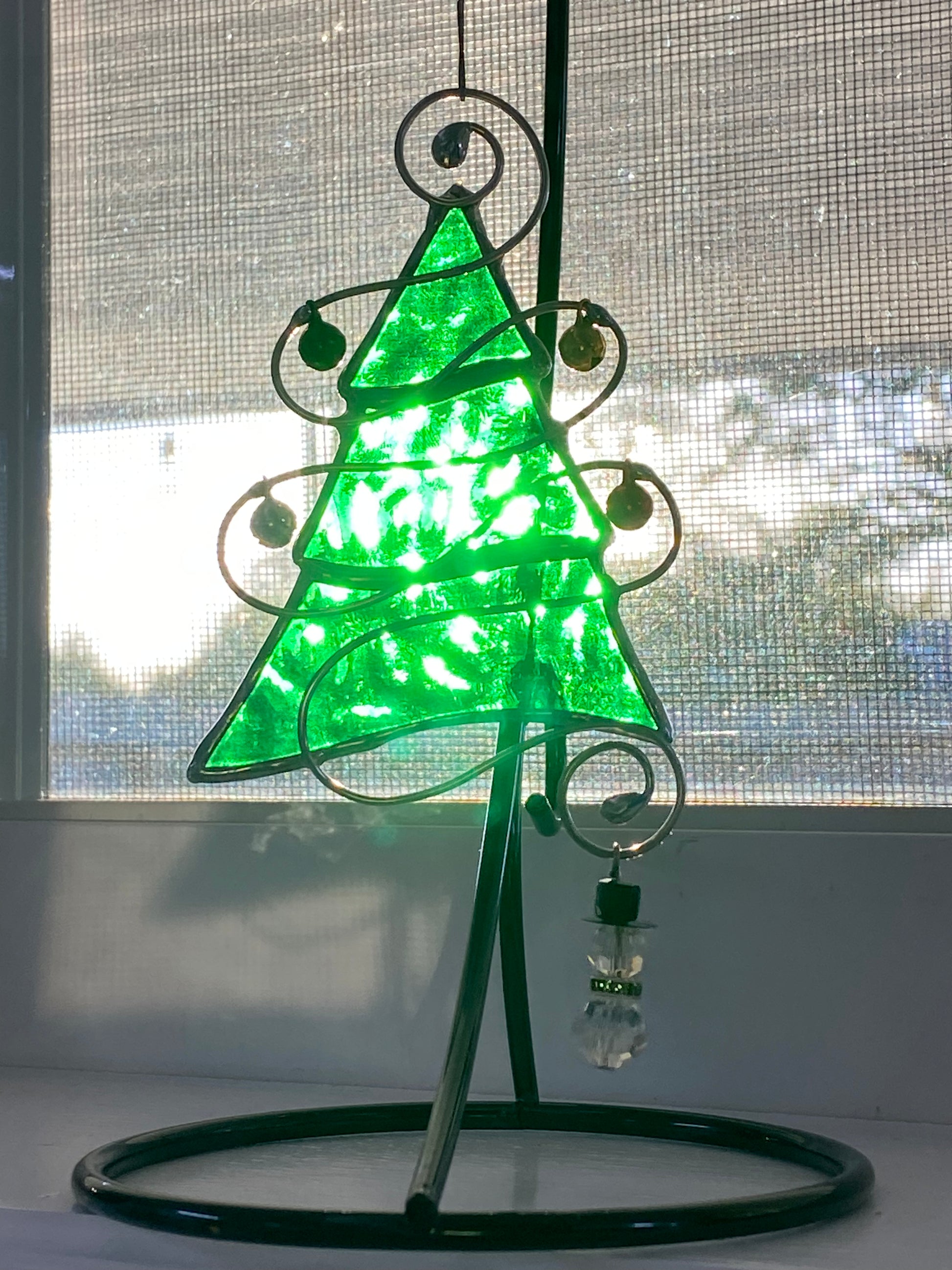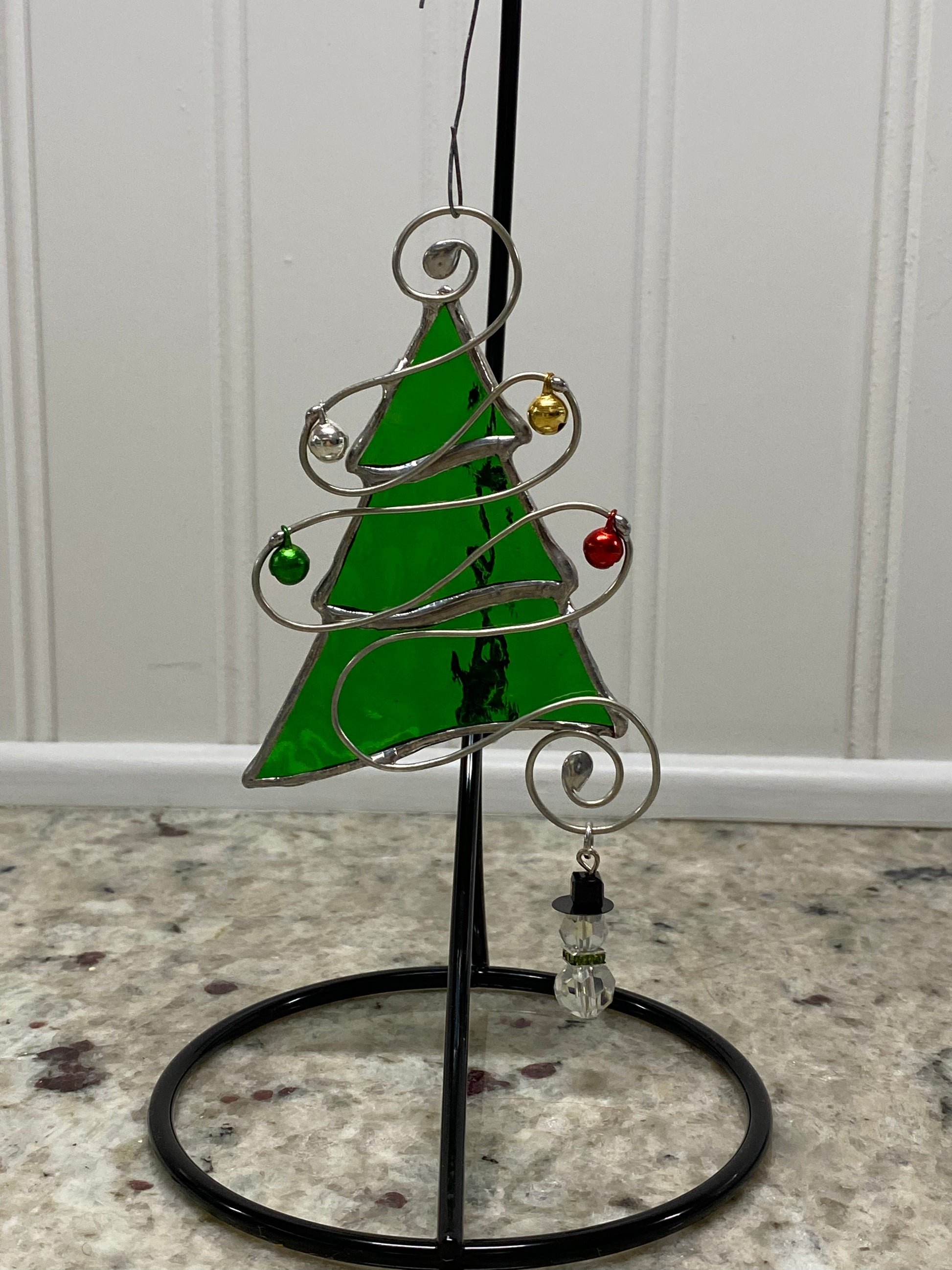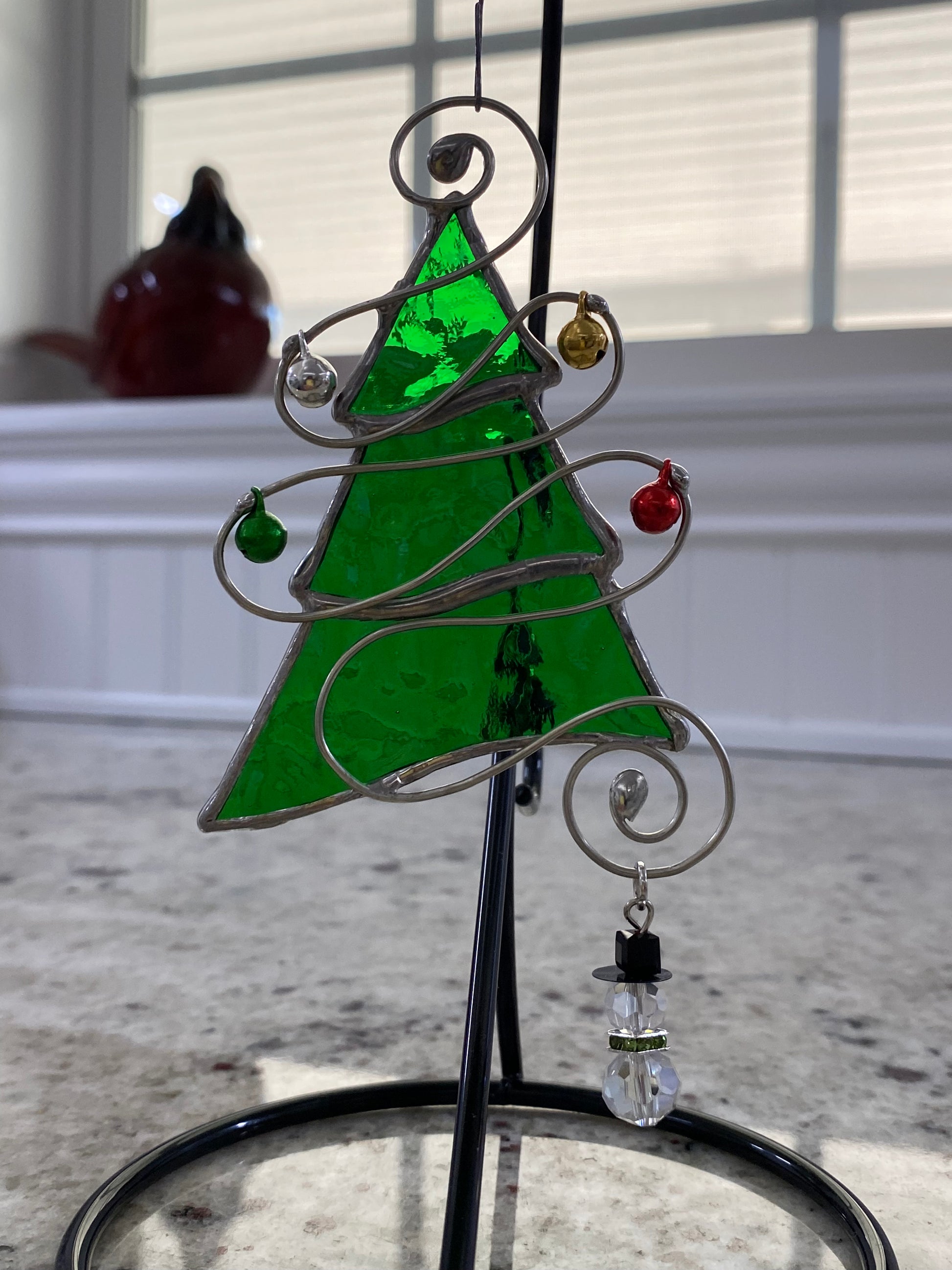 This approx. 3”x 5” tree ornament showcases a tiny 'crystal' snowman with a green 'crystal' neck covering, four tiny jingle bell ornaments (silver, green, gold, and red), and green Wissmach Emerald Isle muffle glass.