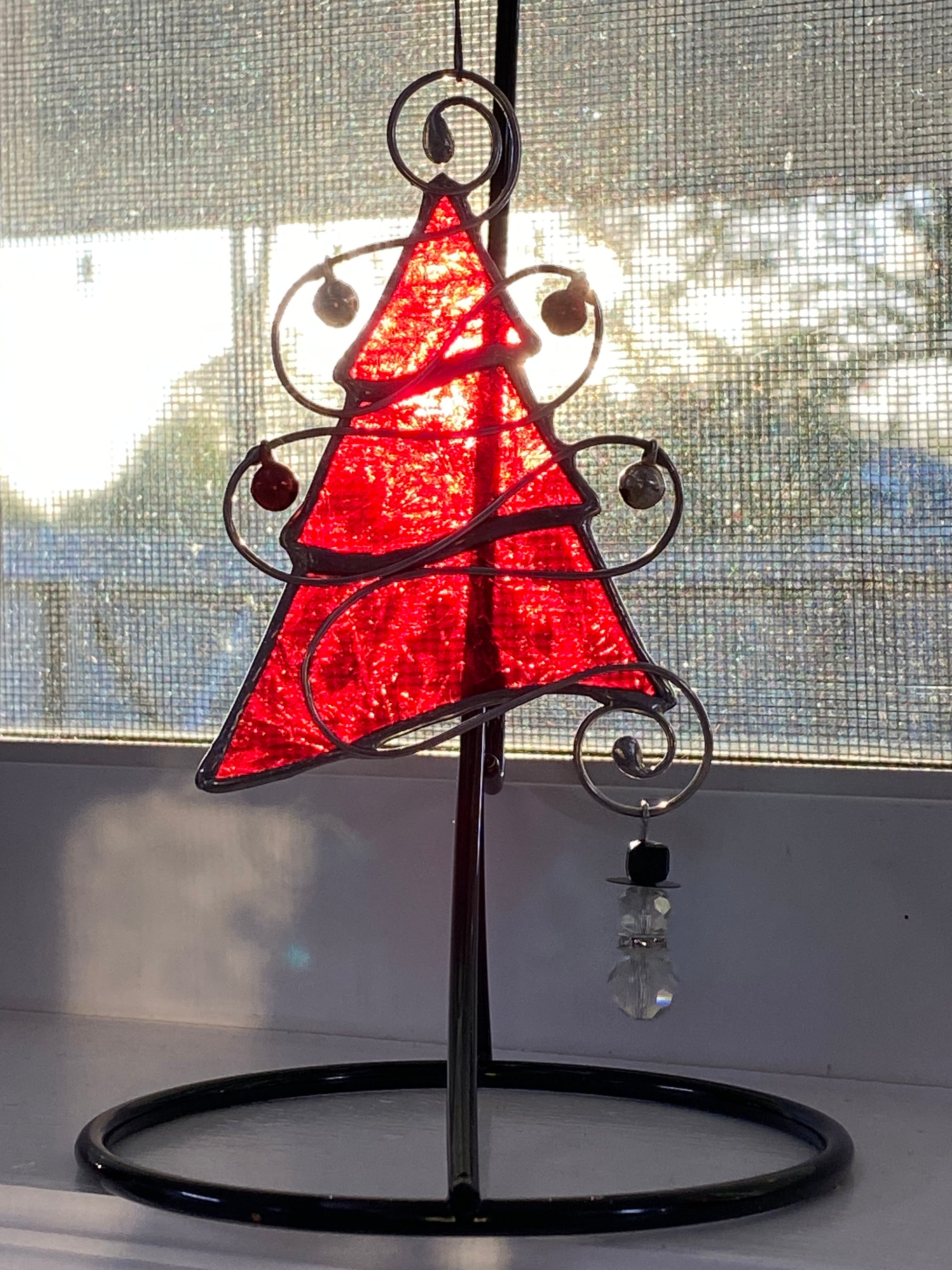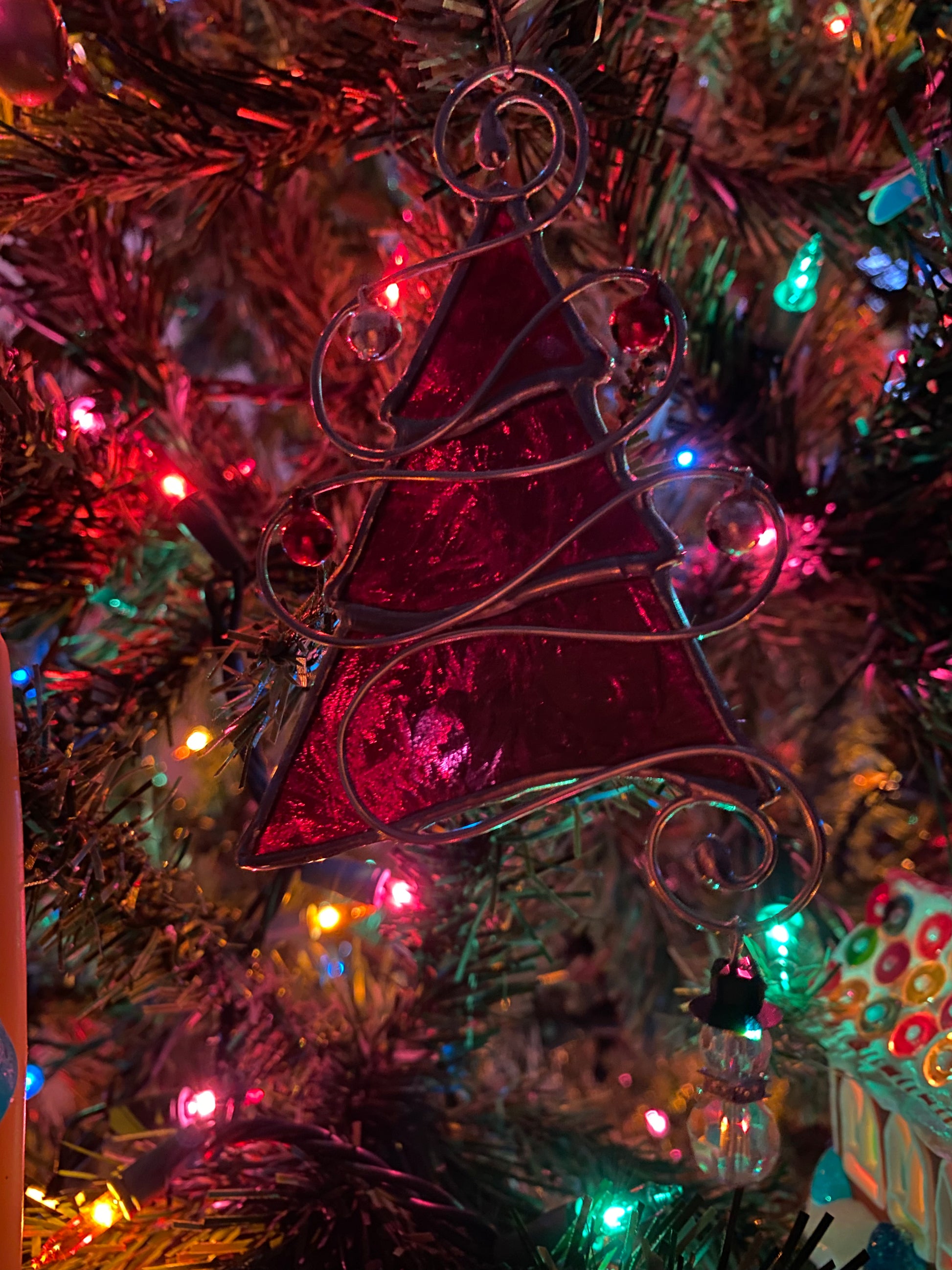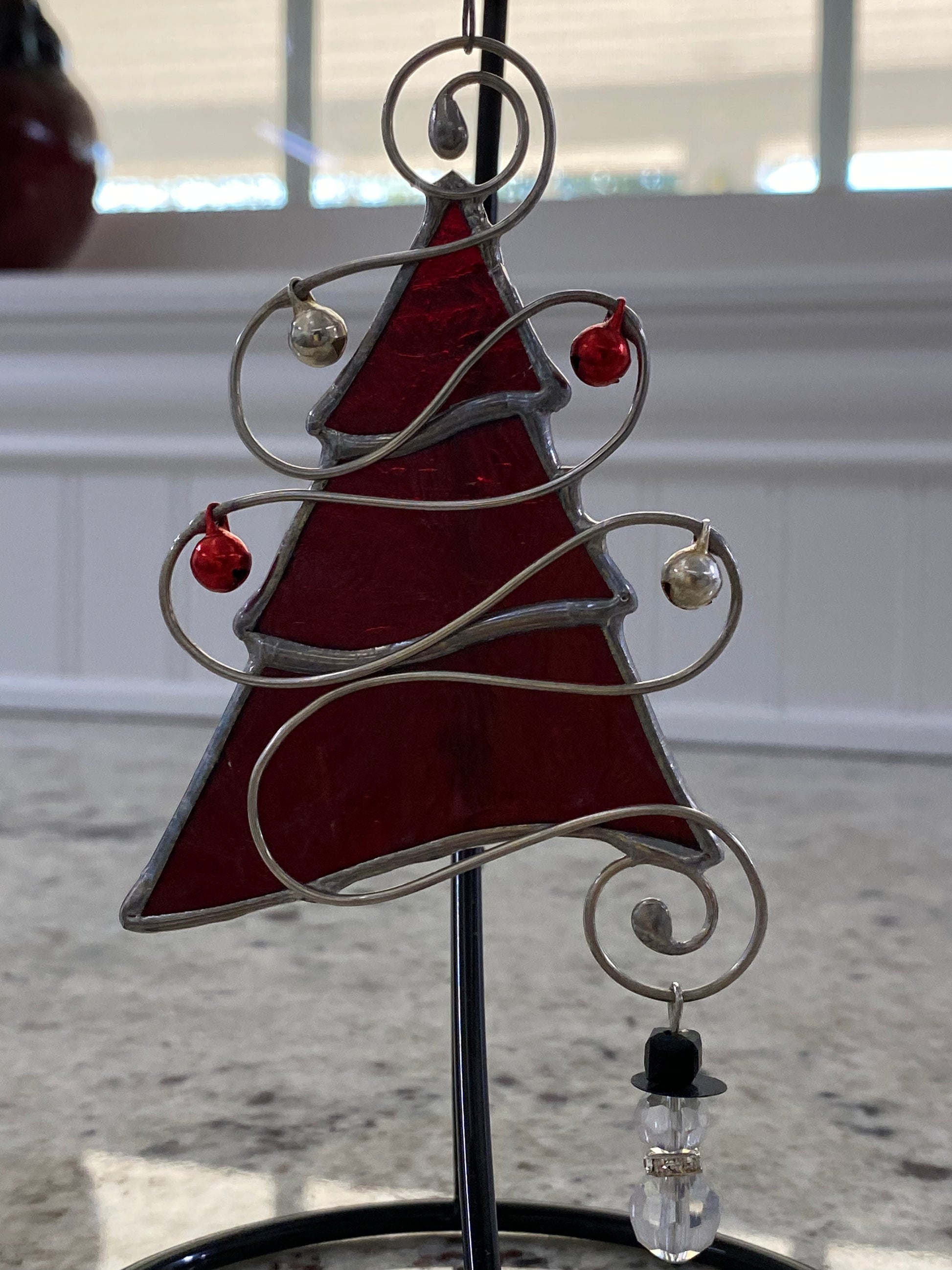 This approx. 3”x 5” tree ornament showcases a tiny ‘crystal, snowman with a silver and clear ‘crystal’ neck covering, tiny red and silver jingle bell ornaments, and red glue chip “snowflake” glass.