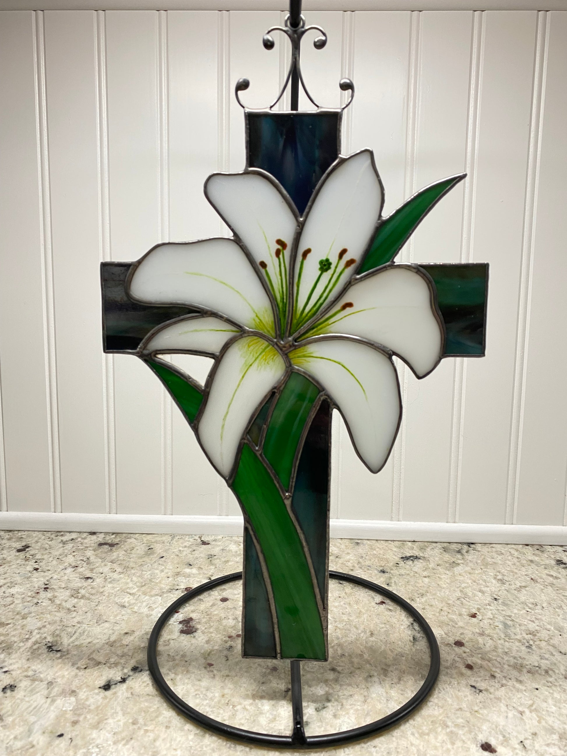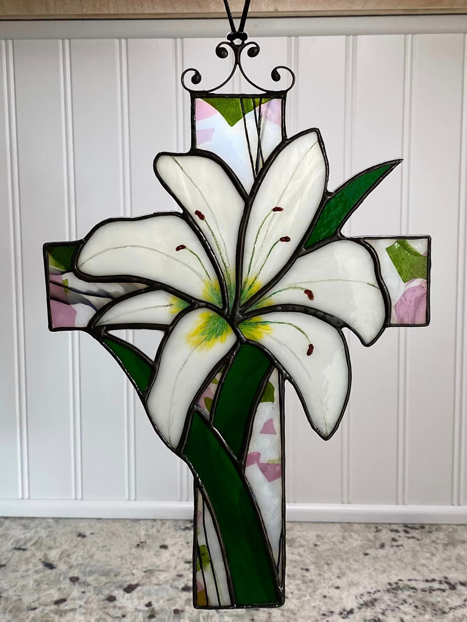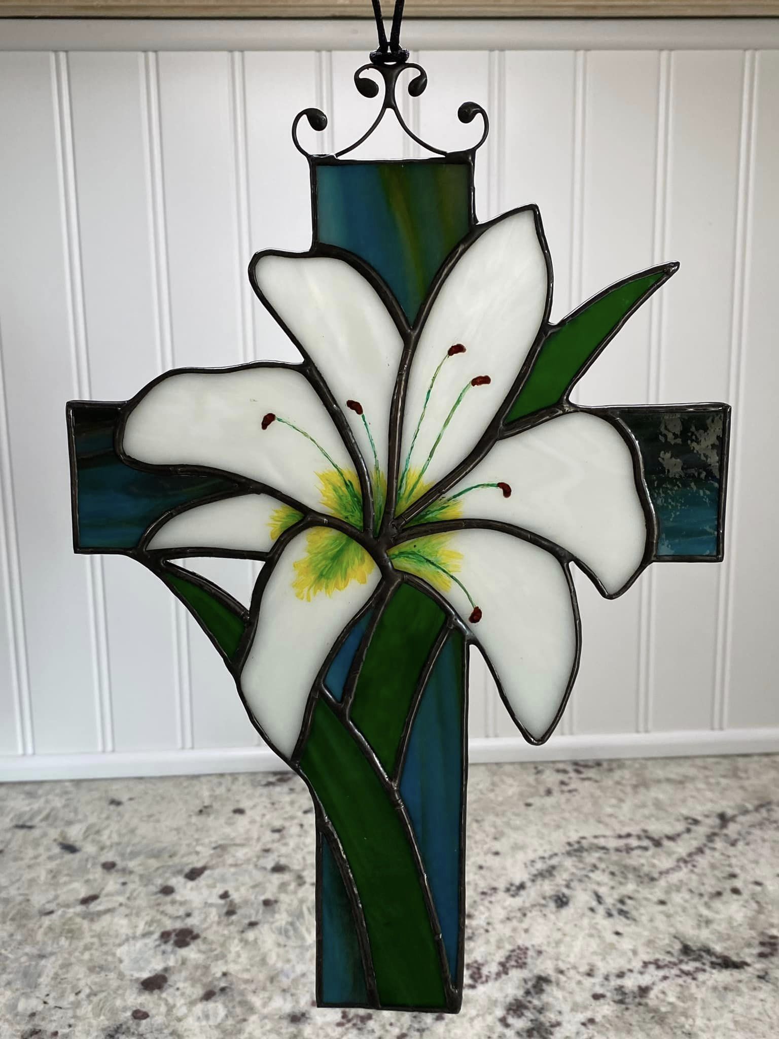 This cross features a white lily - the petal details and the stamen and pistil are hand-painted. The decorative hanger at the top is shaped in a way that provides stability to the piece as it is connected both at the top and from the sides, preventing all the weight from being carried only by the top edge. Don't see a color you love? Use the Submit an Idea page to send us a note about what you'd like to see.