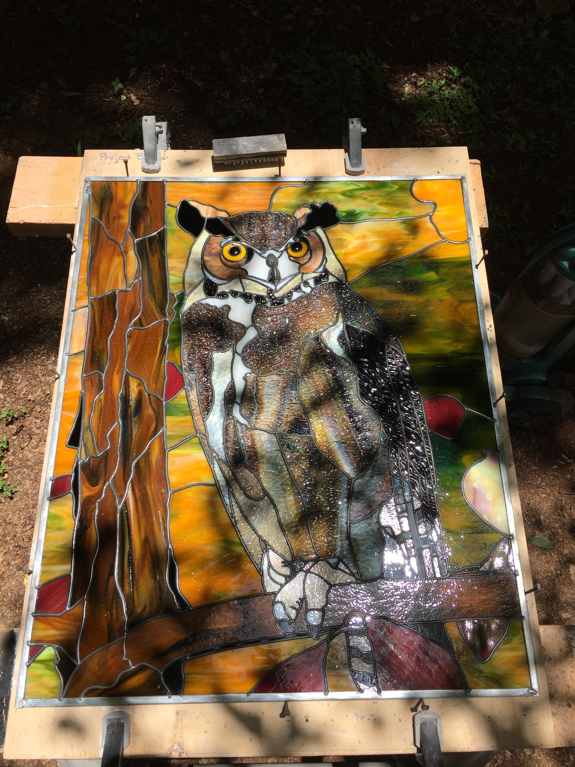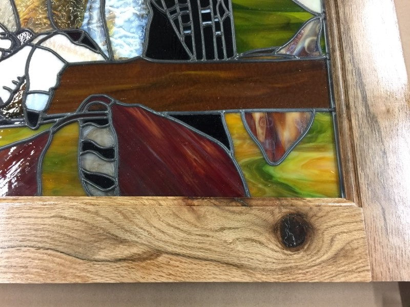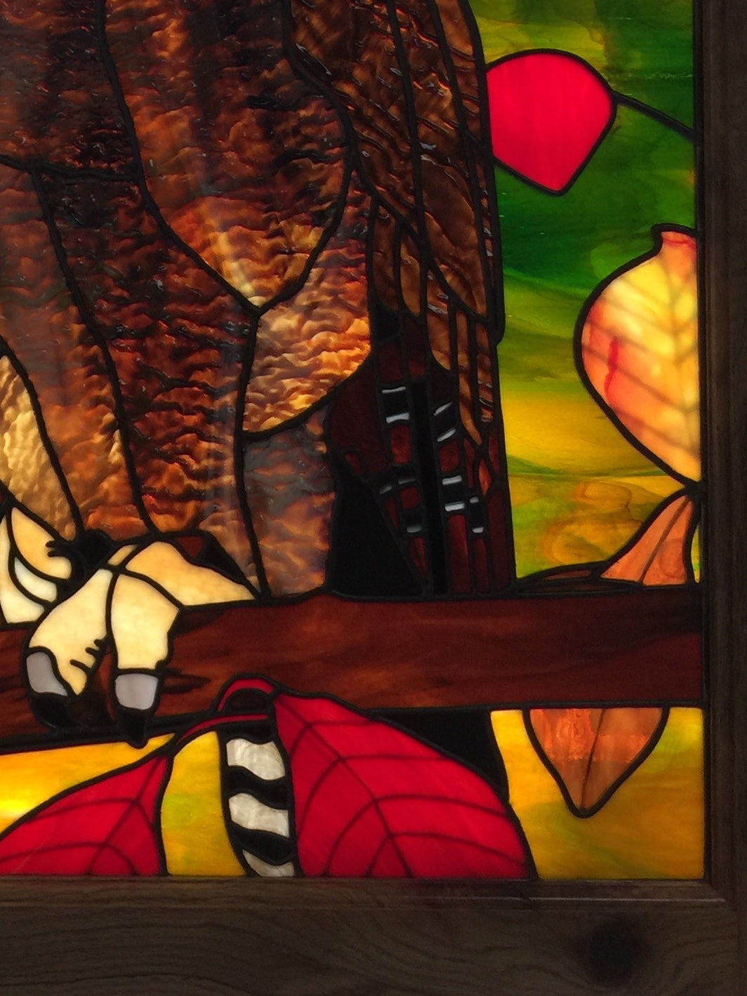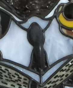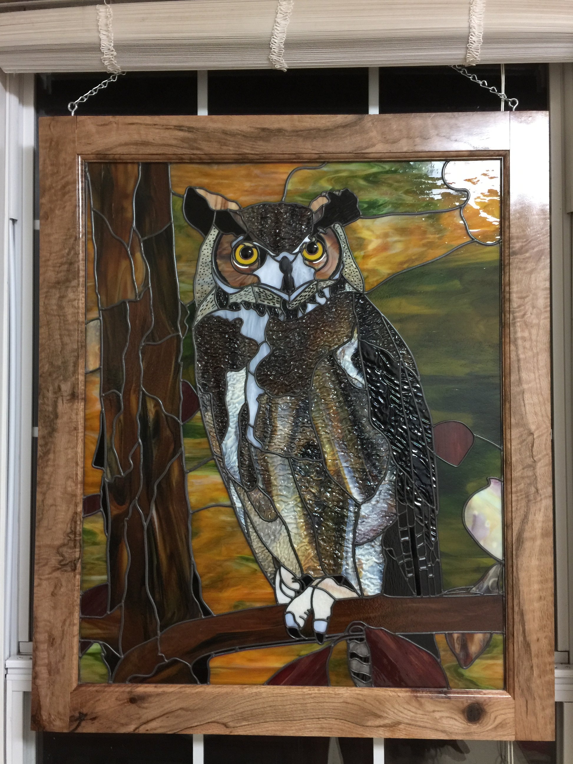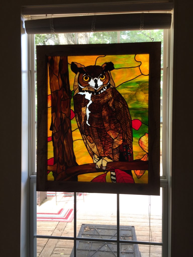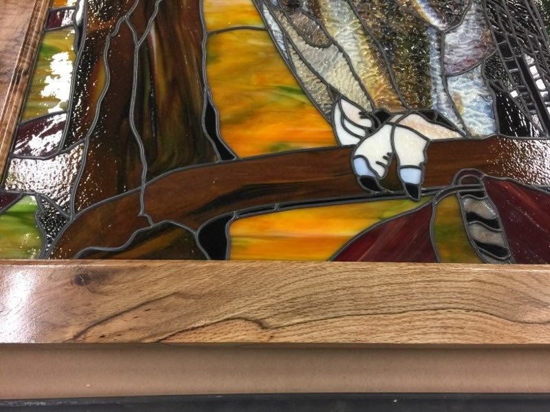 This 25”x 31” (excluding frame) owl features Bullseye Woodland Brown opal glass and ripple glass, a river rock makes the beak, and foil overlay gives the veins in the leaves when the light shines through the piece.
