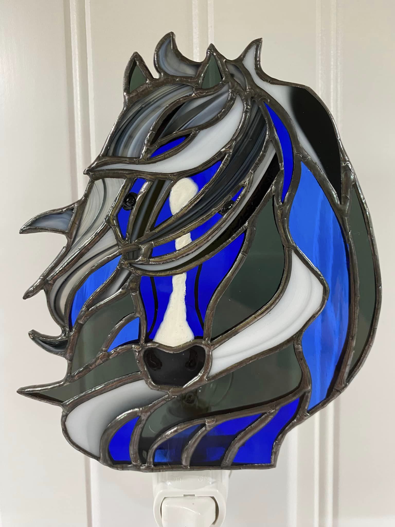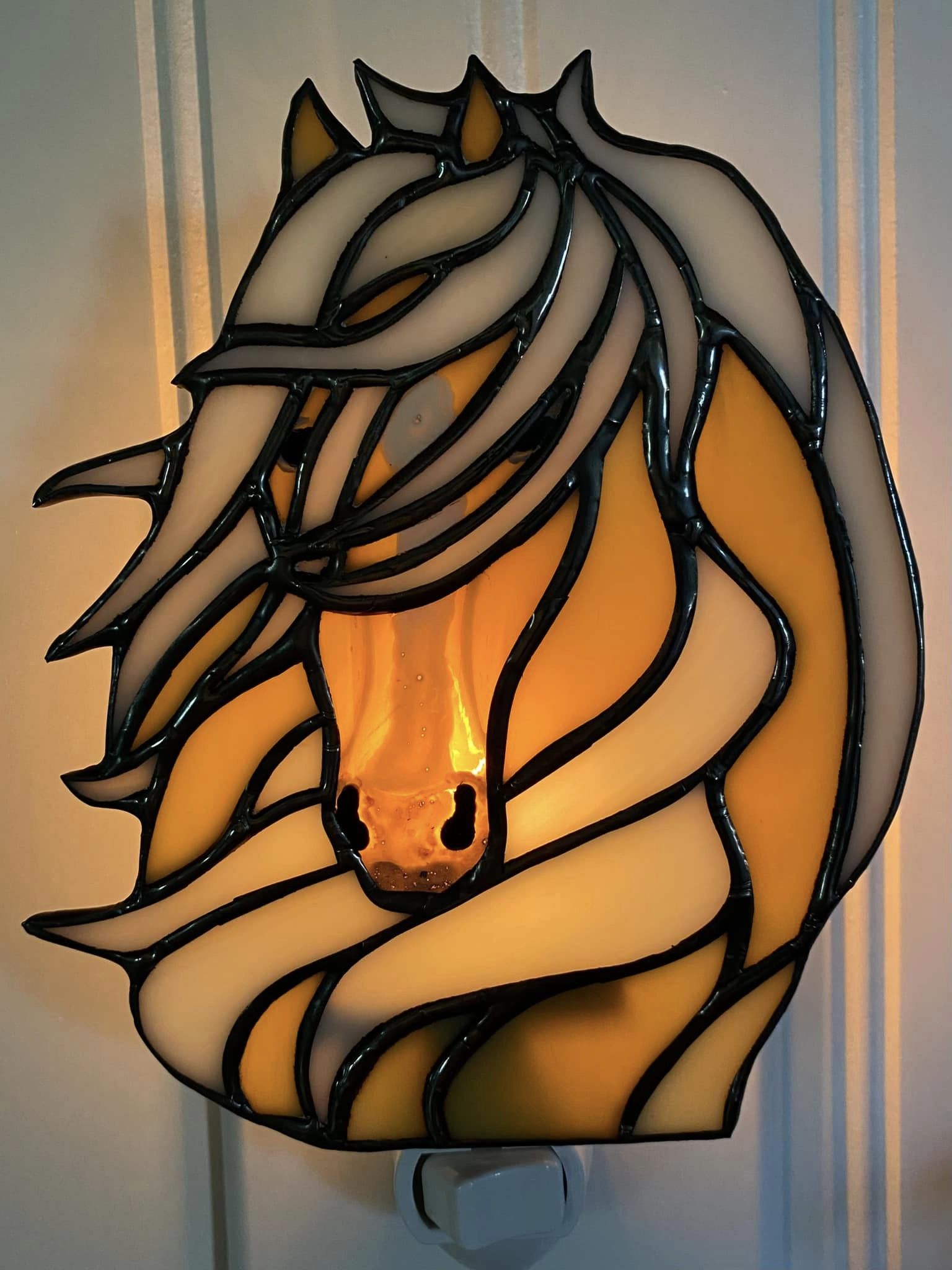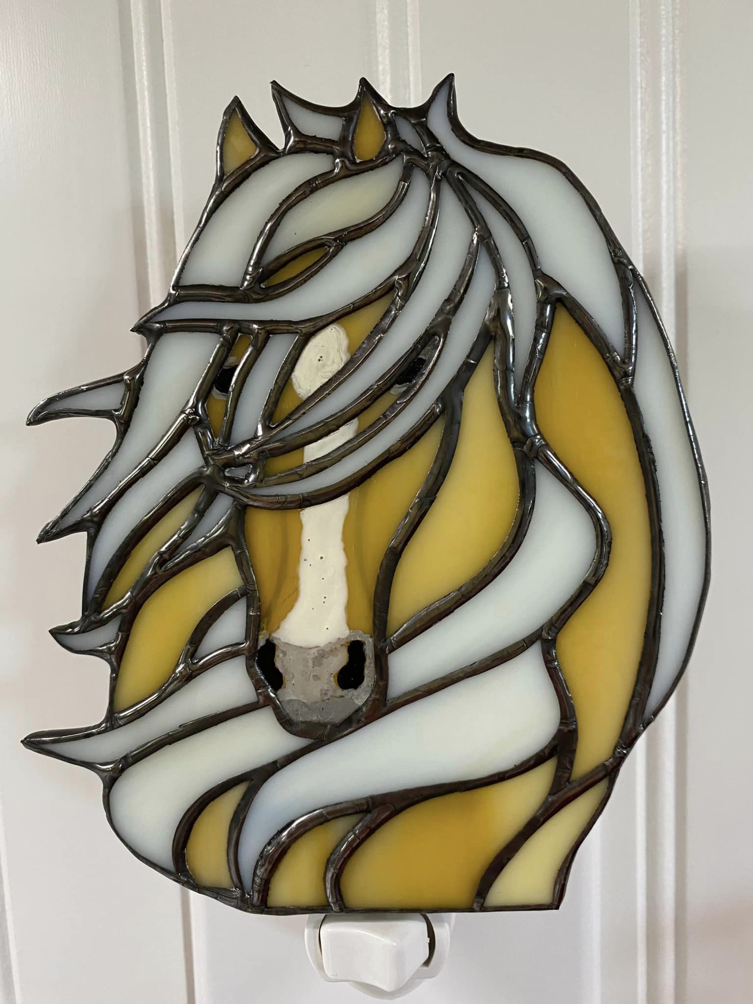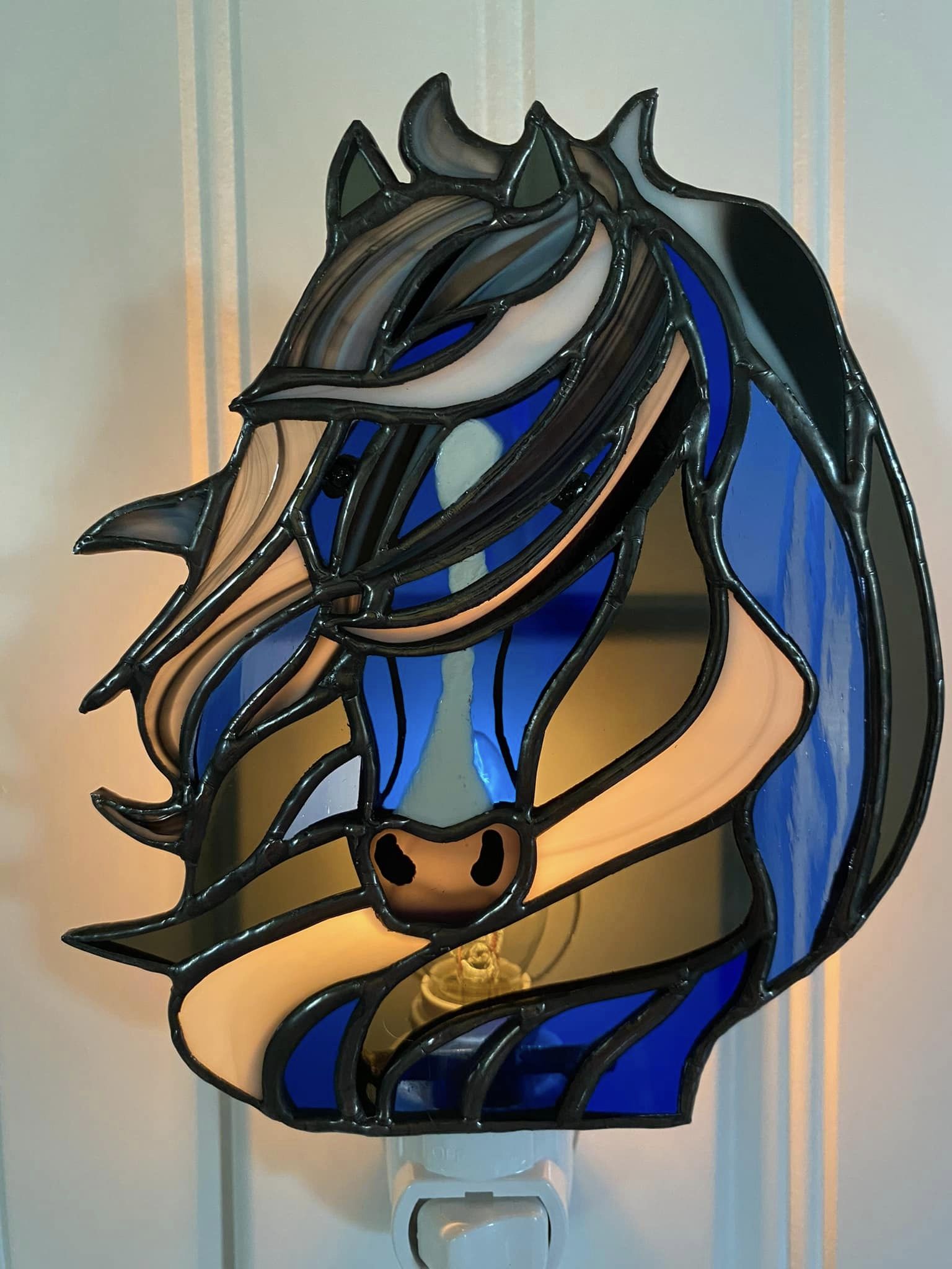 This nightlight uses a couple of slight variations on a lovely design by Equine Artglass (with the artist's permission). Some of the pieces are very tiny in this approx. 4.5"w x 5"h creation. The face and eyes are hand-painted with Pebeo 160 glass paint, then heat treated for permanence. Customize the colors to your liking using the Pre-order Form.