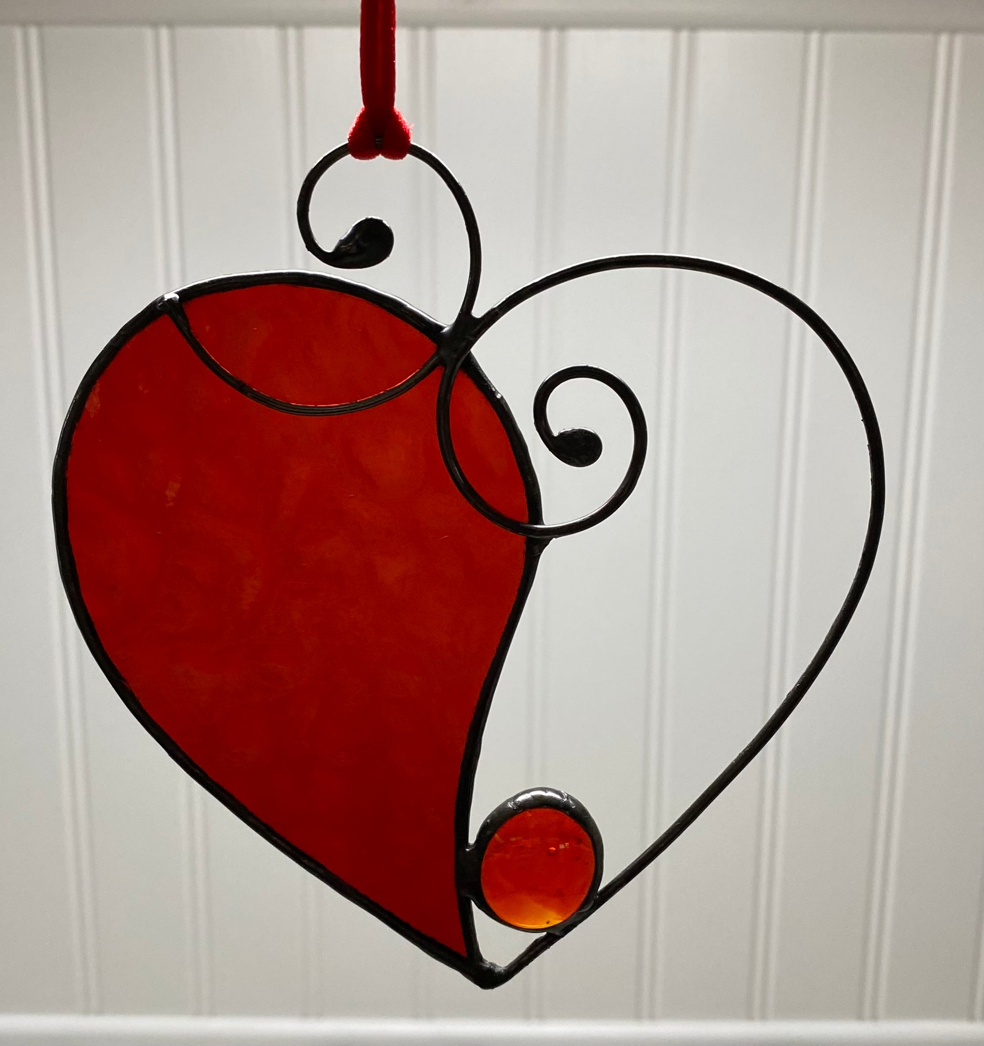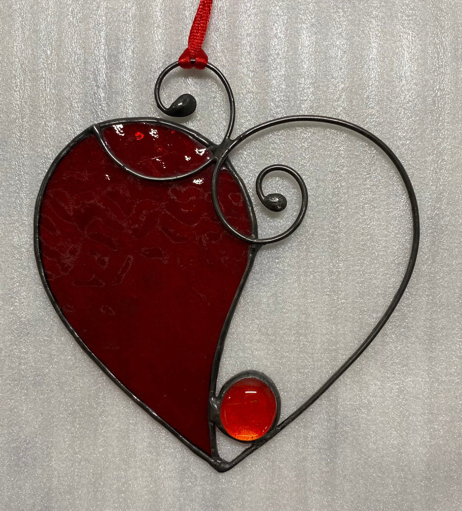 This approx 4.5”x 4.5” heart displays Manchester Red English Muffle glass by Wissmach and a single red glass nugget cradled in 12 gauge decorative wire for the right side of the heart.