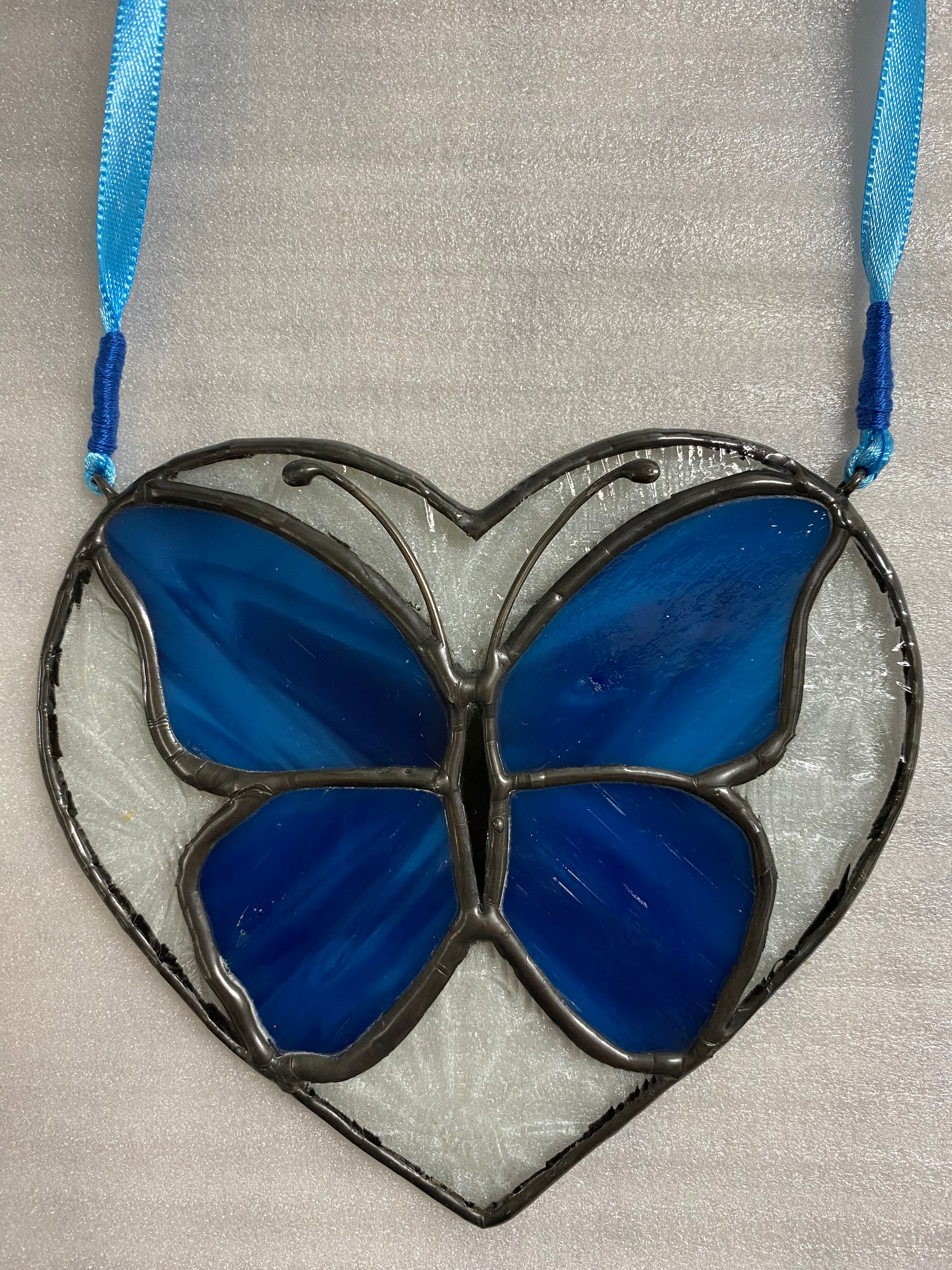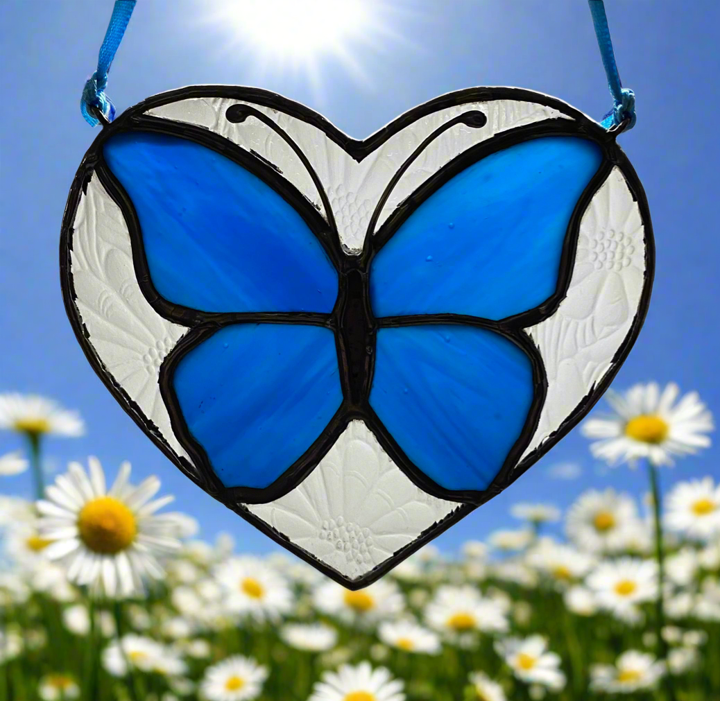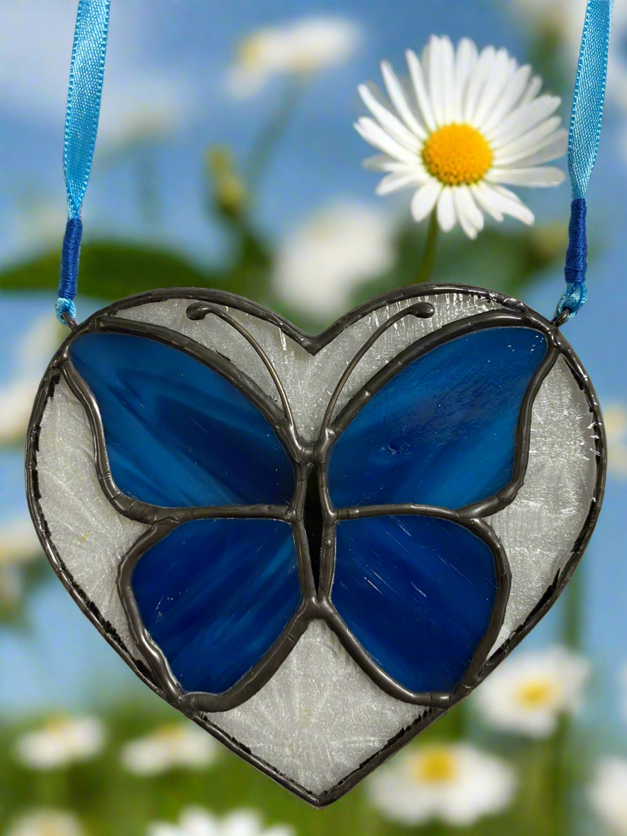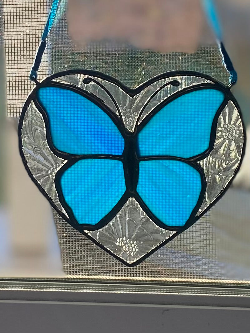 This approx 4.5”x 4.5” heart showcases a clear glass imprinted with a daisy pattern surrounding a beautiful butterfly of Kokomo cobalt blue.