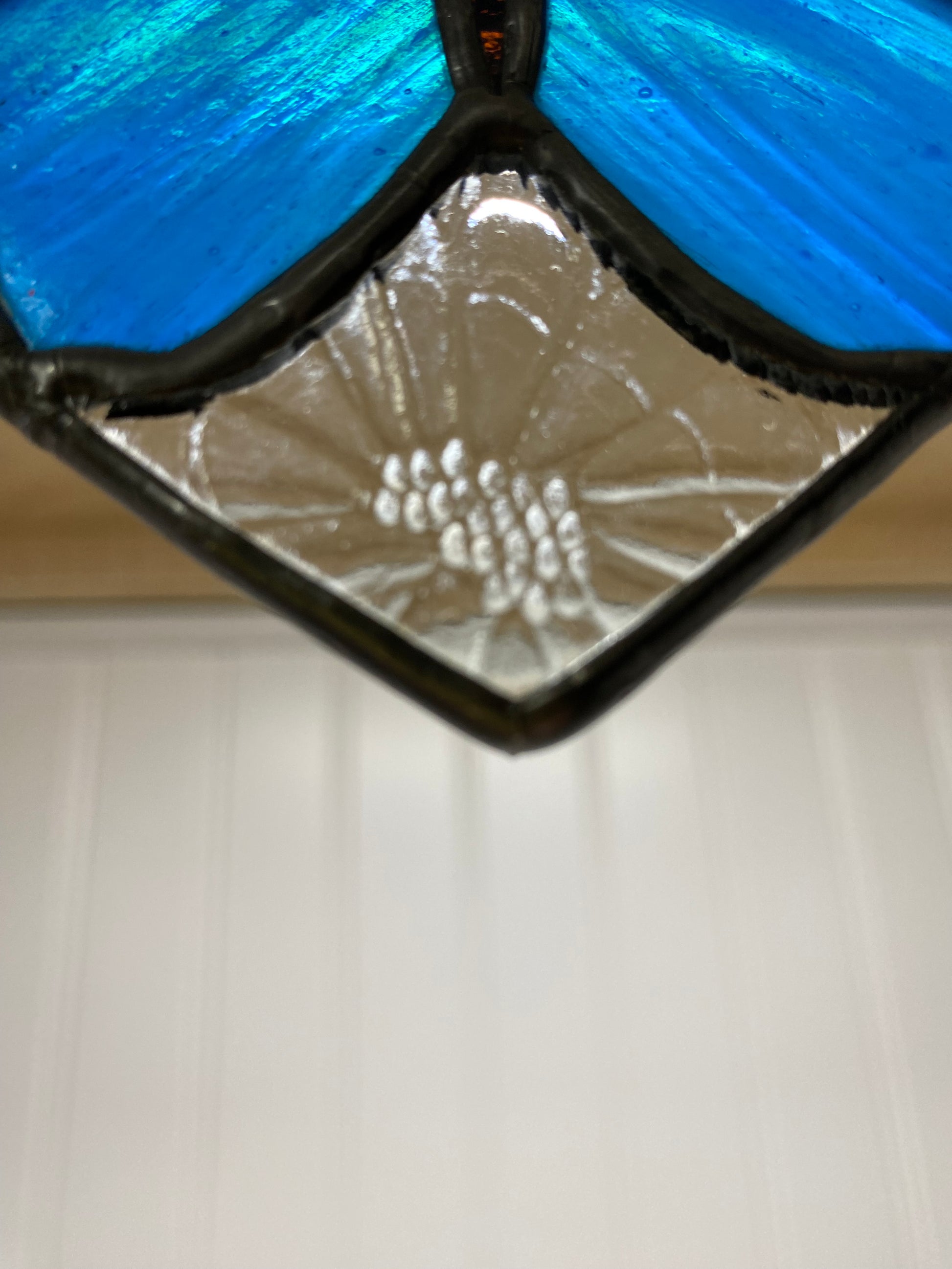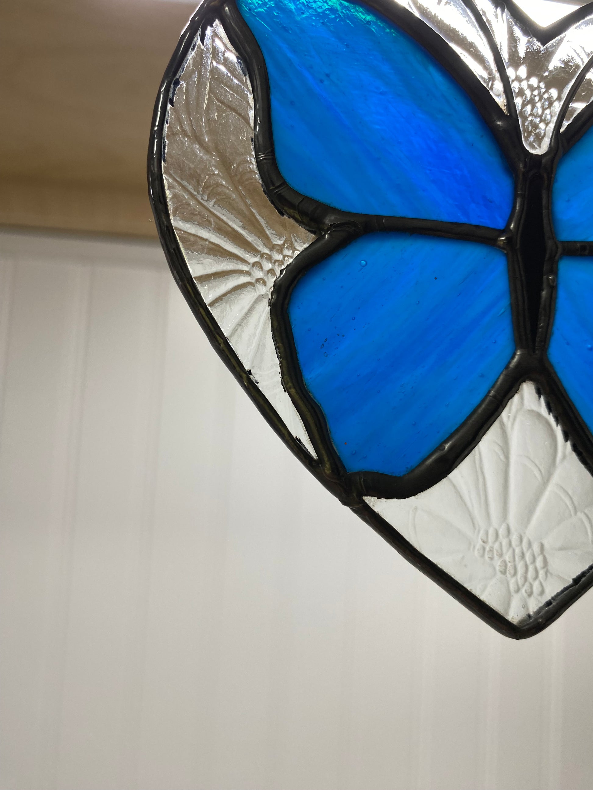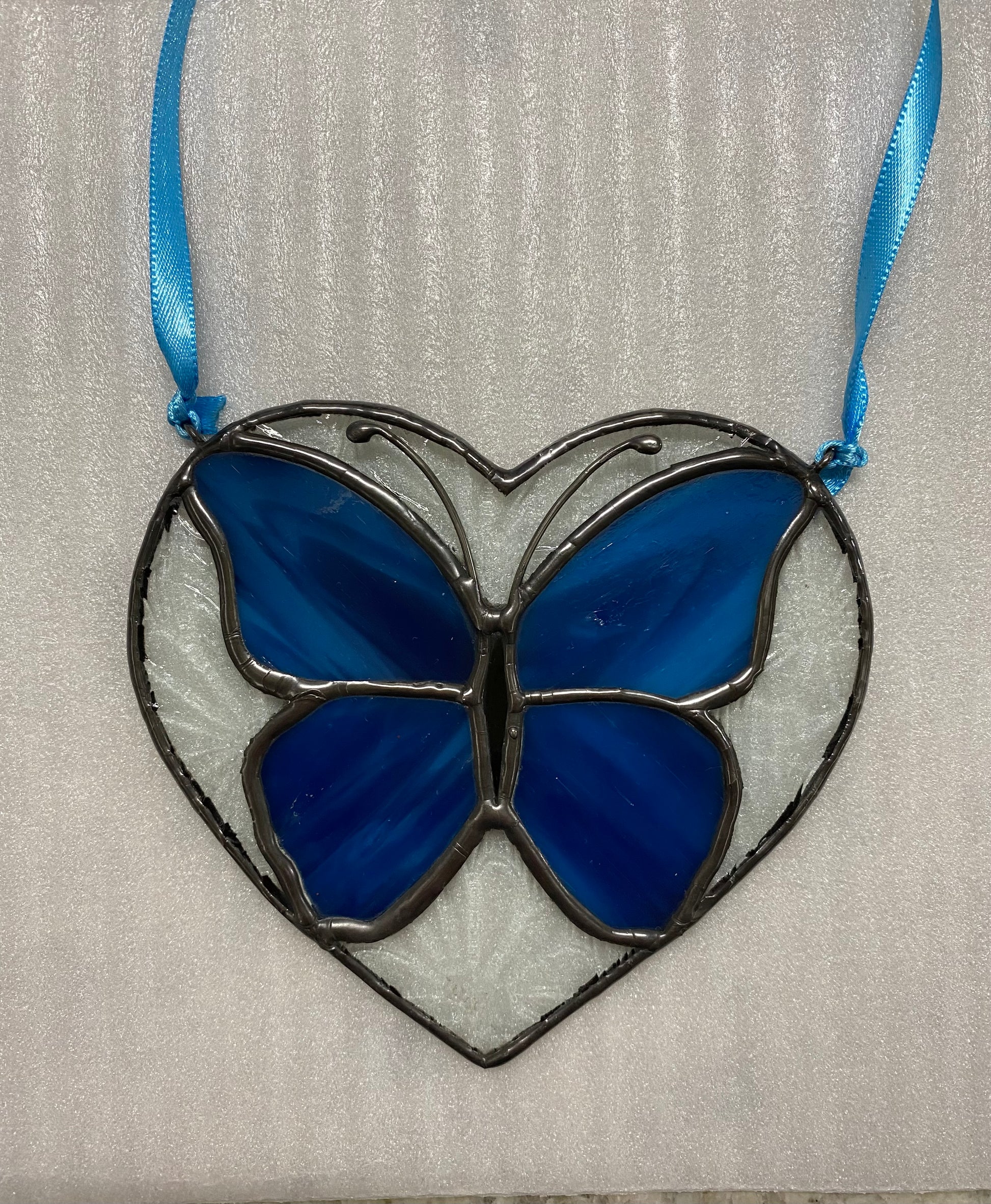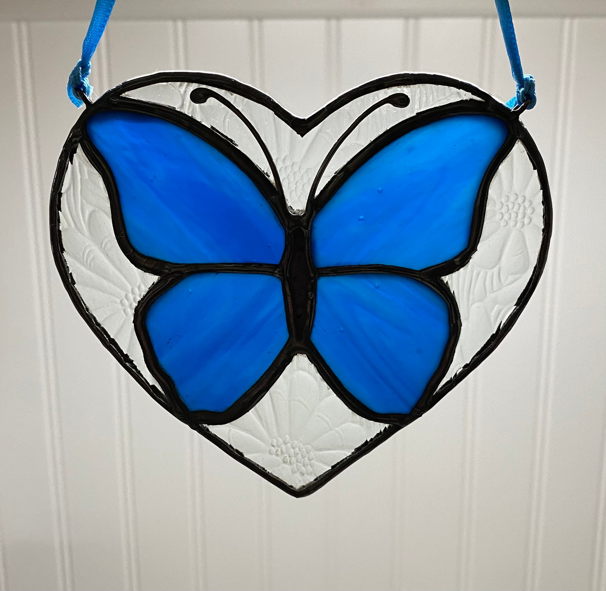 This approx 4.5”x 4.5” heart showcases a clear glass imprinted with a daisy pattern surrounding a beautiful butterfly of Kokomo cobalt blue.