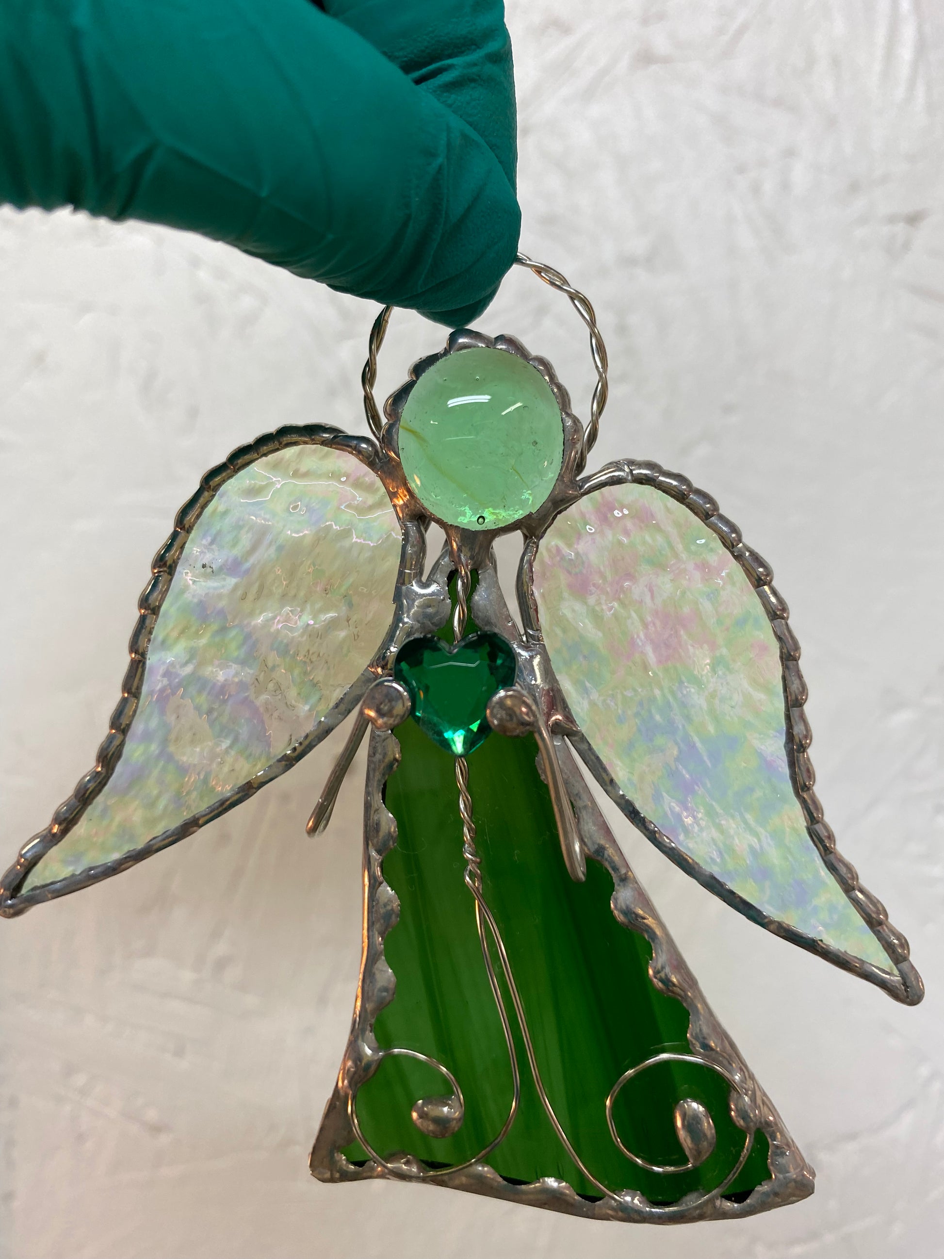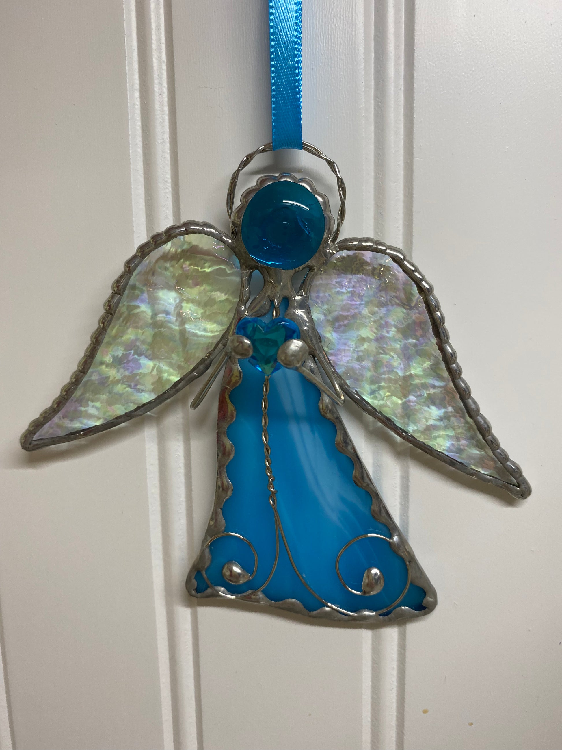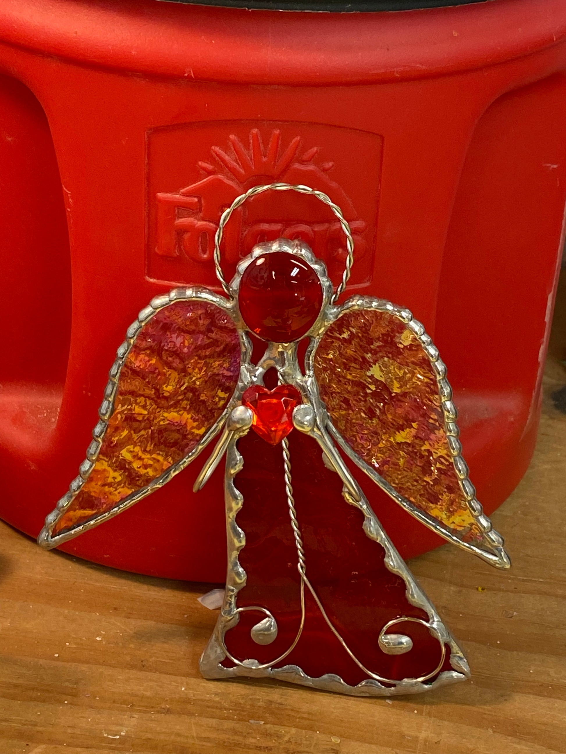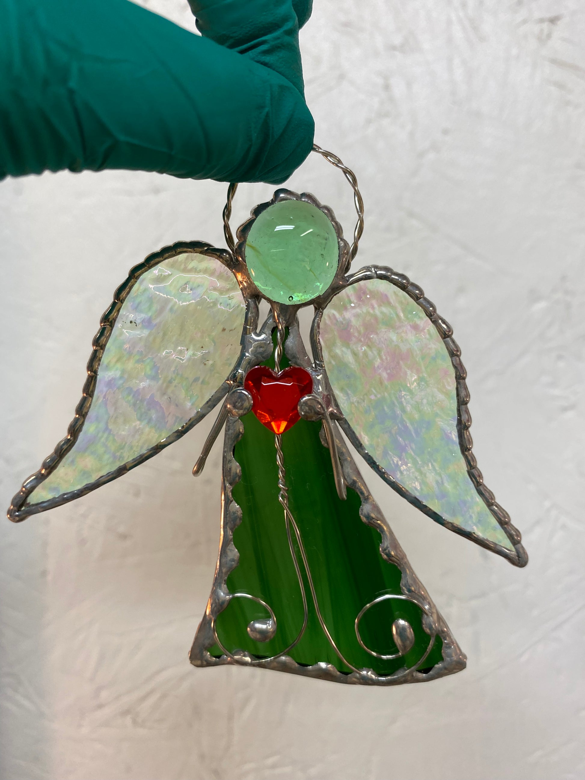 Each angel ornament is made with pieces of clear iridized glass for the wings, a 3/4” glass nugget for the head, and a single piece of glass (your choice of color from stock) for the body. Constructed using Tiffany’s foil method, a scalloped foil is used on the body for additional embellishment. Most of the angels remain with polished silver solder, but patina can be applied for a copper or black outline. Decorative solder techniques are used to create the hair and to embellish the wings. 14 gauge pre-tinned copper wire is used for the arms, and the tiny hands hold between them an acrylic colored heart. Finally, 16 gauge wire is used to create the halo and to embellish the robe. There is a variety of colored ribbon and string available to choose from for hanging your angel. Finished size: Approx. 4.5"x 4.5"
