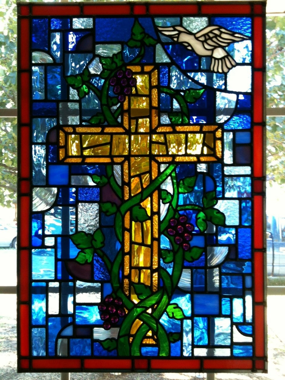 This one…. This 16.5”x 25.5” Cross and Dove panel is my favorite of all the pieces I’ve ever made. It has 24 purple 3/4” glass nuggets for the grape clusters, 320 individual pieces of glass, several shades and textures of blue cathedral and opalescent glass with a few purple thrown in, yellow and amber cathedral glass for the cross, a green on white wispy for the vine and leaves, a border of orange and dark orange opalescent glass, and a white wispy glass for the Holy Spirit. The light through this piece, both cool and warm as the Holy Spirit descends, just speaks peace.
