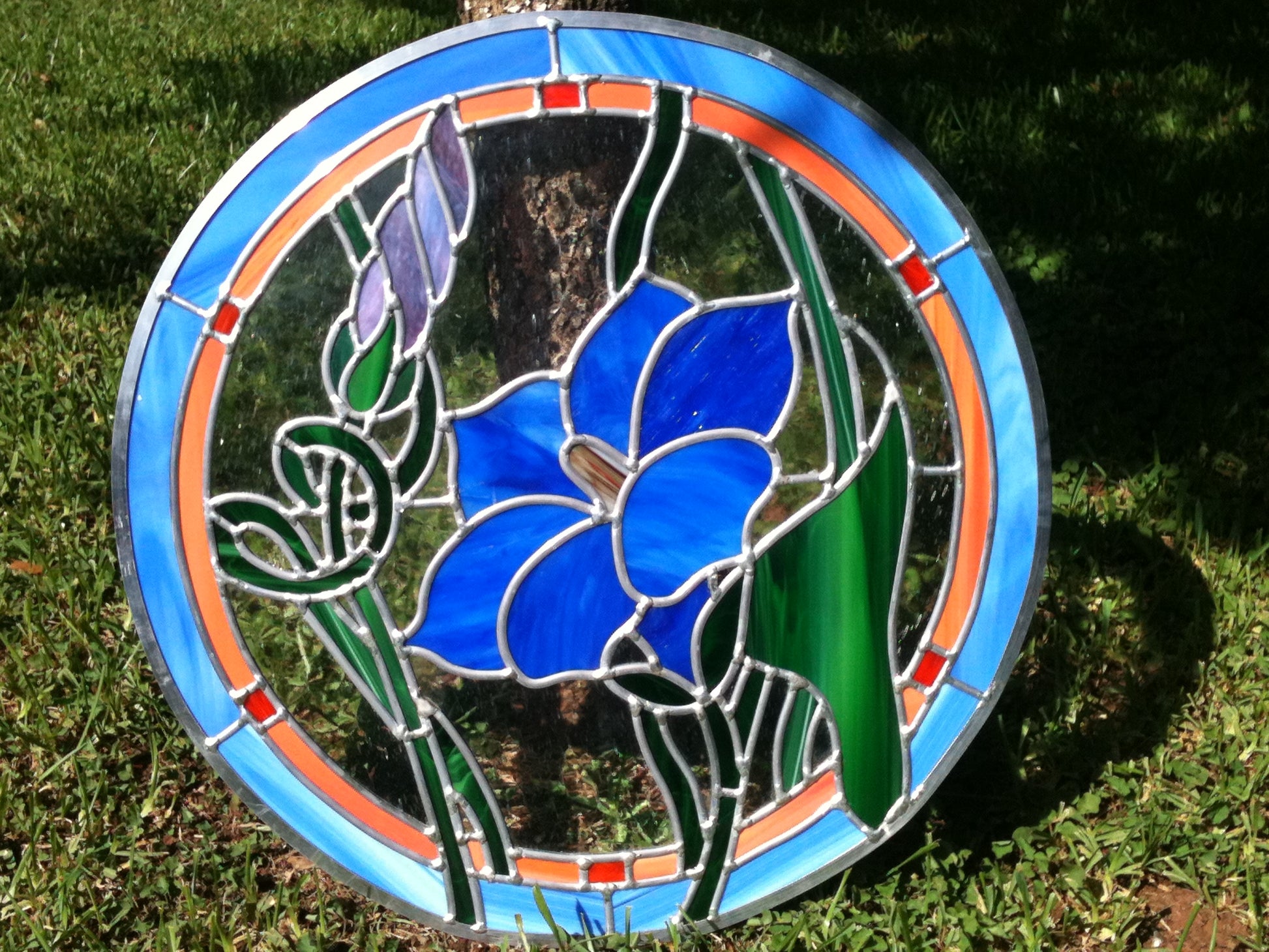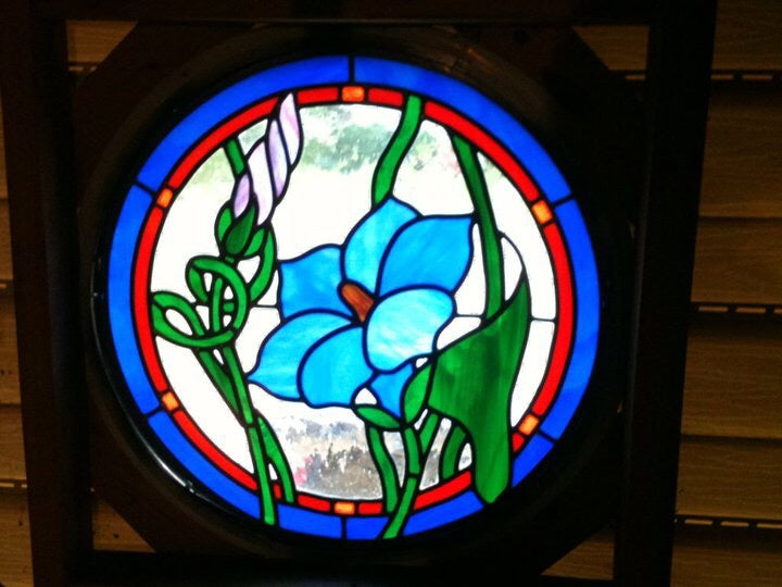 This lovely 22” Round Lily installed window panel features multiple colors of opalescent glass with a clear textured background. Price listed is not installed. It can also be made as a hanging panel.