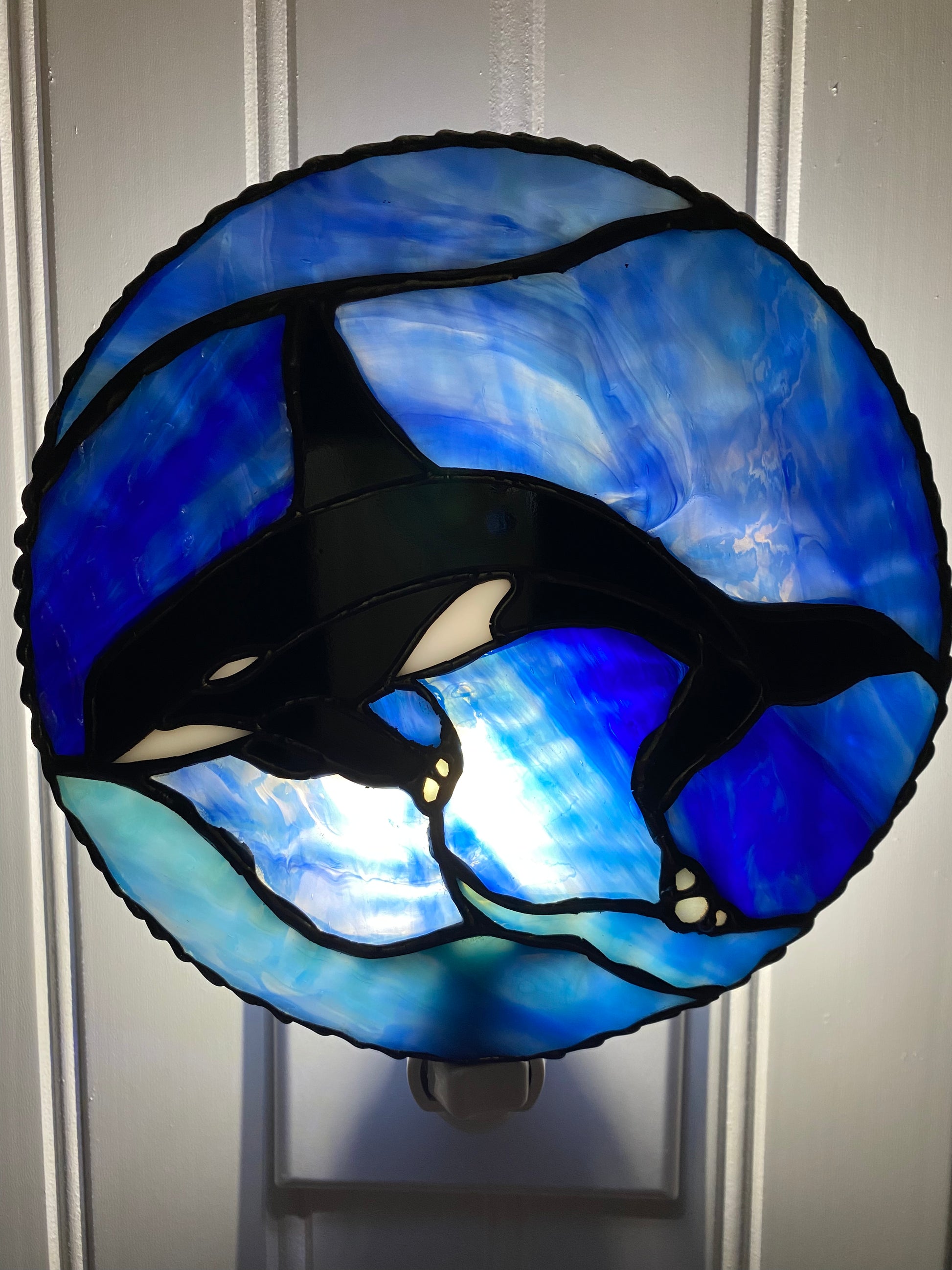 This nightlight measures approximately 5" in diameter, and uses a special white bulb to make the blues really pop. Decorative solder makes a pretty edge around the outside of the water surrounding this lovely orca.