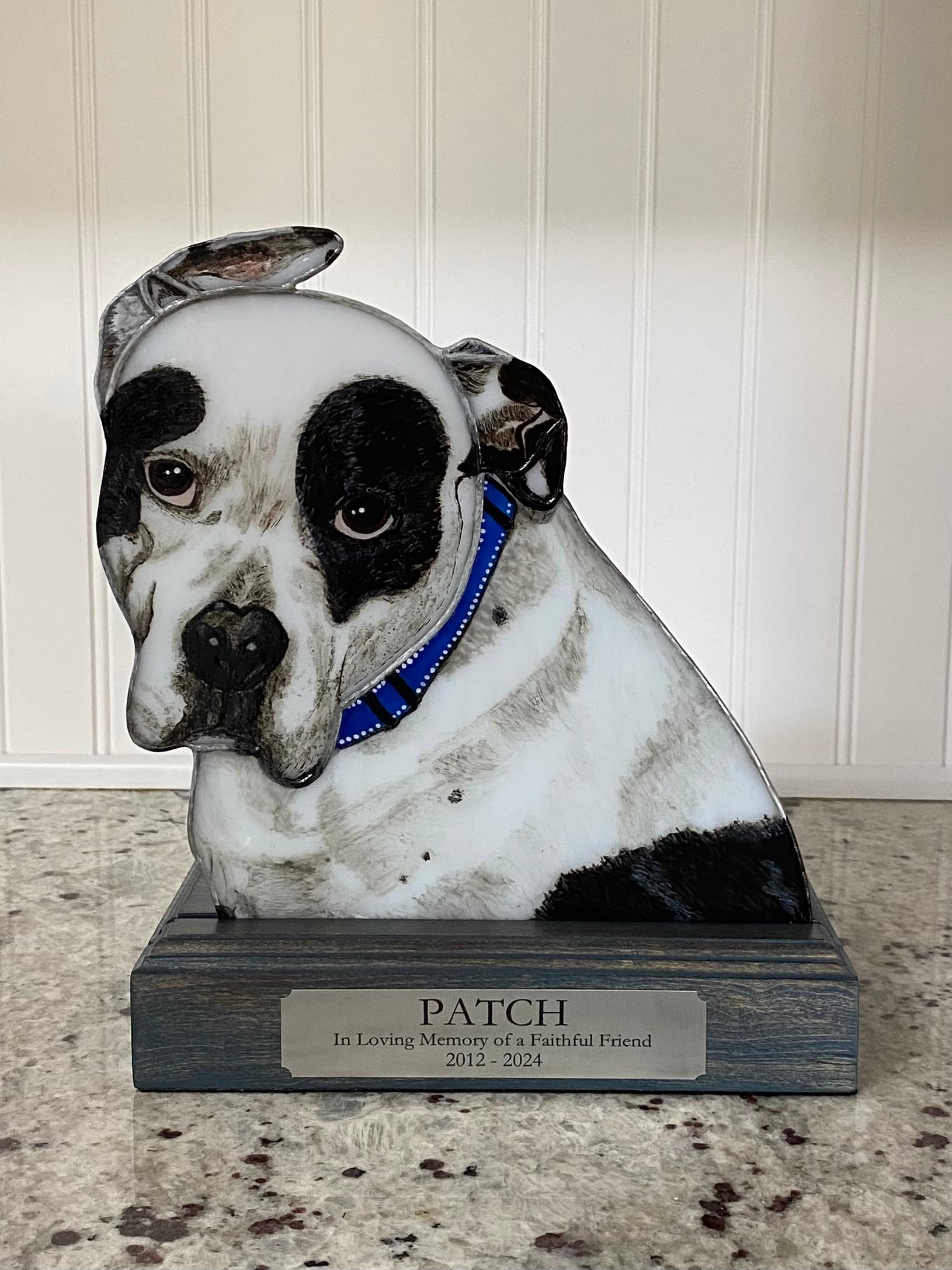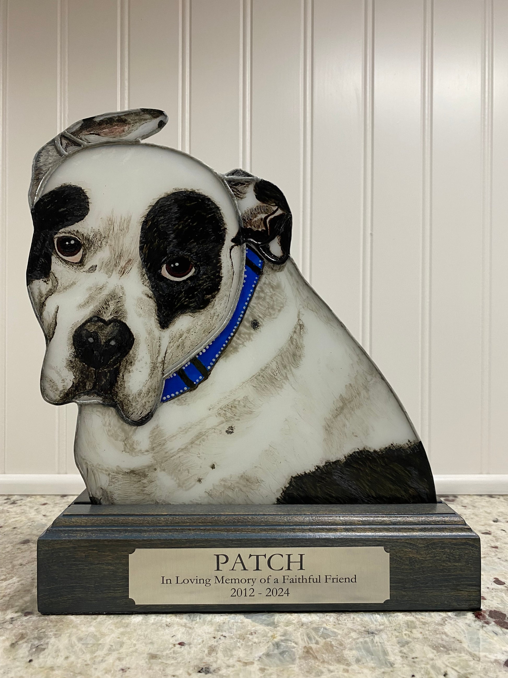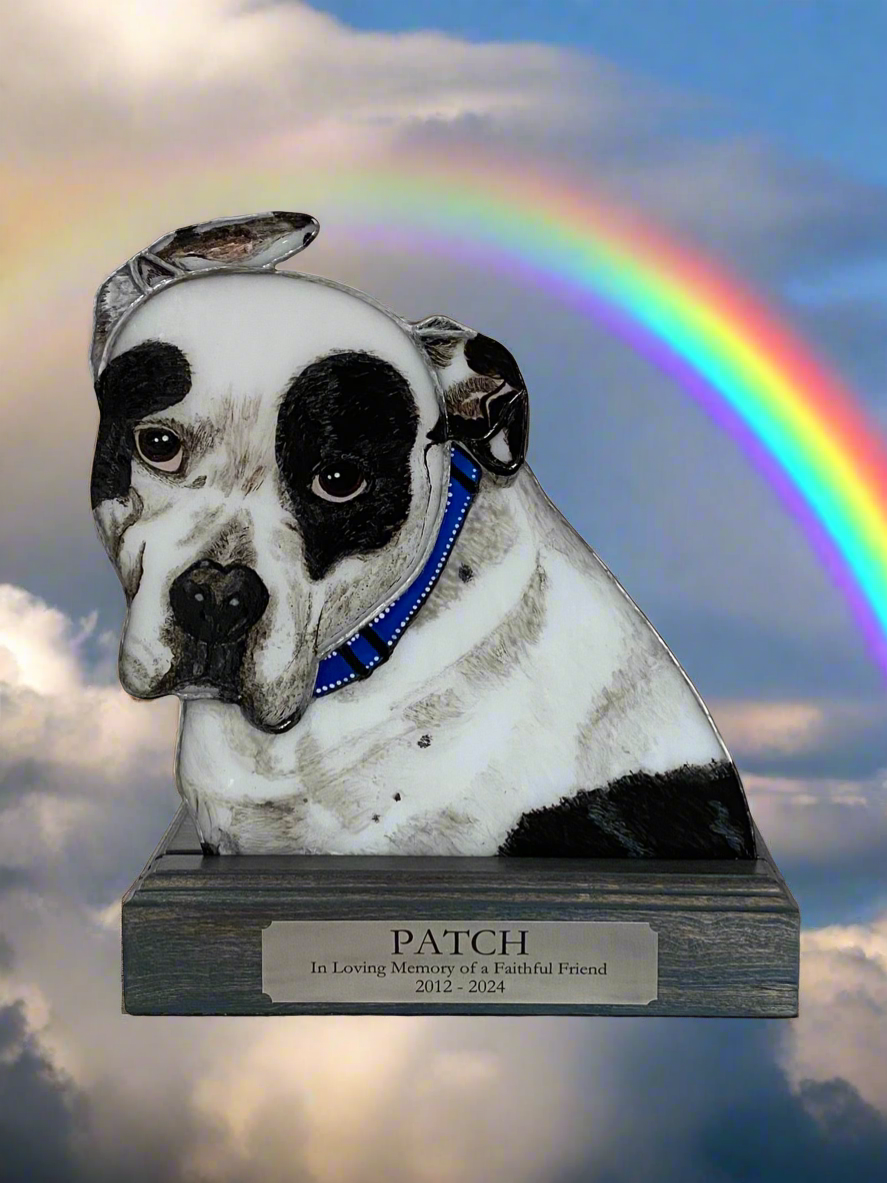 Every fur baby is special - they are members of our families. It’s impossible to forget a dog (or any pet) who gave you so much to remember. This hand painted pet portrait is created with many layers and heat treated after each layer to produce intricate detail for a lasting memorial to the life of a faithful companion. Provide a photo of your pet for a one-of-a-kind portrait.