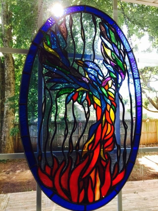 This Phoenix features fire glass and then cathedral glass moving from warm to cool as you move up the piece. Light through the piece creates a blaze of color.