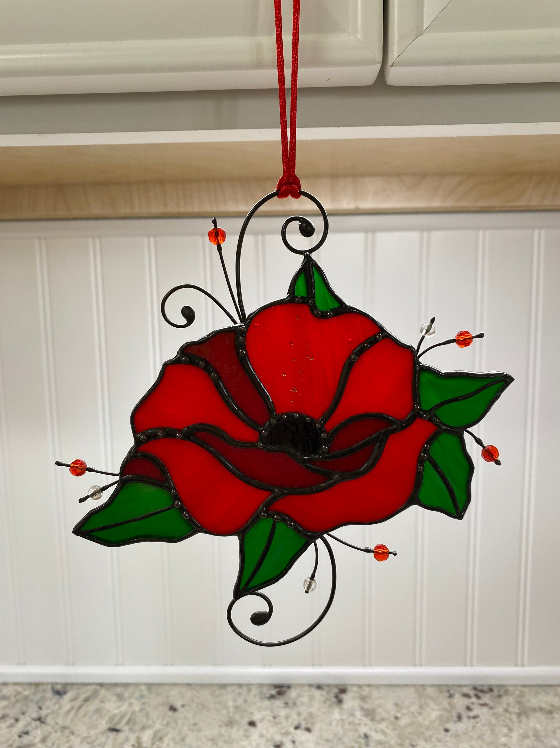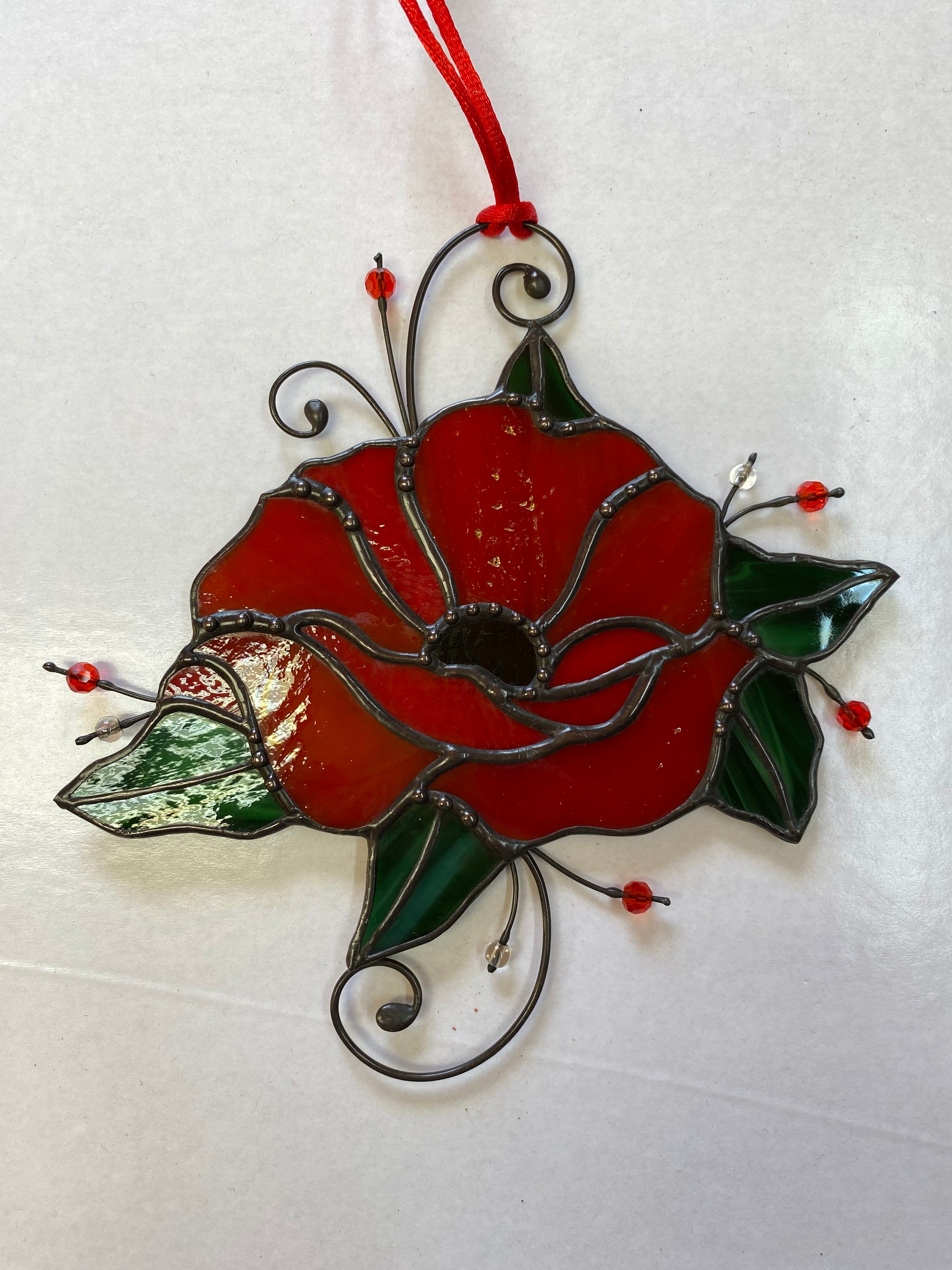 For those who adore red poppies, this suncatcher showcases the vibrant hues of Wissmach and Bullseye red glass selections, then embellished with specialty solder techniques and elegant wire and bead accents.