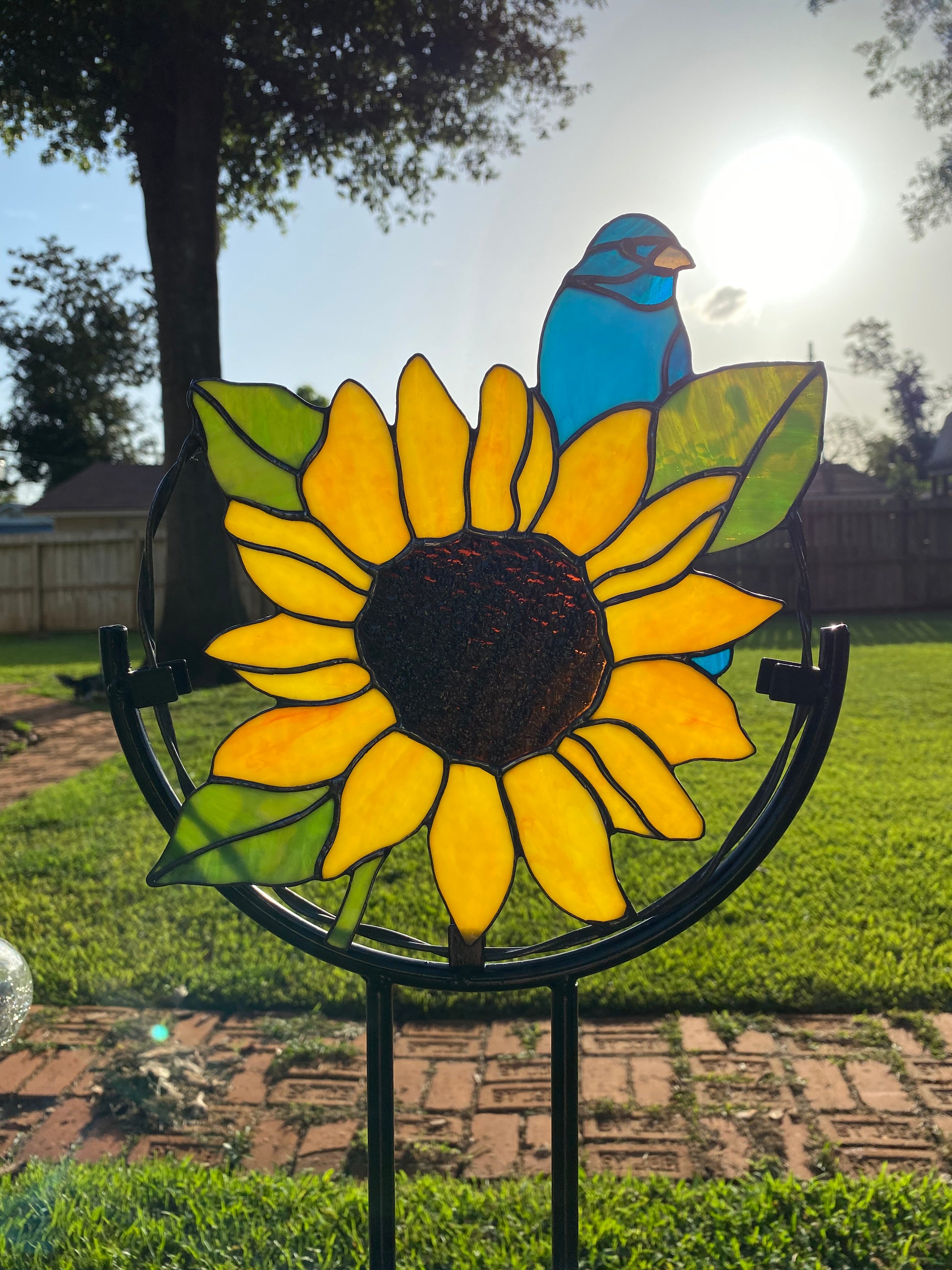 This sunflower suncatcher is attached to a twisted 14 gauge wire on the lower half to allow it to be held by a garden stake. The glasswork features a Kokomo indigo blue wispy, Oceanside yellow granite, and Youghiogheny greens. The price shown does not include the garden stake.