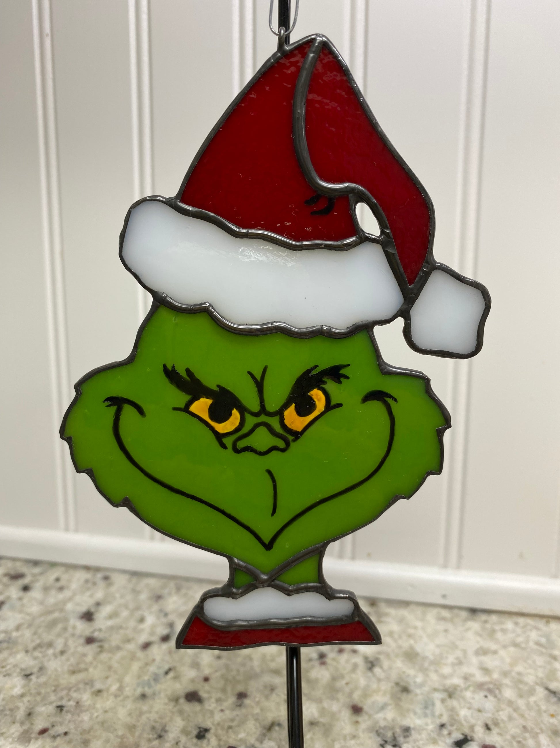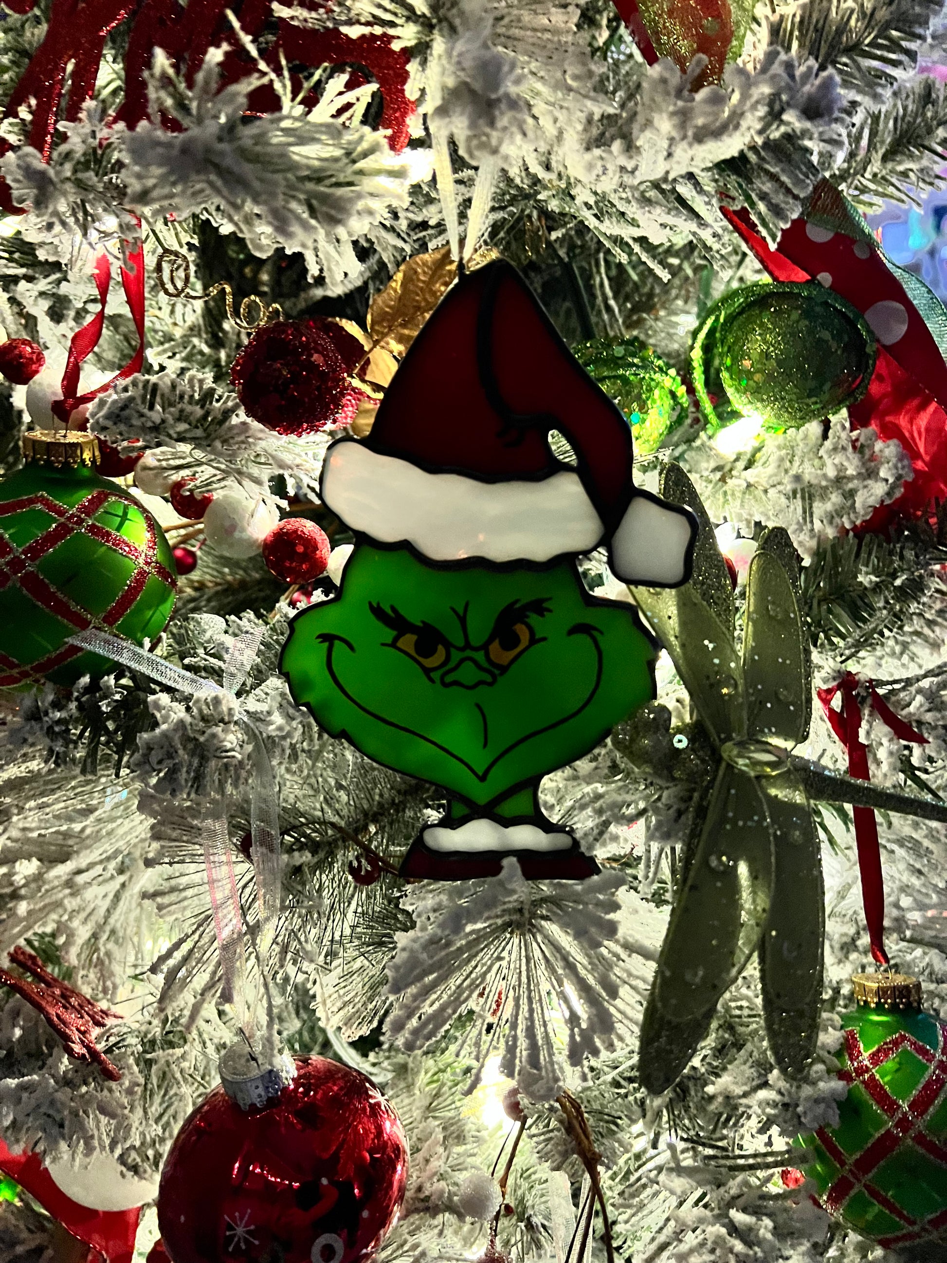 Bring your tree to life with the perfect Wissmach Glass “grinch green" shade, showcasing the beloved Christmas character. The details are hand-painted with Pebeo 160 Vitrea glass paint and heat treated for permanence.