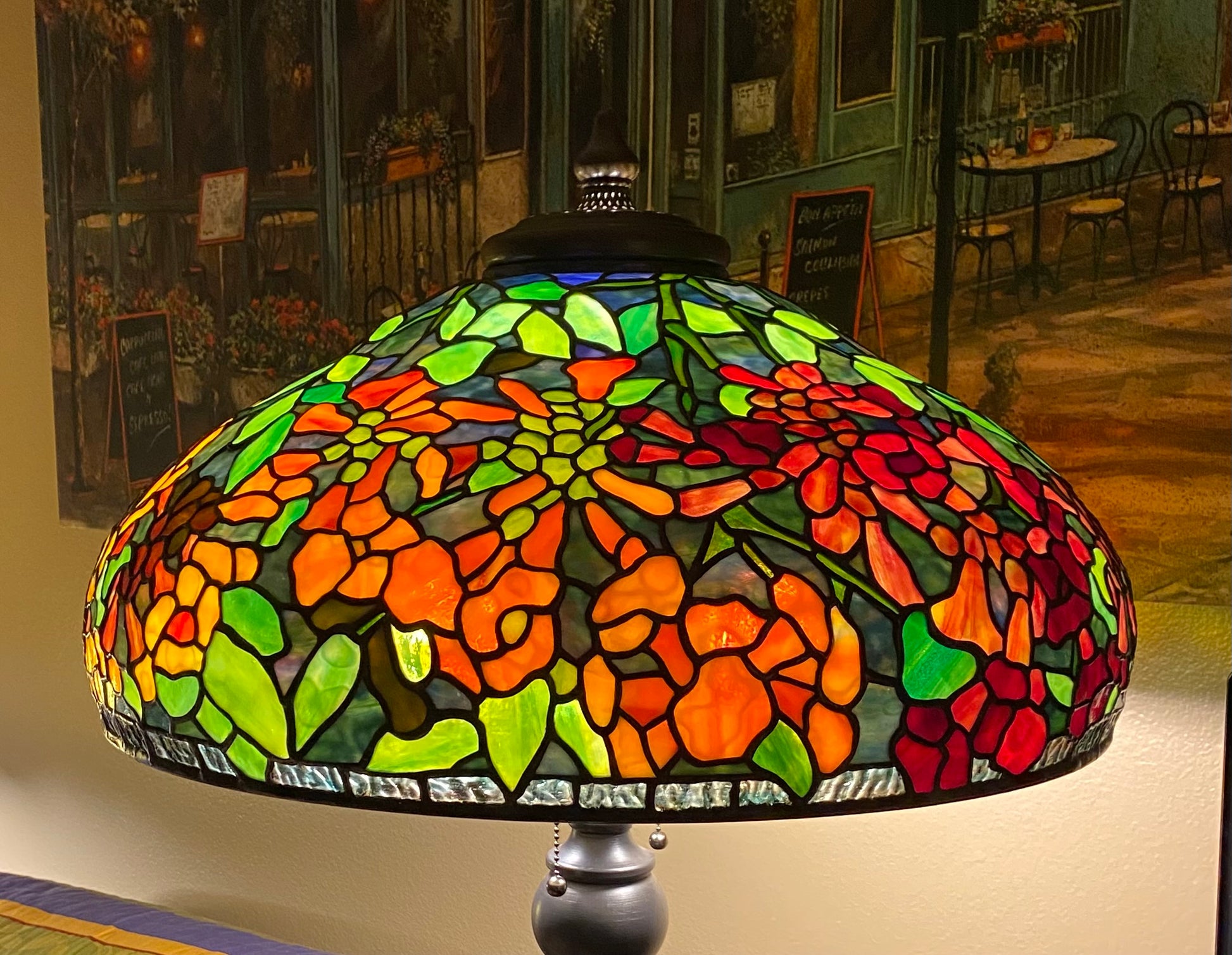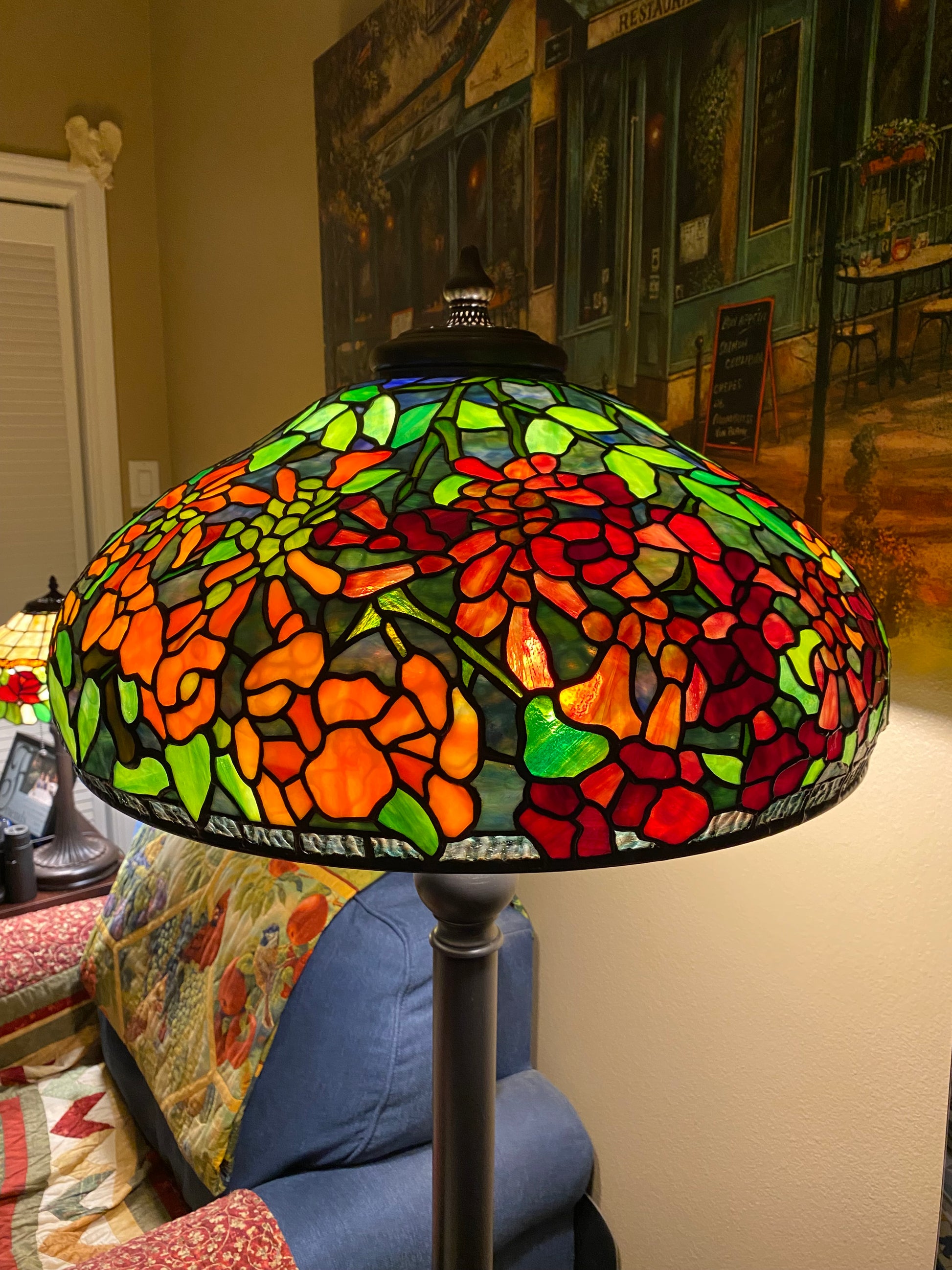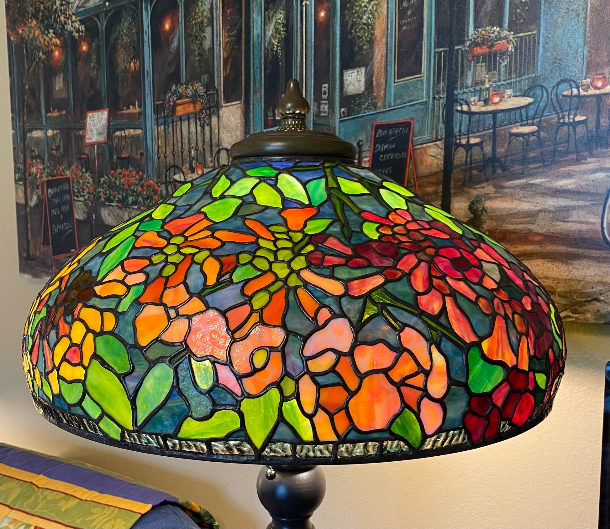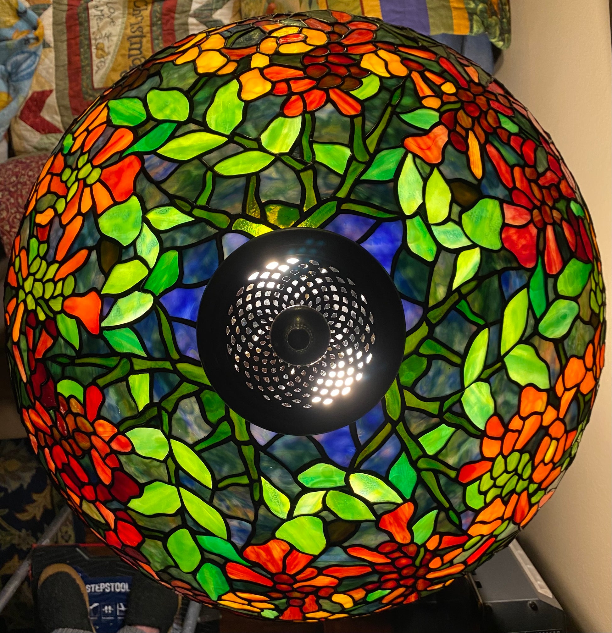 This design contains 987 individual pieces of stained glass, intentionally chosen from sheets of Youghiogheny, Bullseye, and Uroboros glass selections. Each piece is individually cut and then ground to the exact shape, foiled, and placed on an Odyssey mold for soldering. Once soldered and removed from the mold, the inside is soldered, reinforcement wire is applied in three places from ring to rim, and a solid brass ring is soldered around the bottom. Every piece of glass is different, so a lamp pre-ordered will be completely unique even with similar glass choices to those shown here.