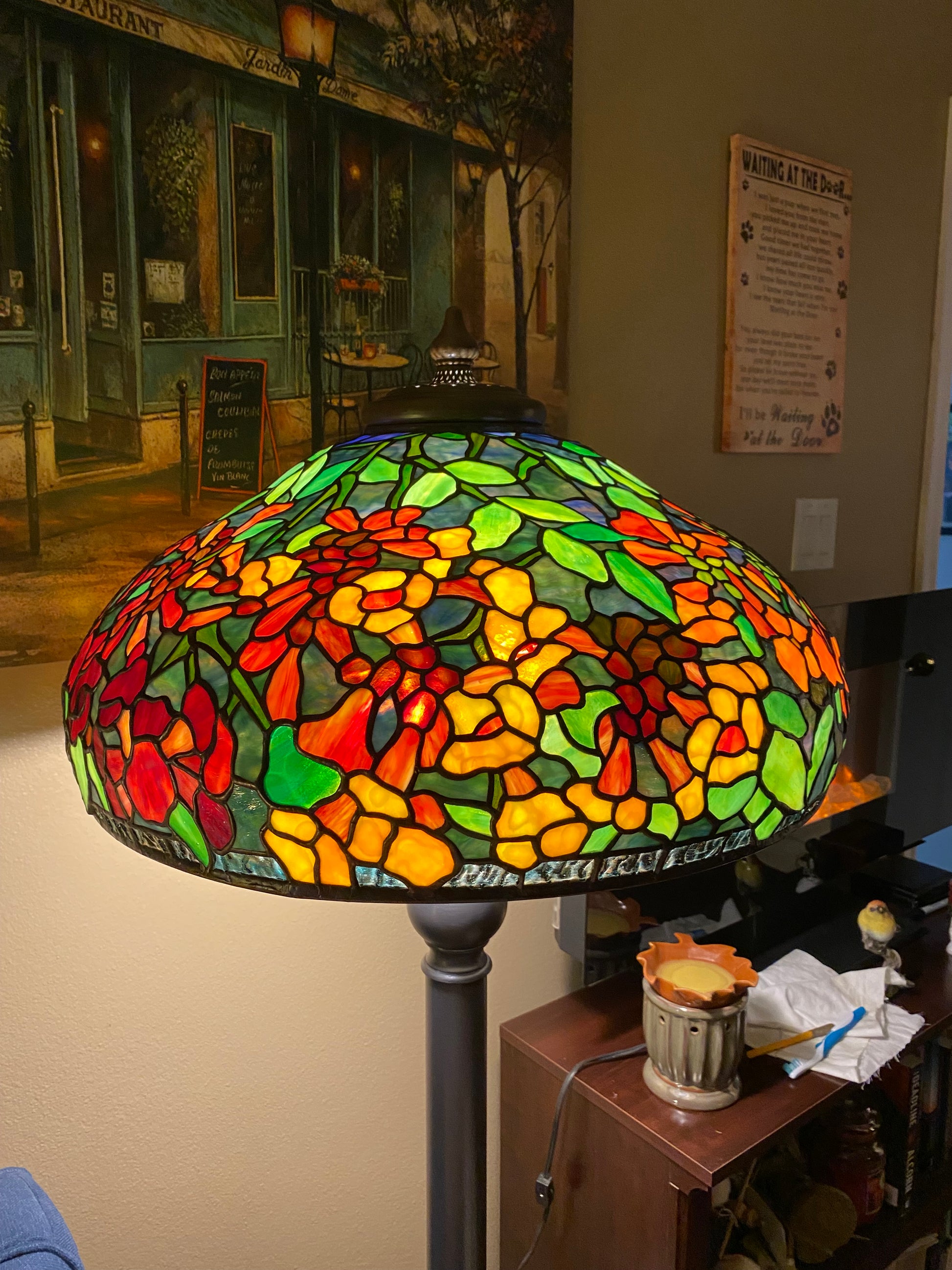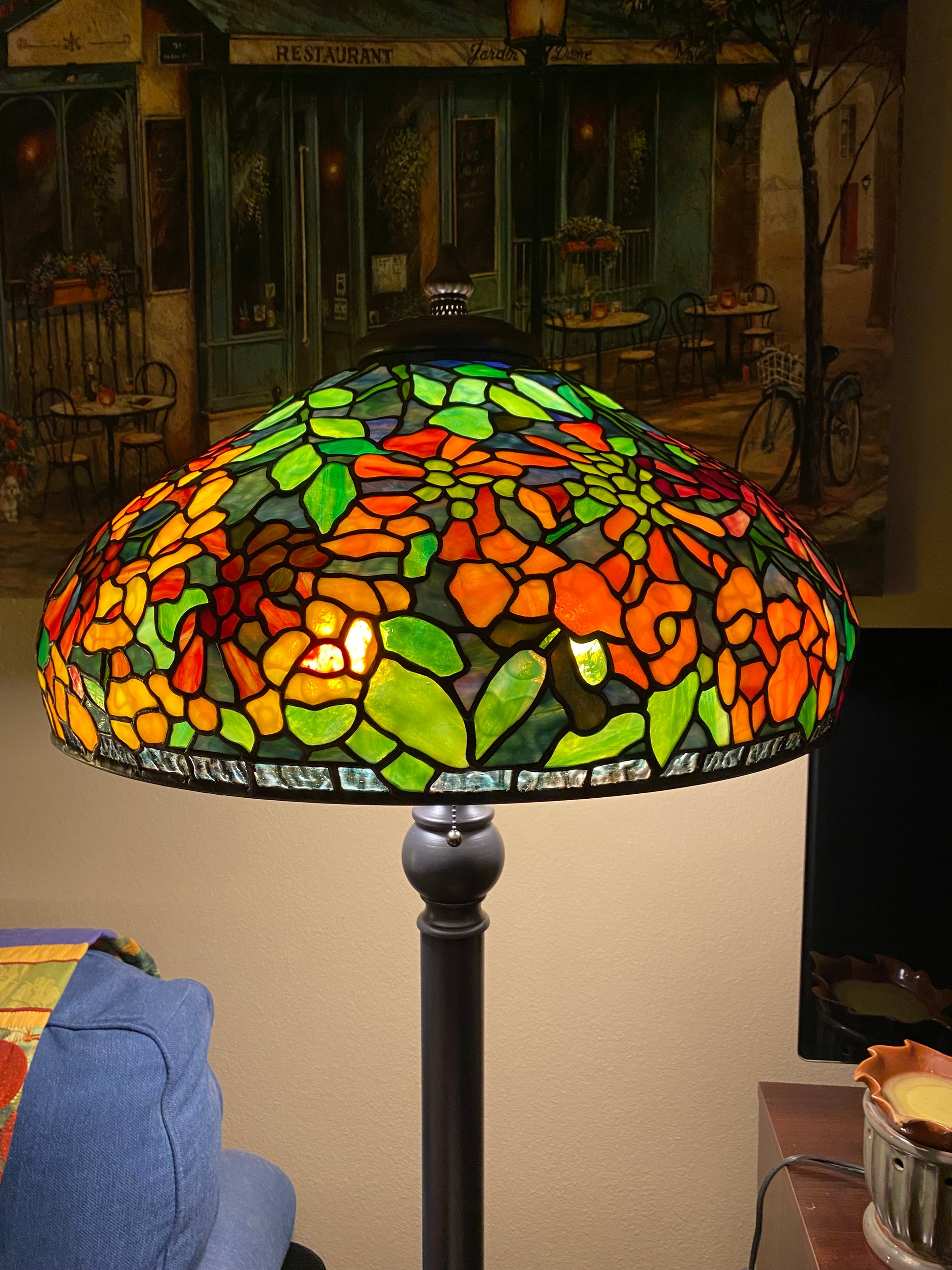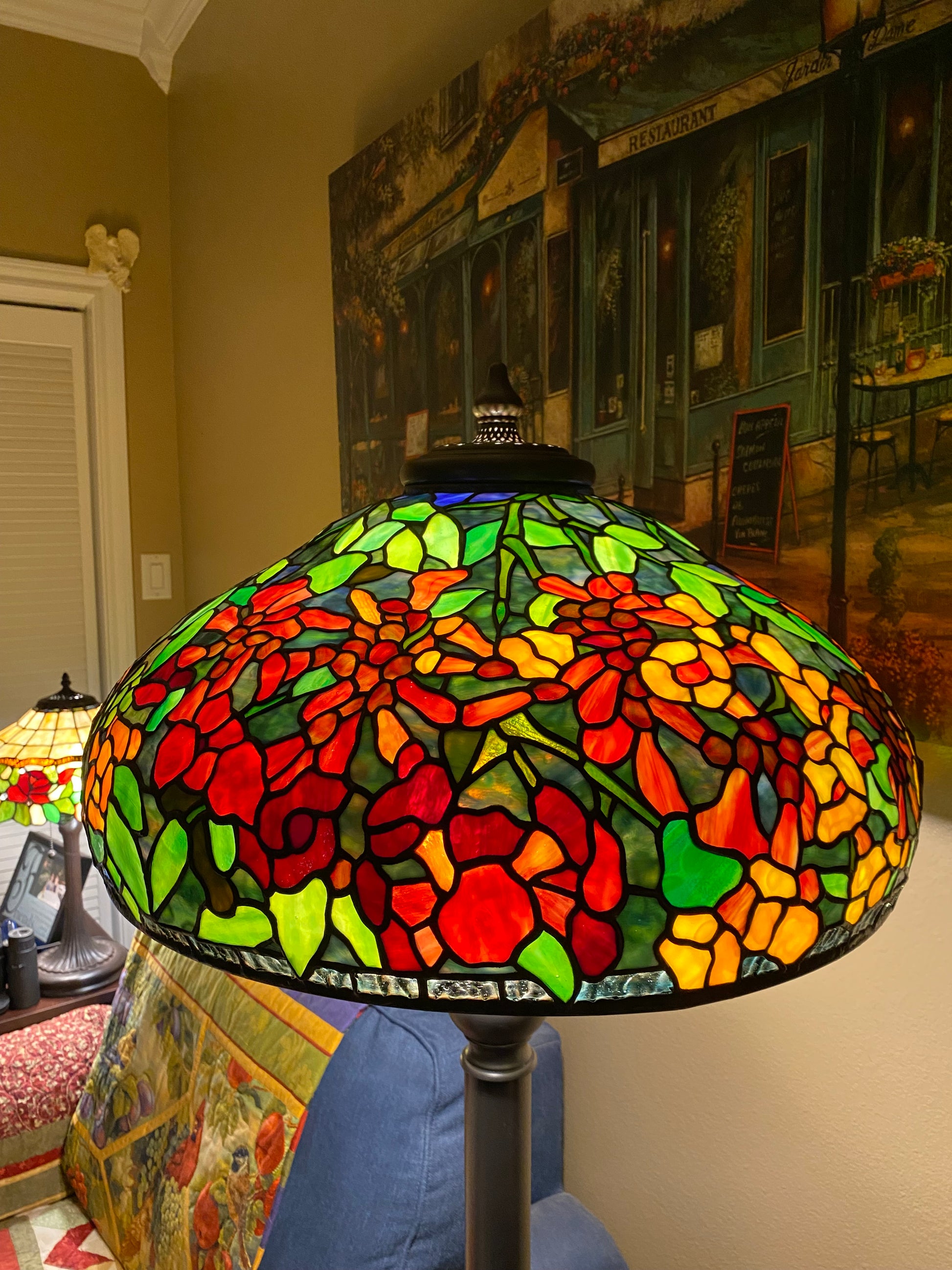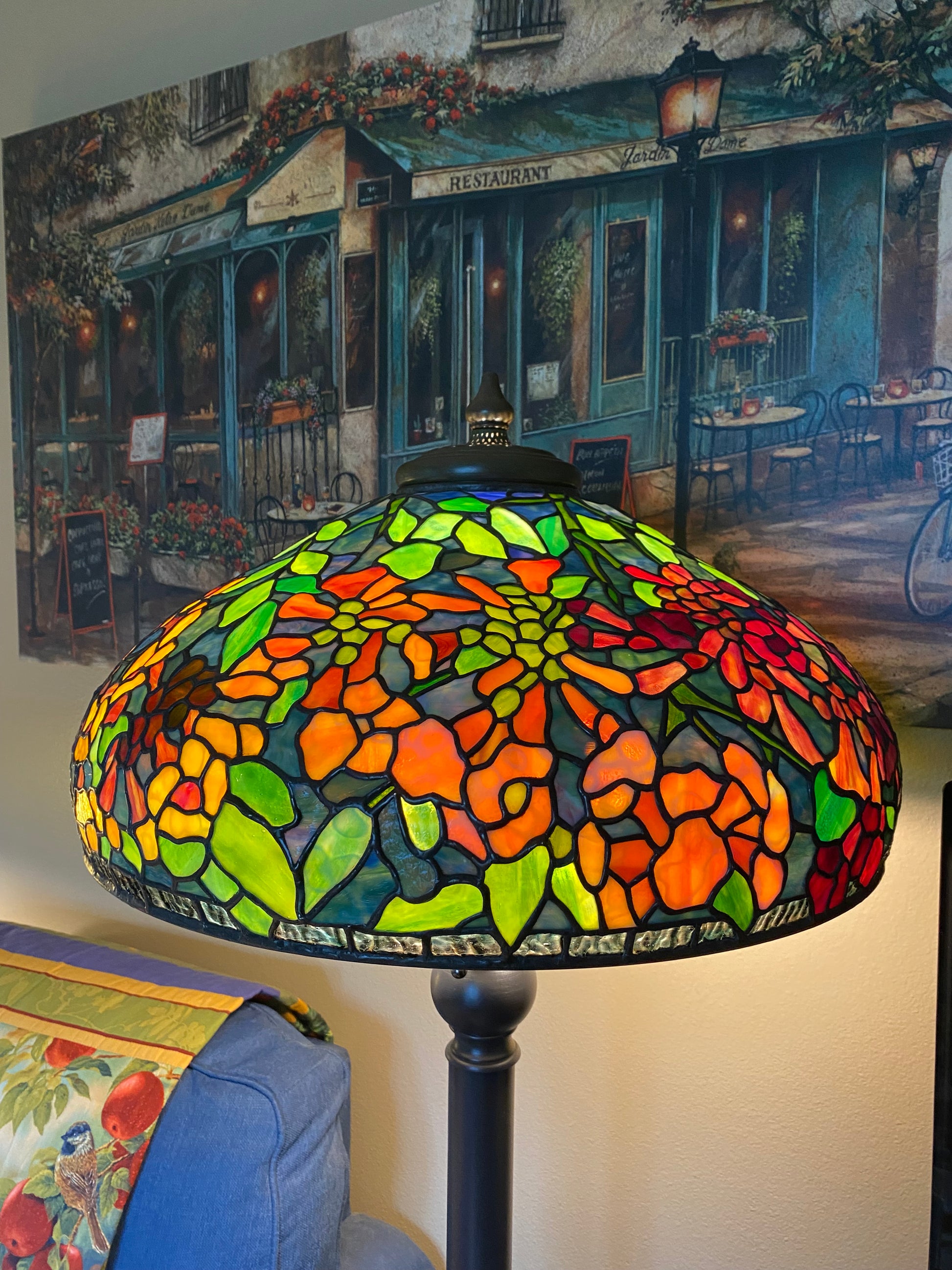 This design contains 987 individual pieces of stained glass, intentionally chosen from sheets of Youghiogheny, Bullseye, and Uroboros glass selections. Each piece is individually cut and then ground to the exact shape, foiled, and placed on an Odyssey mold for soldering. Once soldered and removed from the mold, the inside is soldered, reinforcement wire is applied in three places from ring to rim, and a solid brass ring is soldered around the bottom. Every piece of glass is different, so a lamp pre-ordered will be completely unique even with similar glass choices to those shown here.