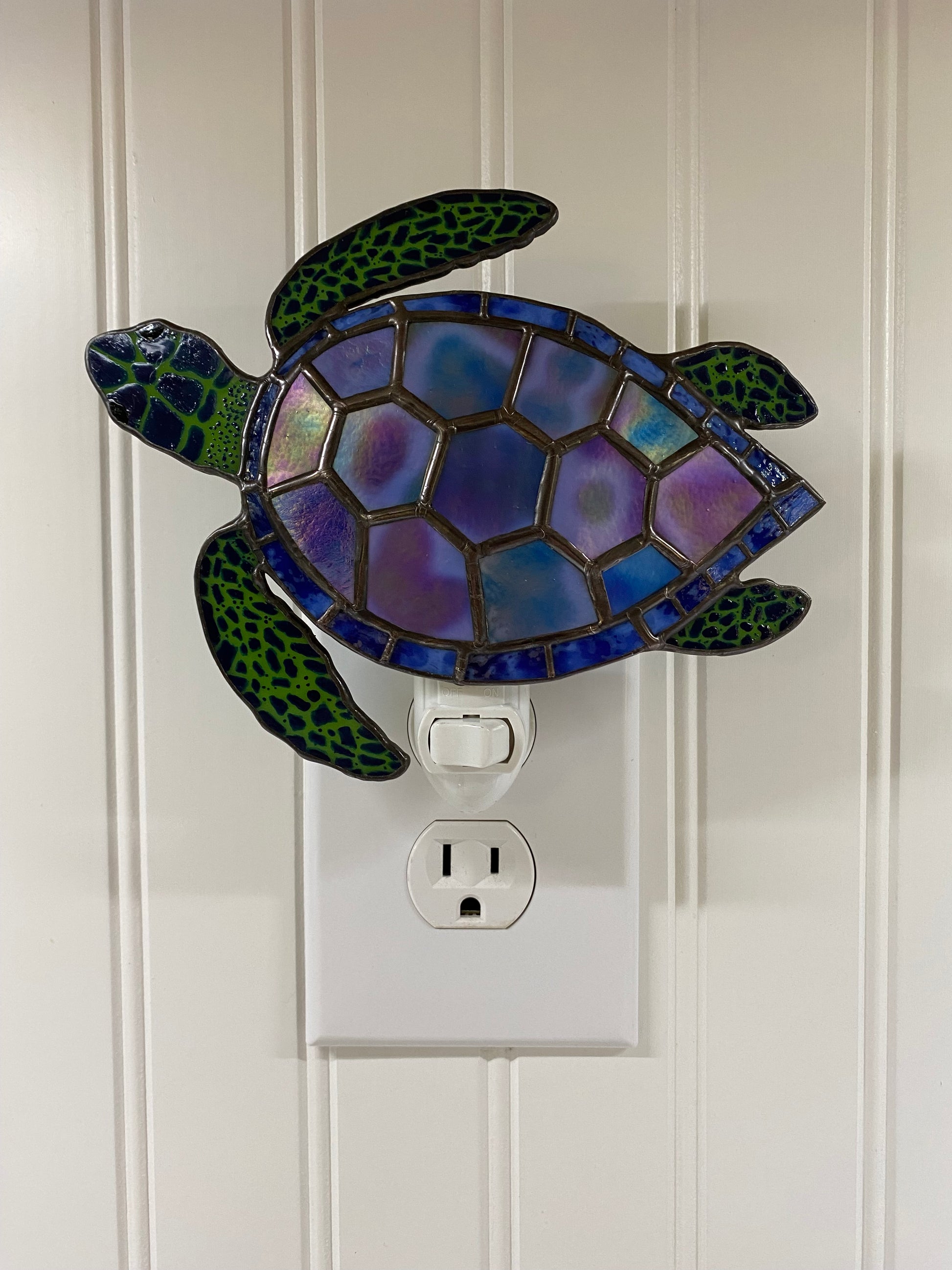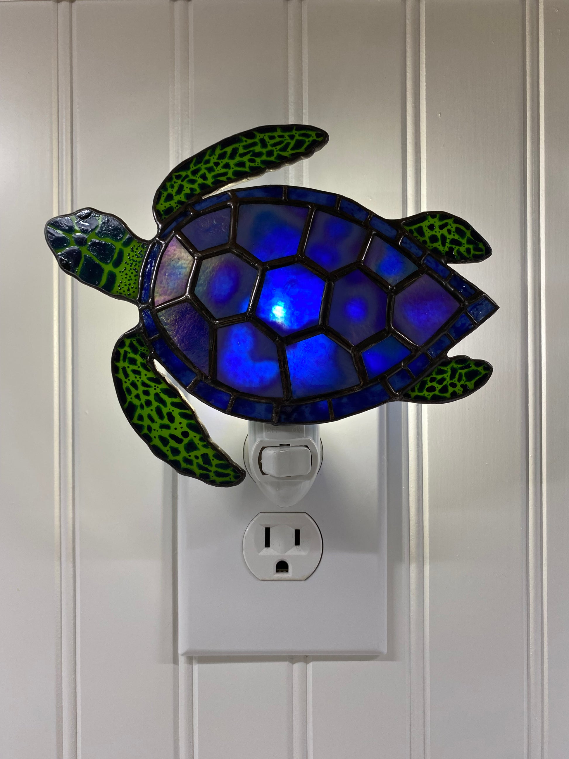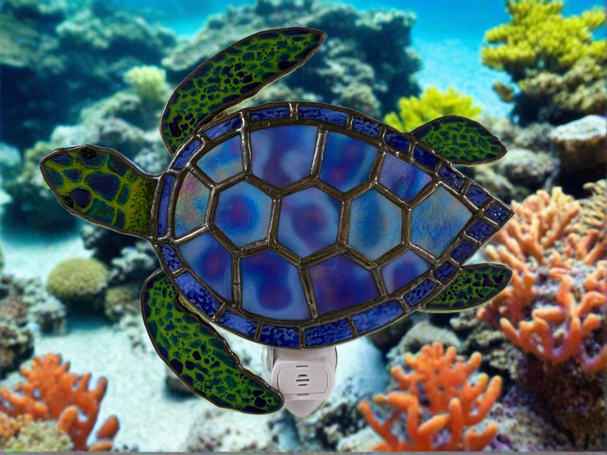 Transform your room into an ocean oasis with our unique sea turtle nightlight, complete with a stunning convex shell crafted from Oceana iridized glass and intricately painted head and fins on rich Wissmach green glass.