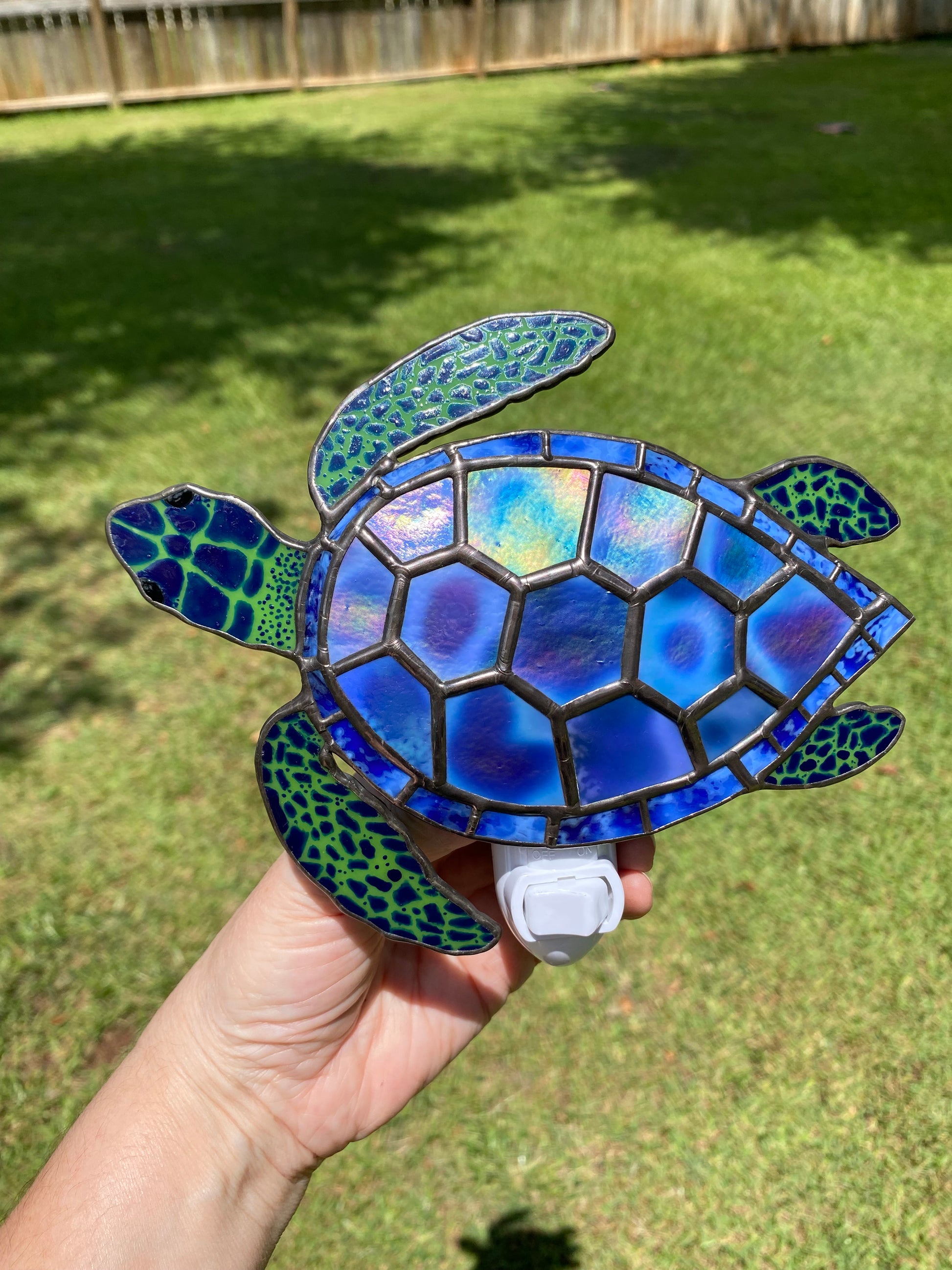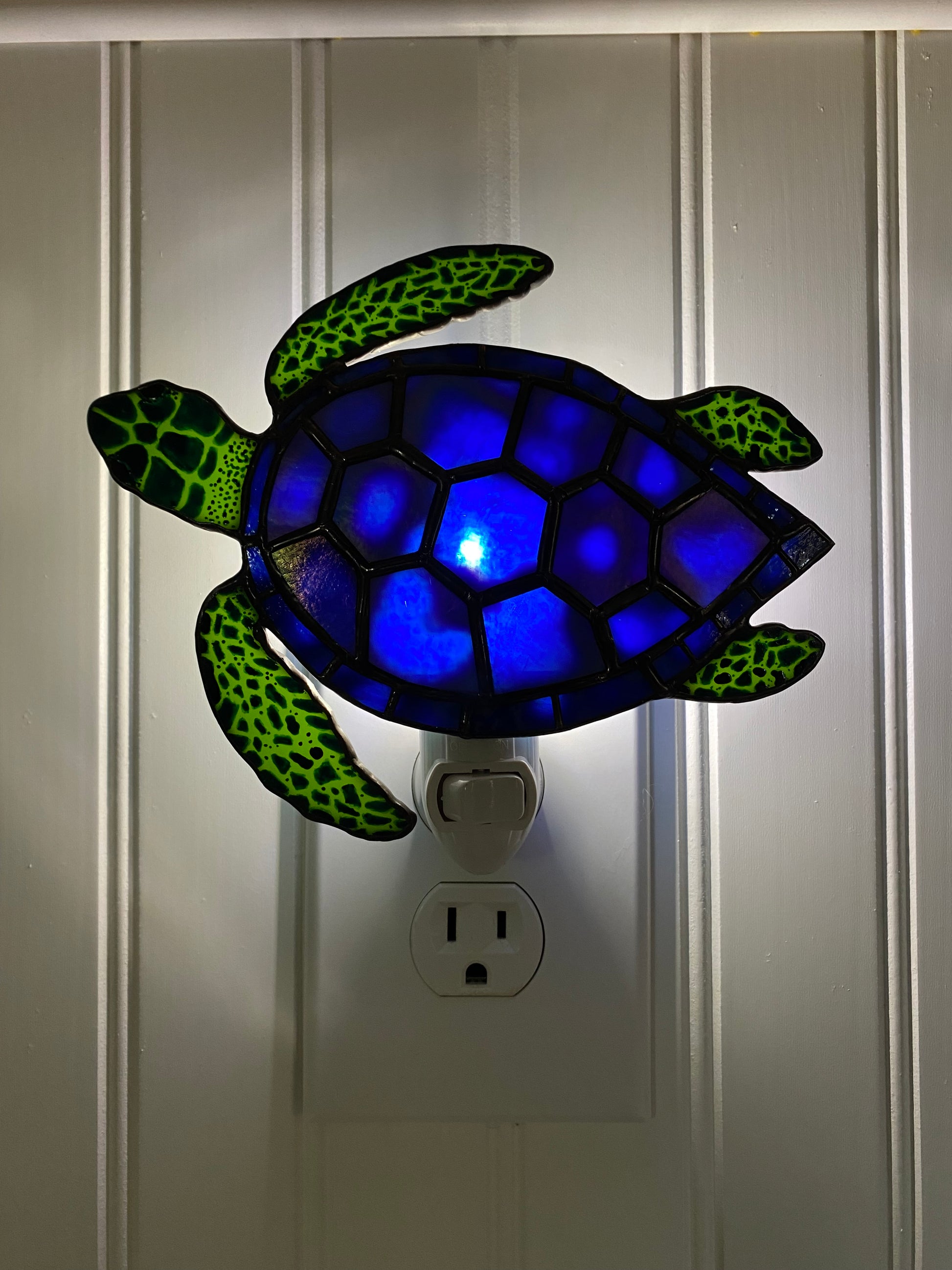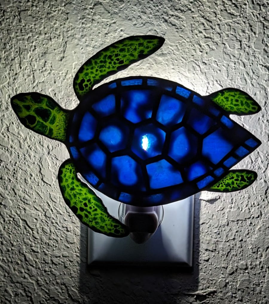 Transform your room into an ocean oasis with our unique sea turtle nightlight, complete with a stunning convex shell crafted from Oceana iridized glass and intricately painted head and fins on rich Wissmach green glass.