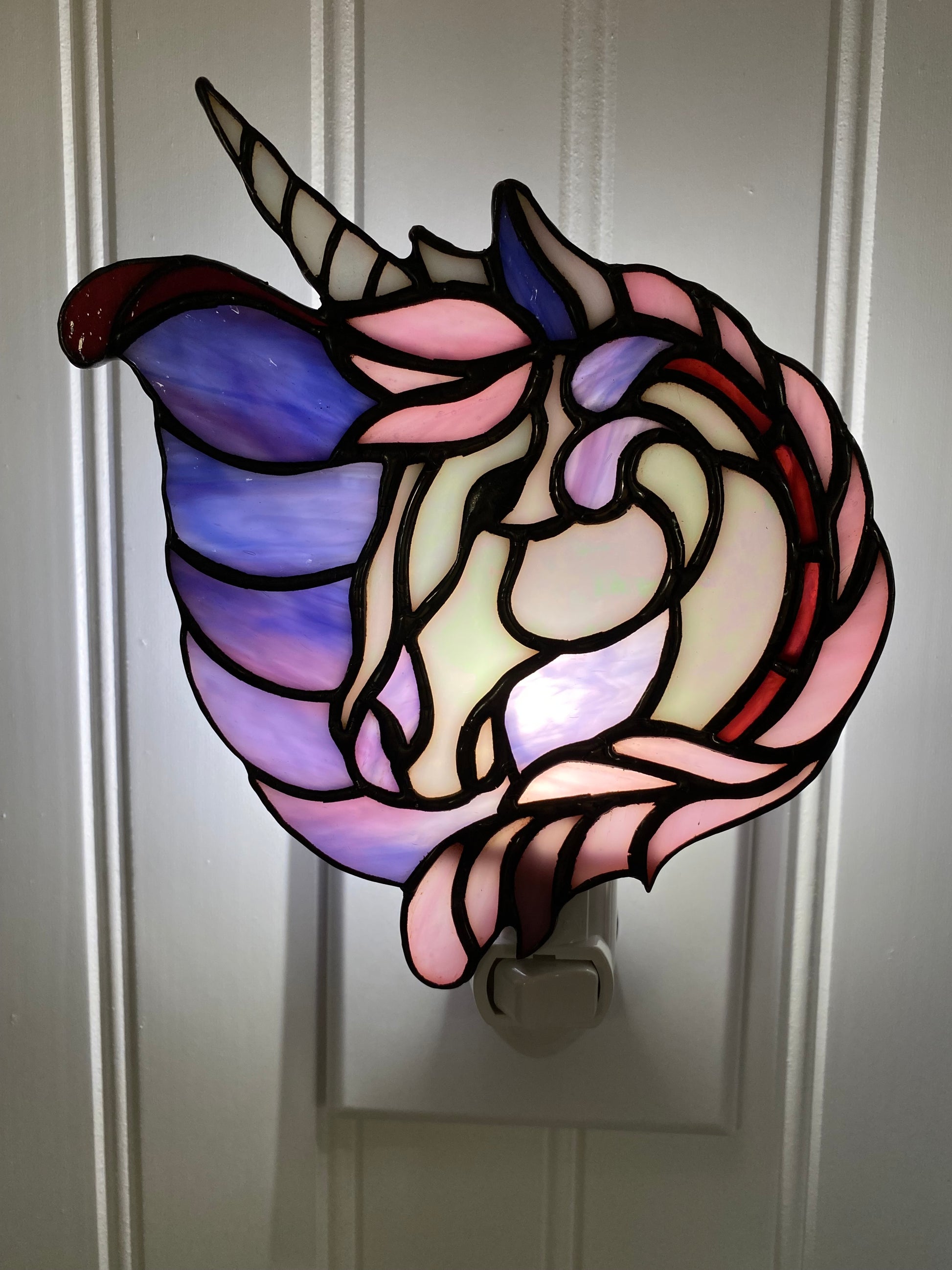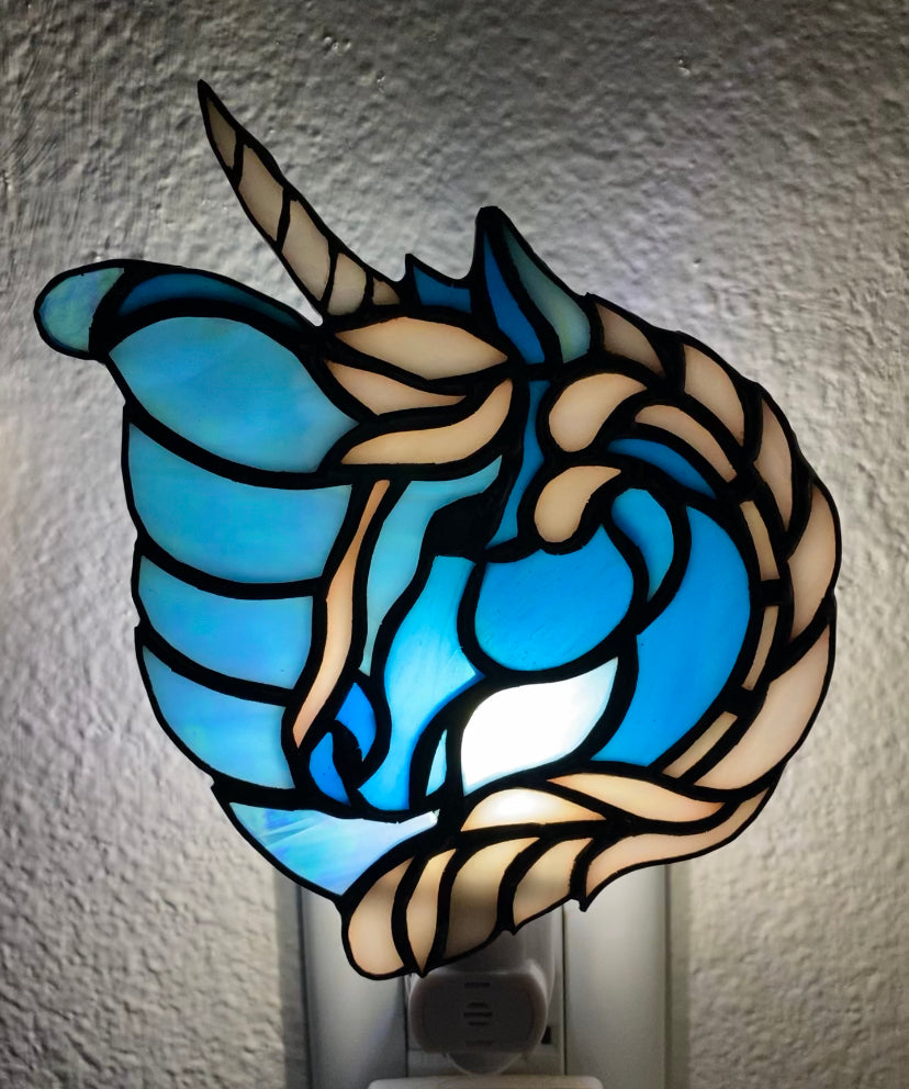 Adapted to a nightlight size from a photo of a larger piece, this fanciful and mystical creature brings color and magic to any space. Color choices are virtually unlimited. Simply use the Preorder Form to designate your customizations.