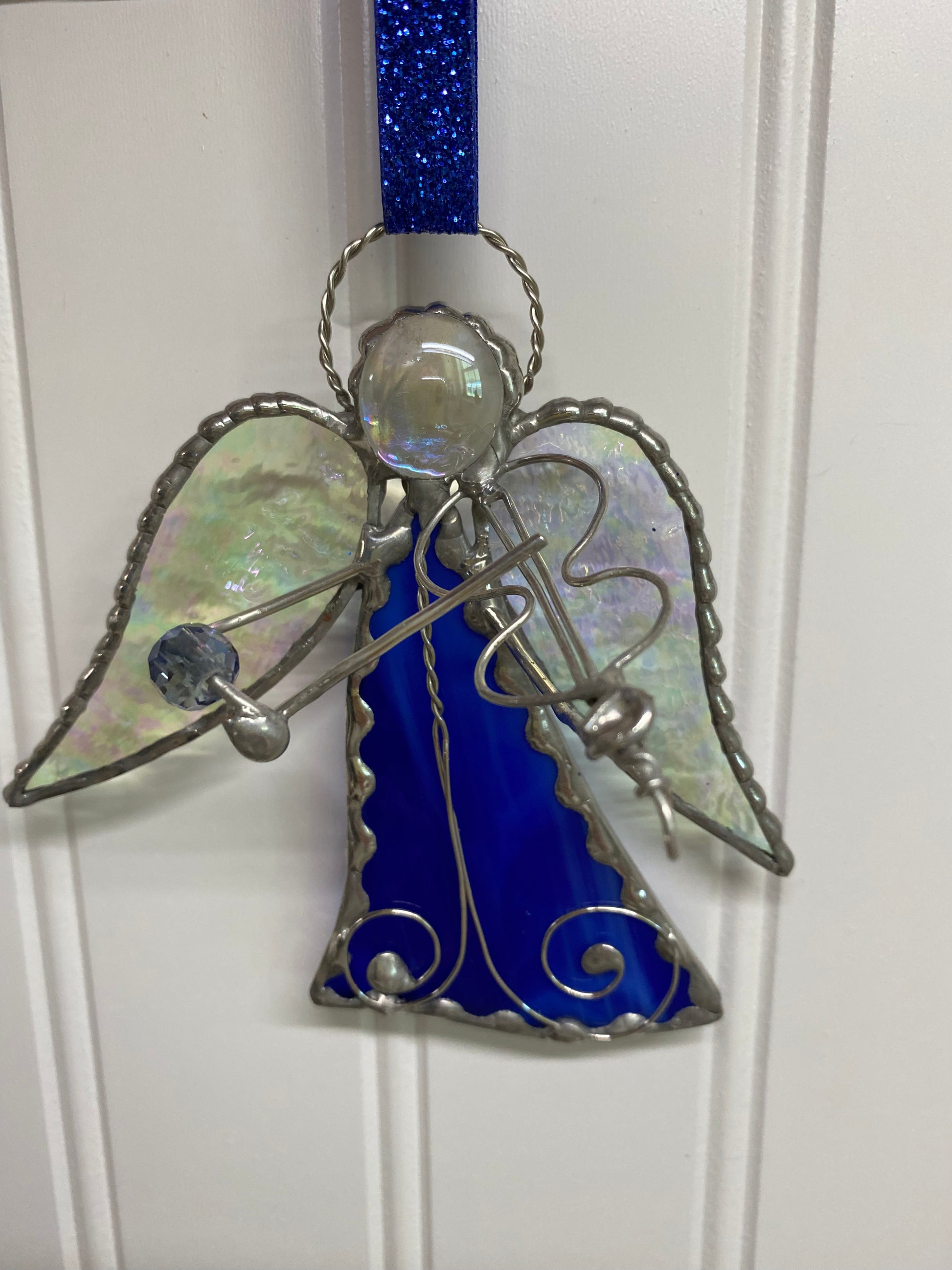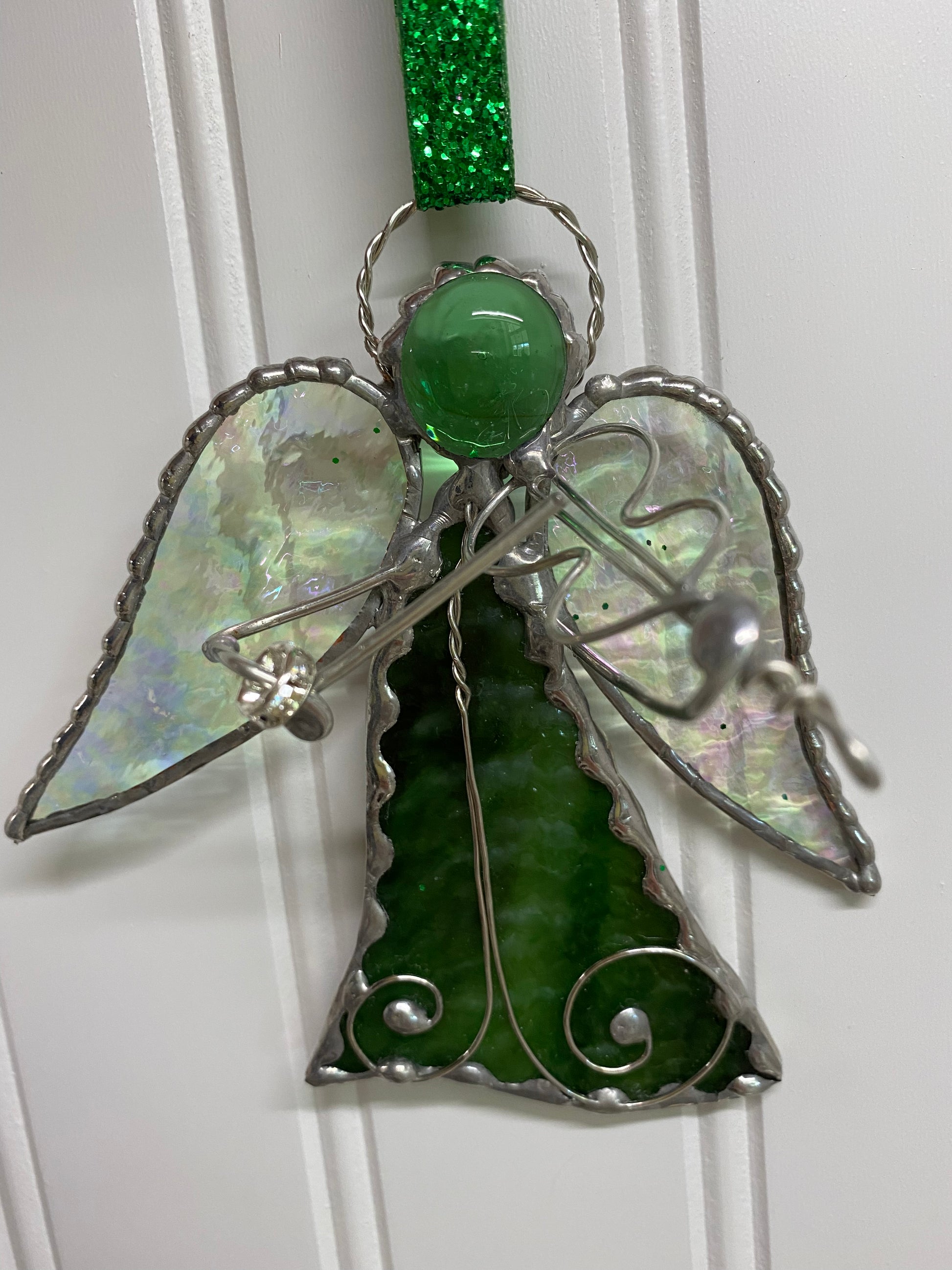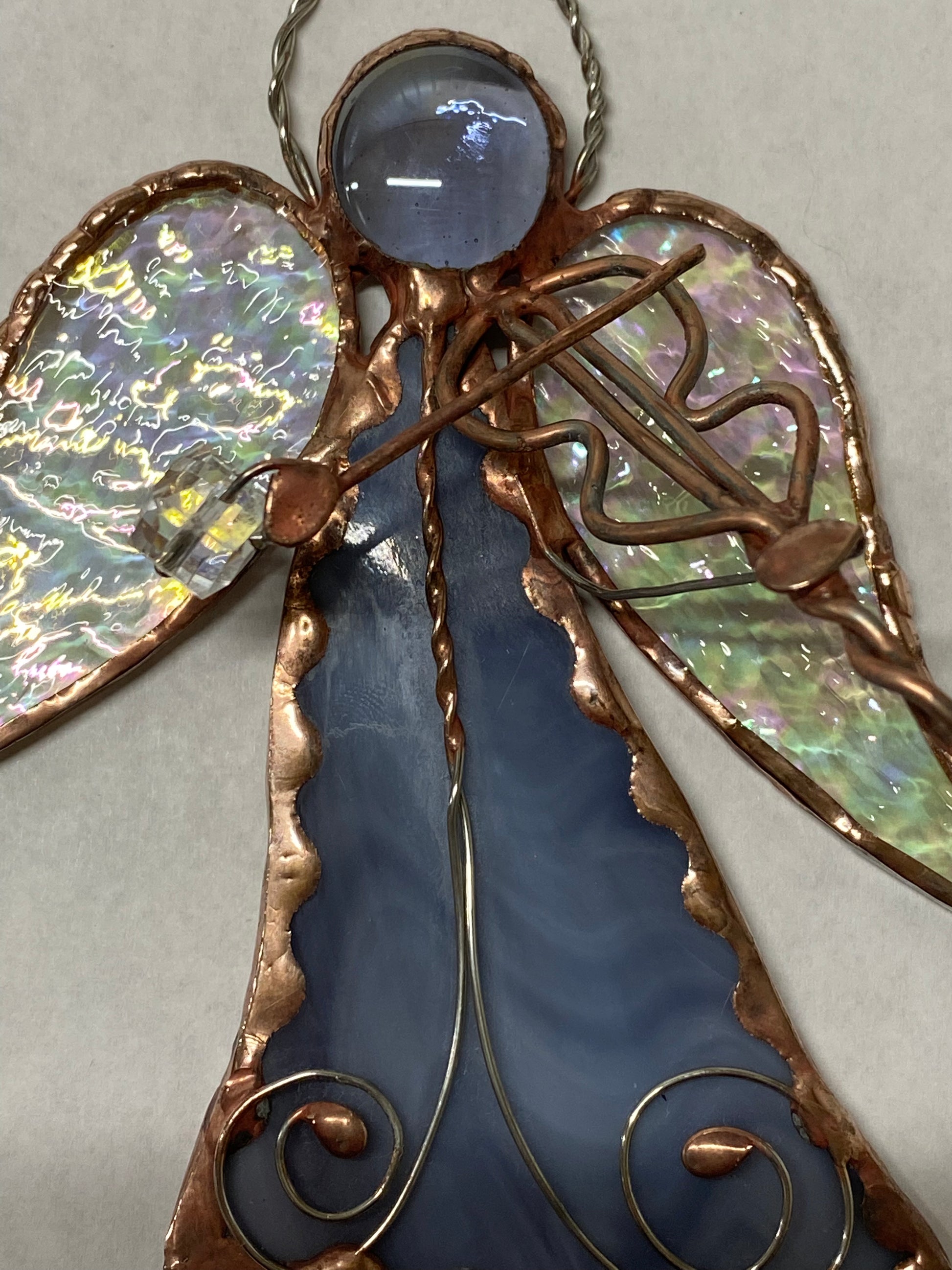 Each angel ornament is made with pieces of clear iridized glass for the wings, a 3/4” glass nugget for the head, and a single piece of glass (your choice of color from stock) for the body. Constructed using Tiffany’s foil method, a scalloped foil is used on the body for additional embellishment. Most of the angels remain with polished silver solder, but patina can be applied for a copper or black outline. Decorative solder techniques are used to create the hair and to embellish the wings. 14 gauge pre-tinned copper wire is used for the arms and the bow. There is a bead on one arm for a bracelet. Finally, 16 gauge wire is used to create the halo and to embellish the robe. There is a variety of colored ribbon and string available to choose from for hanging your angel. This particular angel features a viola which is crafted from a single long piece of 14 gauge pre-tinned copper wire.