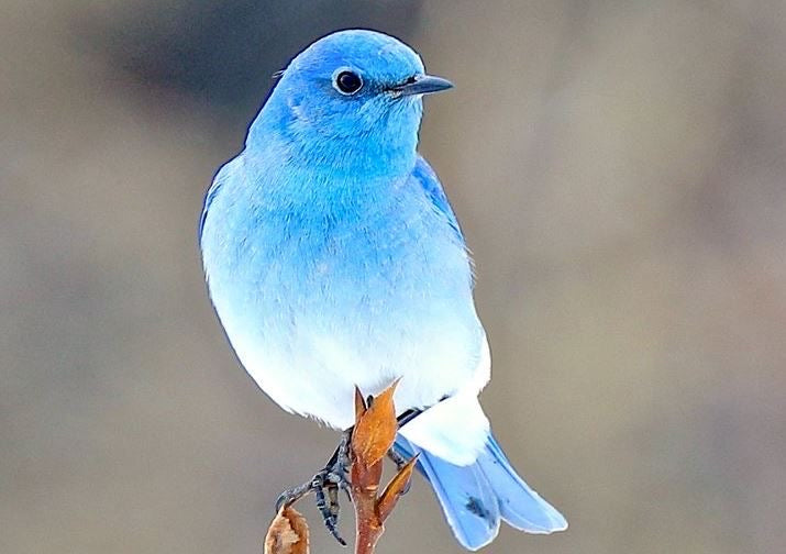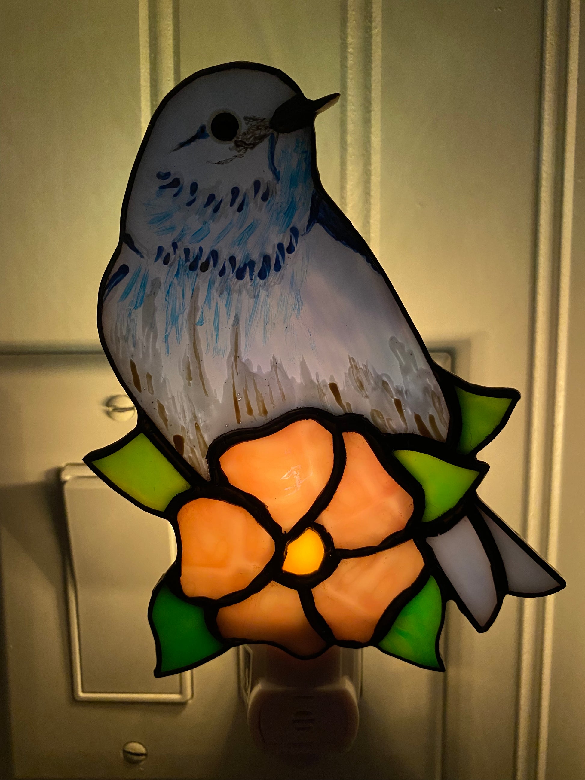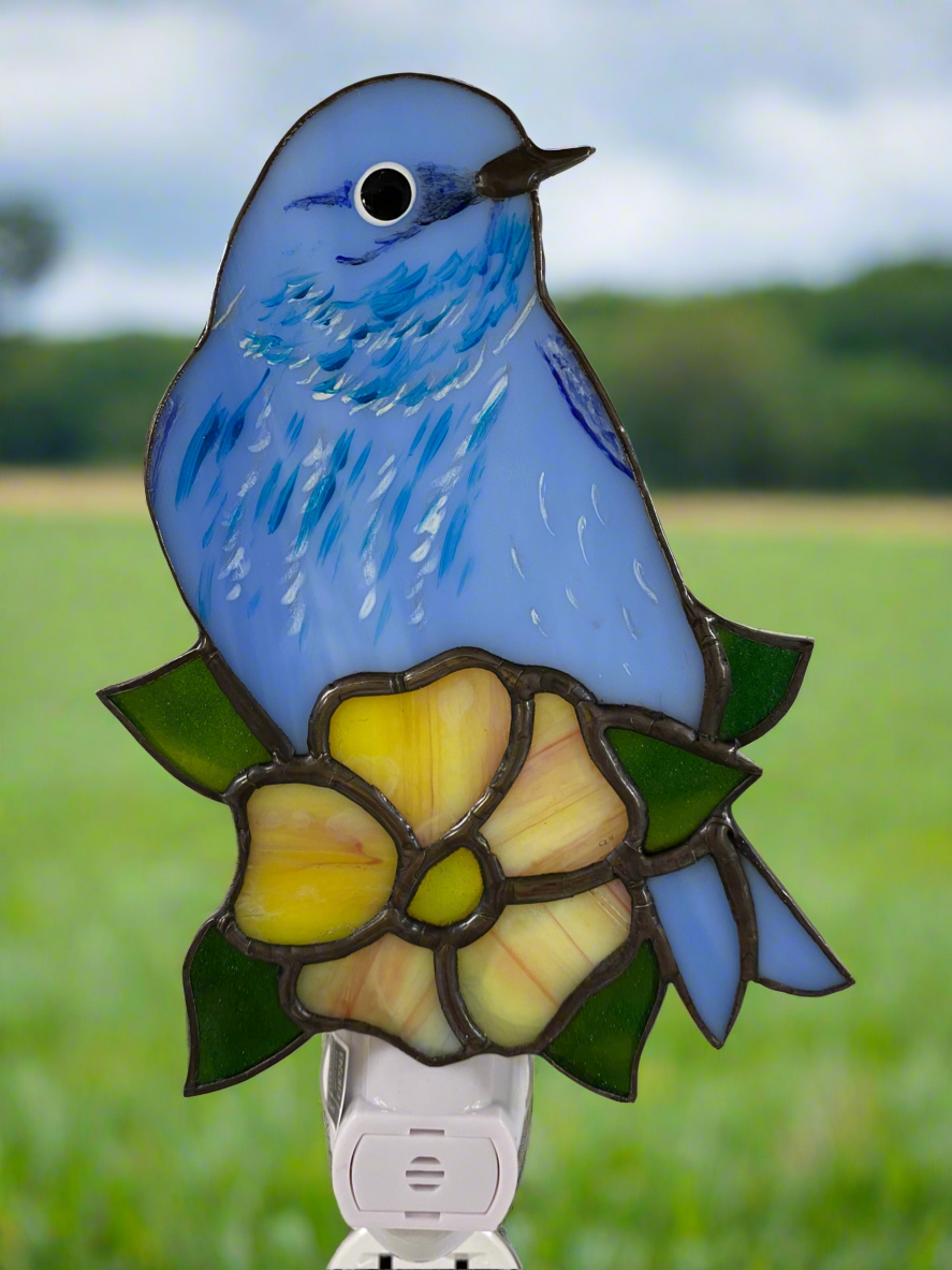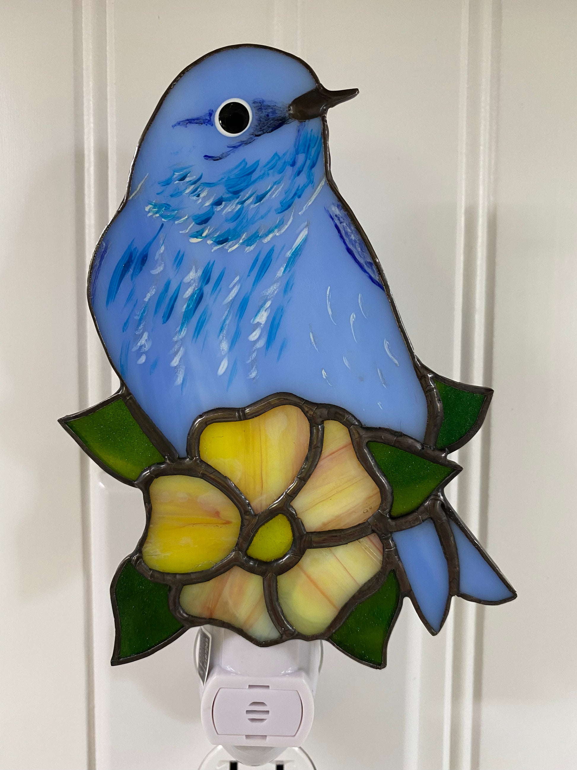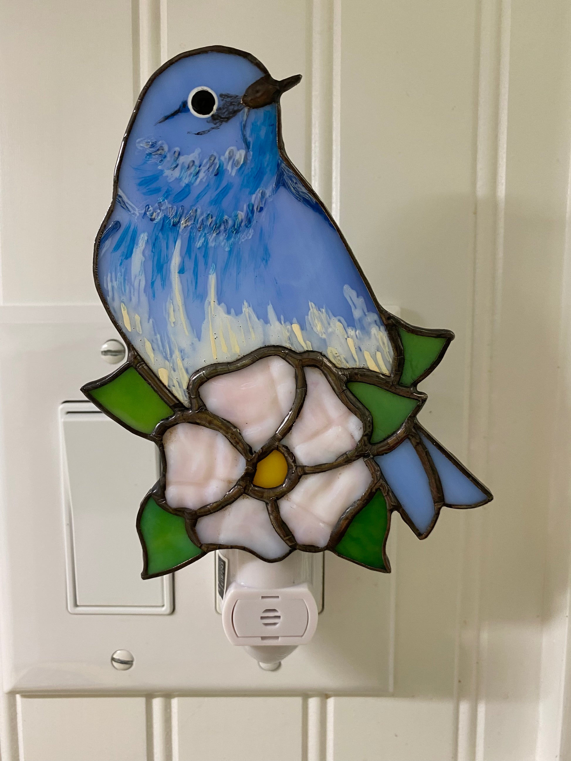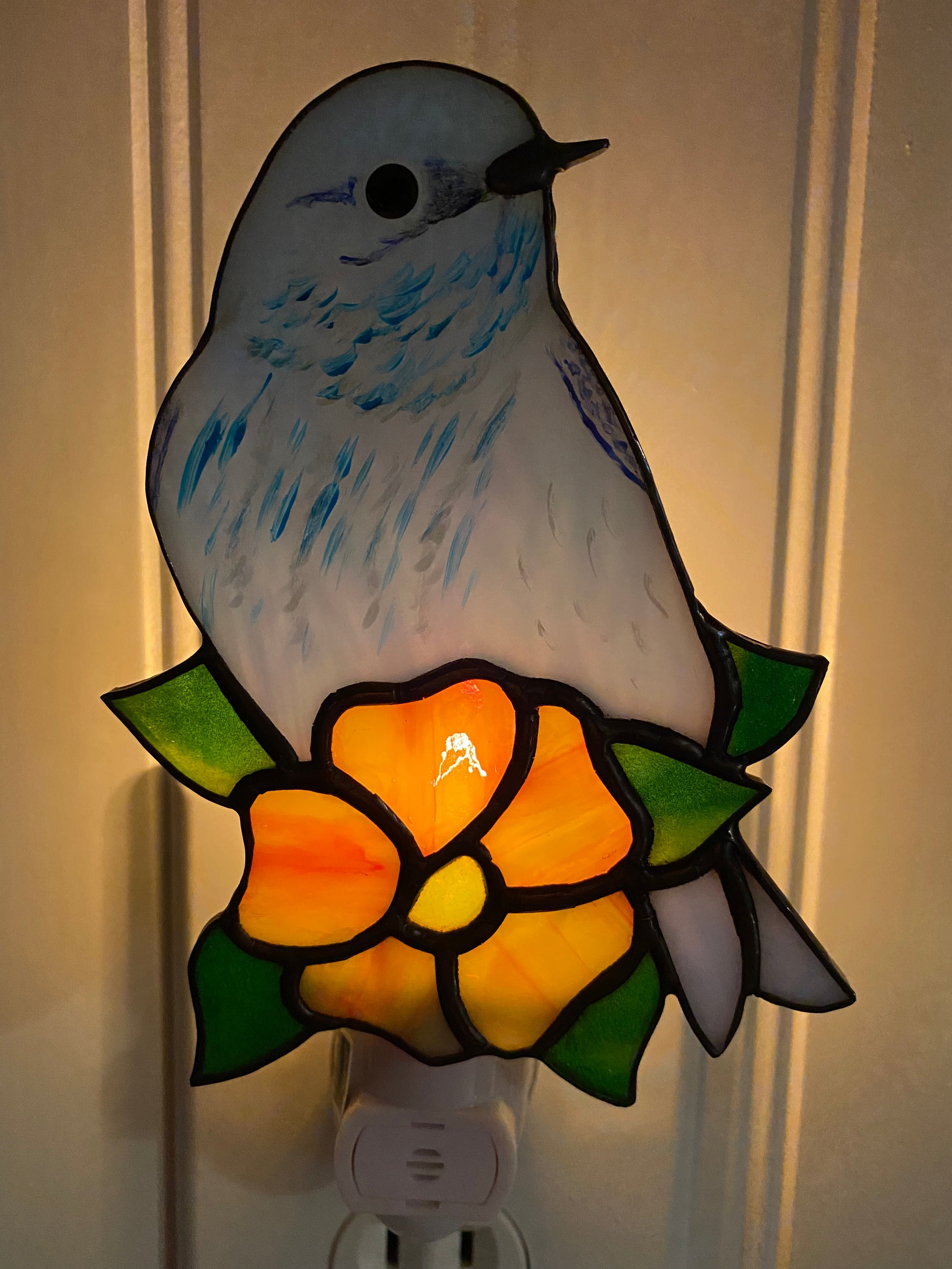 This delicate little western bluebird hand painted and created with blue glass selections from Wissmach and Spectrum perches lightly in a leafy blossom made from Youghiogheny and Spectrum glass.